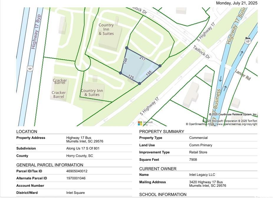 This is more than just real estate; this property has a long-established business located directly on Hwy 17 Business in the heart of Murrells Inlet. Just minutes away from the Ocean and the Marsh, and near a revitalizing mall. This property enjoys year-round traffic from both locals and tourists. With a dedicated curb cut from Tadlock Drive, visibility and accessibility are built in. Whether you're a property investor or looking to start your own business or relocate your current business, this is your chance to own a high-performing location with built-in local recognition and growth potential. Don't let this great, rare opportunity pass you by. This is Building and Land only.