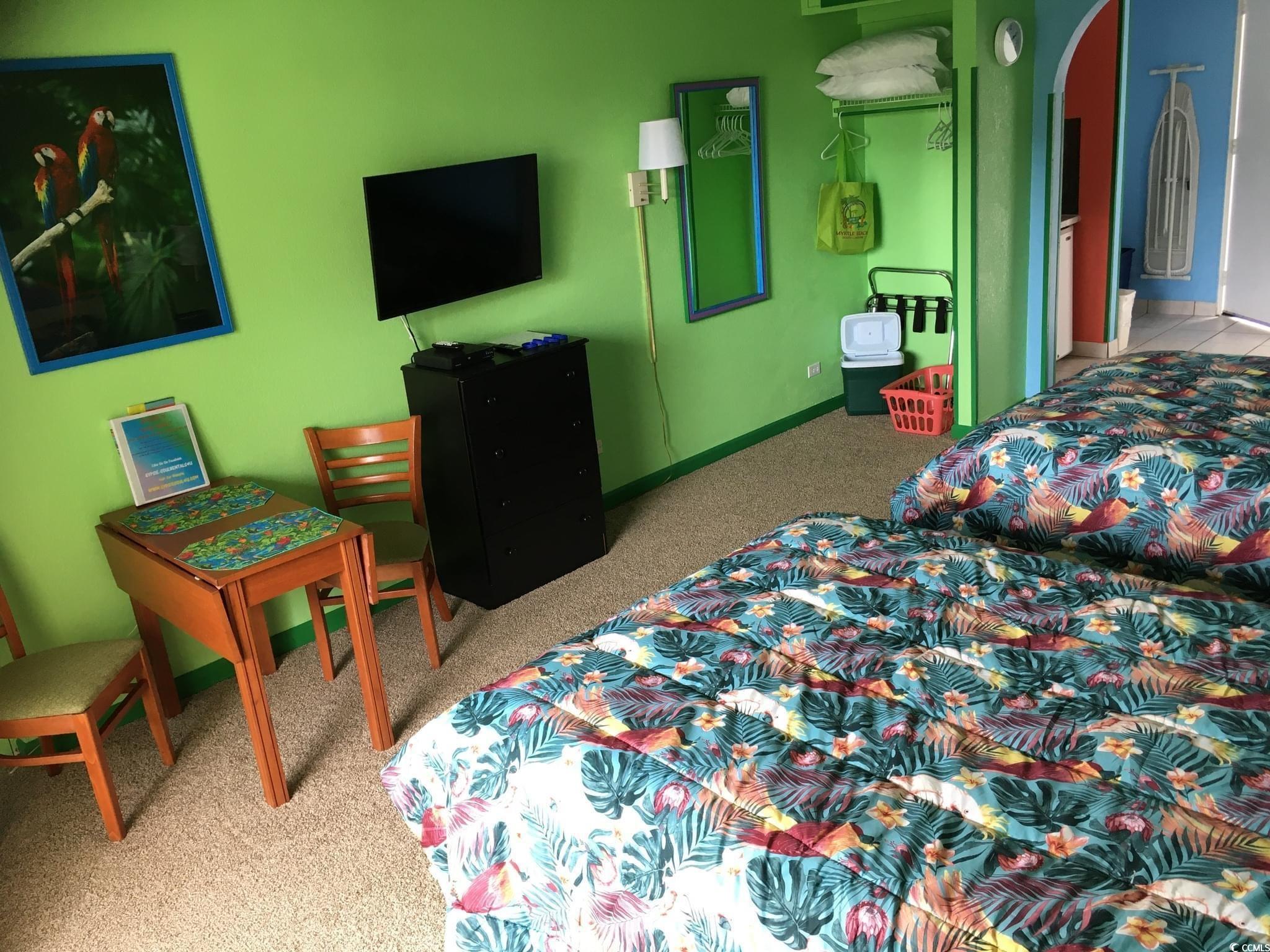 St. John's Inn has been fully renovated! Welcome to the 'Jungle Room,' a vibrant, turnkey second-floor condo ready for immediate living or renting. Located on the quiet north end of Myrtle Beach, its just steps from the beach, where you can enjoy sunrises or a relaxing day by the ocean. The serene courtyard features an Olympic-sized pool and year-round hot tub. The unit includes two queen beds, a smart TV, closet, dresser, table with lamps, and a vacuum. The kitchenette has a sink, fridge, microwave, air fryer, toaster oven, coffee maker, blender, and single burner. Theres also extra storage above the closet, and the jungle-themed artwork is optional. Enjoy your private east-facing balcony with morning sun views over the peaceful courtyard. The building offers coin-operated laundry, an elevator, and ramp access. Conveniently located near groceries, gas stations, shops, restaurants, and attractions, this condo is a prime spot!
