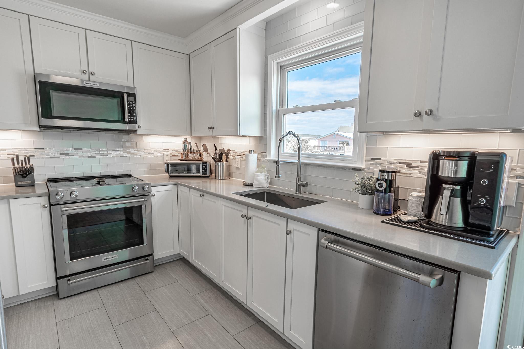 Welcome to Paradise Palms, a beautifully elevated channel-front beach home in the sought-after Cherry Grove area. Just a short walk or golf cart ride to the beach. This spacious four-bedroom, three-and-a-half-bath home features hurricane-rated windows and a blend of elegant tile and hardwood flooring throughout. Each bedroom is equipped with recessed lighting and ceiling fans for added comfort. Two bedrooms feature private en-suite baths with modern vanities and showers, while the remaining two share a convenient Jack & Jill-style bathroom. Vaulted ceilings in the living and dining areas enhance the open and airy feel, complemented by ceiling fans for year-round comfort. The gourmet kitchen is outfitted with premium KitchenAid stainless steel appliances, quartz countertops, under-cabinet lighting, stylish backsplash, and a functional breakfast bar. Step out the back door to a spacious balcony overlooking the channel, perfect for relaxing or entertaining, complete with a large seating area and exterior service elevator. The ground level is an entertainers dream, featuring a covered seven-person hot tub beneath a gazebo, a cozy fire pit, an outdoor bar, and a large dining area with a grill. Enjoy fishing from the private dock or take your boat straight out to the ocean. Additional amenities under the home include an outdoor shower, ample storage areas, a spacious garage with an ice machine, and a laundry room with washer, dryer, sink, and private water closet. This property is ideal as a high-income vacation rental or a fantastic primary or secondary residence. There is no HOA, and both short- and long-term rentals are permitted. Located just minutes from shopping, dining, and entertainment, Paradise Palms offers the perfect mix of luxury and convenience. Square footage is approximate; buyers are encouraged to verify.
