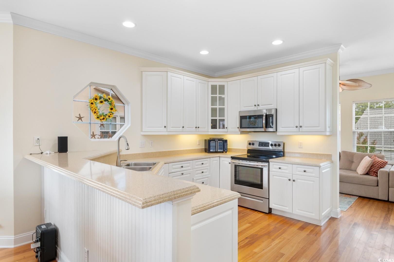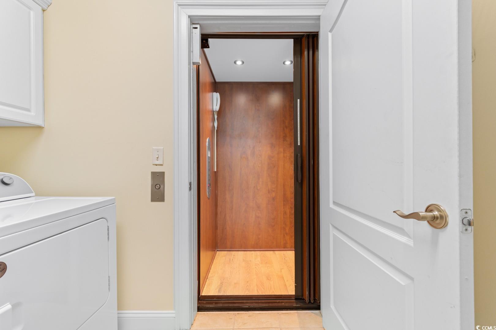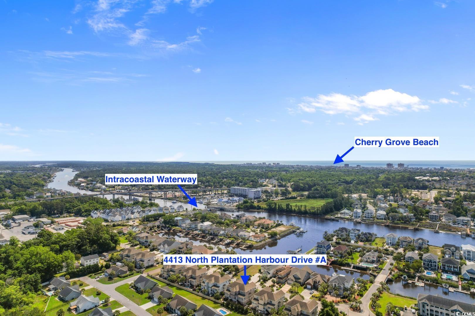 Enjoy the stunning Intracoastal Waterway (ICW) view from the front balcony or relax in your private backyard courtyard oasis within minutes of Cherry Grove Beach. This tri-level home offers ELEVATOR ACCESS to EACH FLOOR for your convenience. You may enter the main level of the home from the front veranda porch or take the elevator from the lower level. Upon entering, you will immediately notice the bright, spacious interior offering an inviting living room with custom accent wall and built-in electric fireplace, white kitchen with solid surface countertops and stainless-steel appliances, dining area, large primary bedroom with en-suite bath with walk-in custom shower and double vanity, a Carolina room that overlooks the private courtyard, and powder room for guests. Upstairs you will find a loft that may be used for a sitting area and/or office space with access to a second porch. On this level, there is a bedroom suite with private bath, another full bathroom with access from loft and laundry room with cabinets. The lower level of the home has an oversized garage and a recreation room with mini-split. Additional features of the home include hardwood flooring throughout main the living areas and stairs, plantation shutters, and ceiling fans. The courtyard patio space is ready to make your own private outdoor oasis.