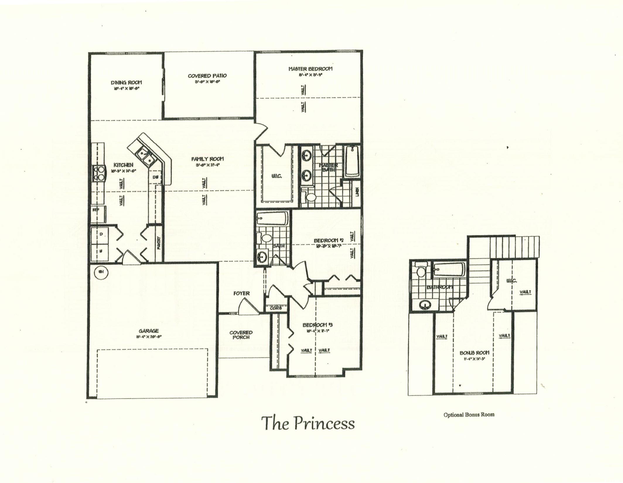 Padgett Lane is a new community located near downtown Conway, SC, offers this Princess plan with added bedroom and bathroom on second floor. The property includes a completed 2-car garage, shaker cabinets, and granite countertops in the kitchen, laminate flooring in living room and ceramic tile in bathrooms and kitchen. *This house is to be built, anticipating completion in March 2026. *All measurements are approximate. Buyers are responsible for verification. *Photos are of a similar house, used for demonstration purposes only, finishes and details may vary. Stone front is NOT included.