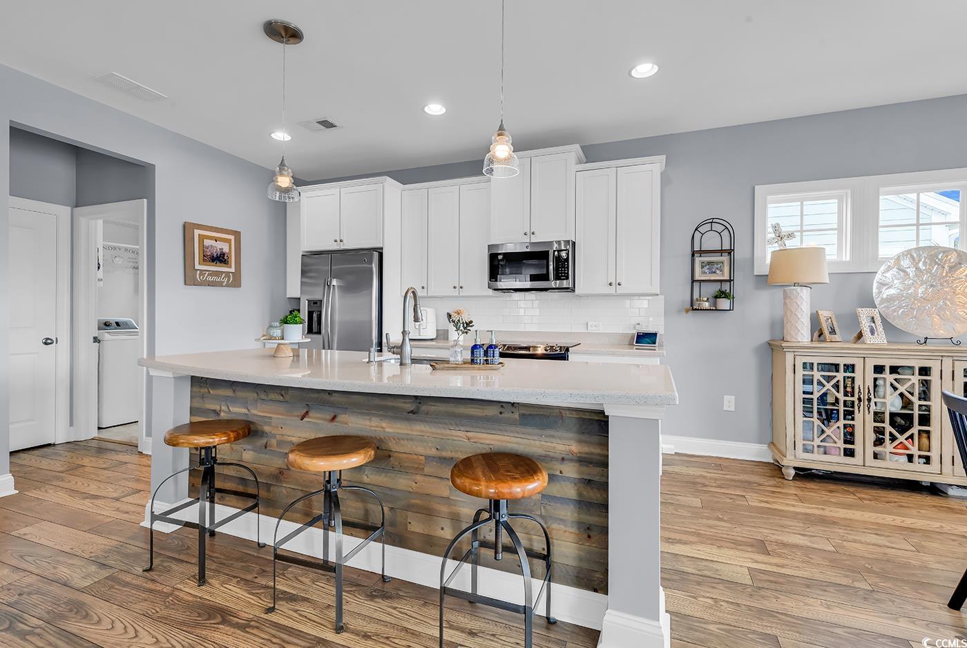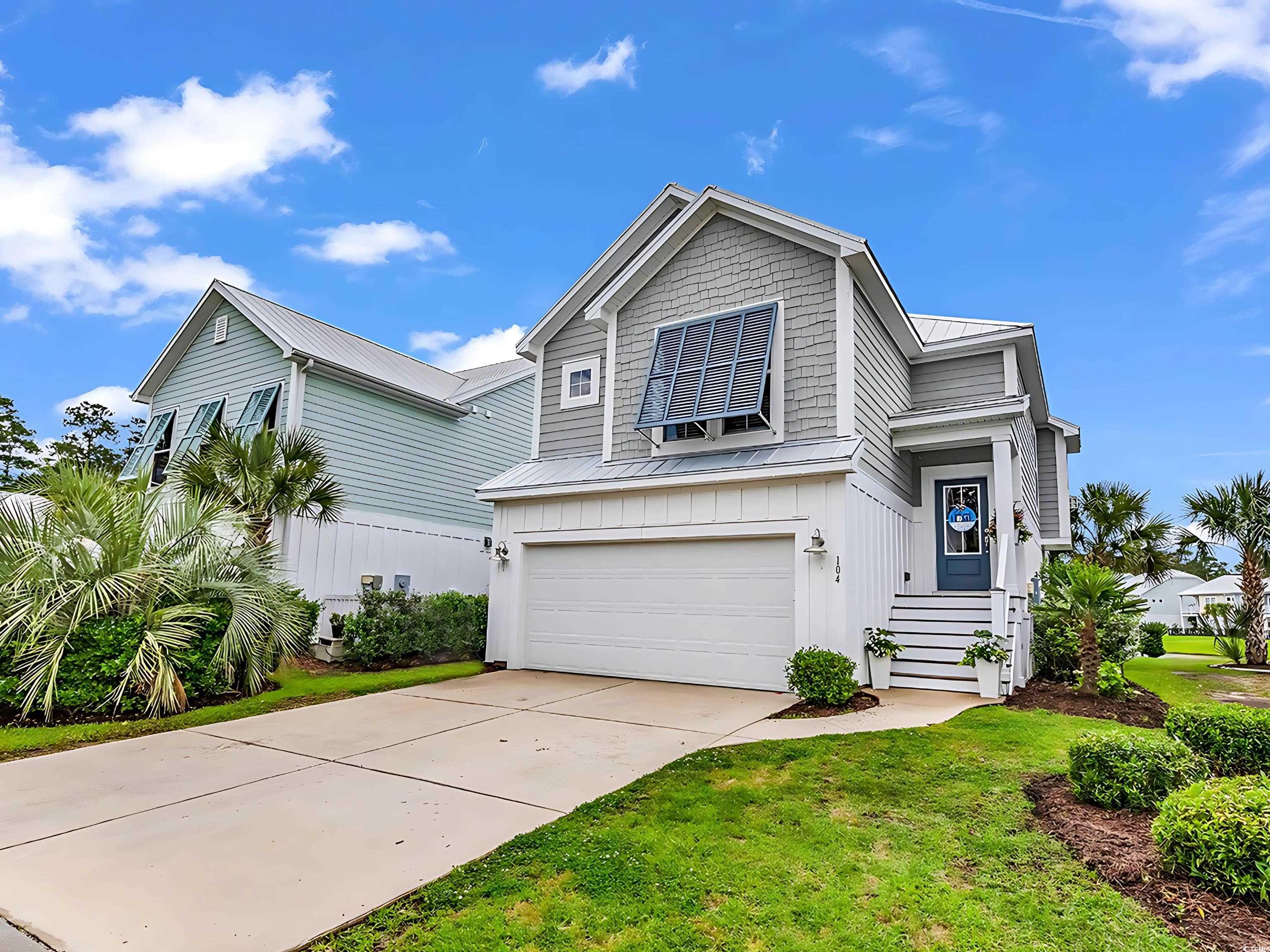 Welcome to Your Beach-Style Dream in Wilderness Pointe This beautiful split-level home in Wilderness Pointe at Prince Creek community combines coastal charm with modern living. The distinctive metal roof, Bahama shutters, and two-car garage create that sought-after raised beach house aesthetic we all love. Enter to discover a thoughtfully designed floor plan. Upstairs features an open concept living space with a spacious living room complete with a stylish tray ceiling and cozy gas fireplace, dining area, and kitchen. The kitchen showcases tall white shaker cabinetry, a large island with sleek countertops and stainless steel appliances. The upstairs primary bedroom offers a private oasis with its own bathroom featuring a tiled walk-in shower, a double vanity with custom ship lap accent wall, and a spacious walk-in closet. Downstairs, you'll find two additional bedrooms, a full bathroom, and a second living area perfect for movie nights or as a quiet retreat for guests. Both levels offer outdoor areas for enjoying those perfect South Carolina evenings, with access from each floor. The community amenities include two pools, pickleball, tennis, and trails. Located near shopping, dining, and just a quick ride to the beach, this immaculate home offers the ideal balance of comfort and coastal living in the prestigious St. James school district.