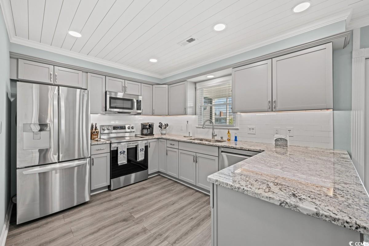 Welcome to your dream coastal retreat in the heart of Cherry Grove, one of North Myrtle Beachs most desirable neighborhoods. This beautifully renovated 3-bedroom, 2-bathroom home was completely updated in 2021inside and out. Step inside to find an airy, modern interior featuring luxury vinyl plank flooring, fresh paint, beadboard ceilings, and a bright open layout. The kitchen is a showstopper with granite countertops, brand-new cabinetry, and stainless steel appliances. Both bathrooms have been upgraded with custom-tiled walk-in showers and contemporary vanities. Every major system has been replaced: roof, windows, siding, HVAC, ductwork, and even the decking and railingsgiving you peace of mind and serious curb appeal. Out back, enjoy your private dock on the channelperfect for launching a kayak or relaxing in a hammock while the breeze rolls in. Just blocks from the beach, this home offers the best of both waterfront and ocean-close living. The ground level includes an outdoor shower, washer/dryer, storage area, and plenty of space for parking and entertaining. Whether you're looking for a full-time beach escape or a high-performing investment property, this one checks every box. Dont waitschedule your private showing today!