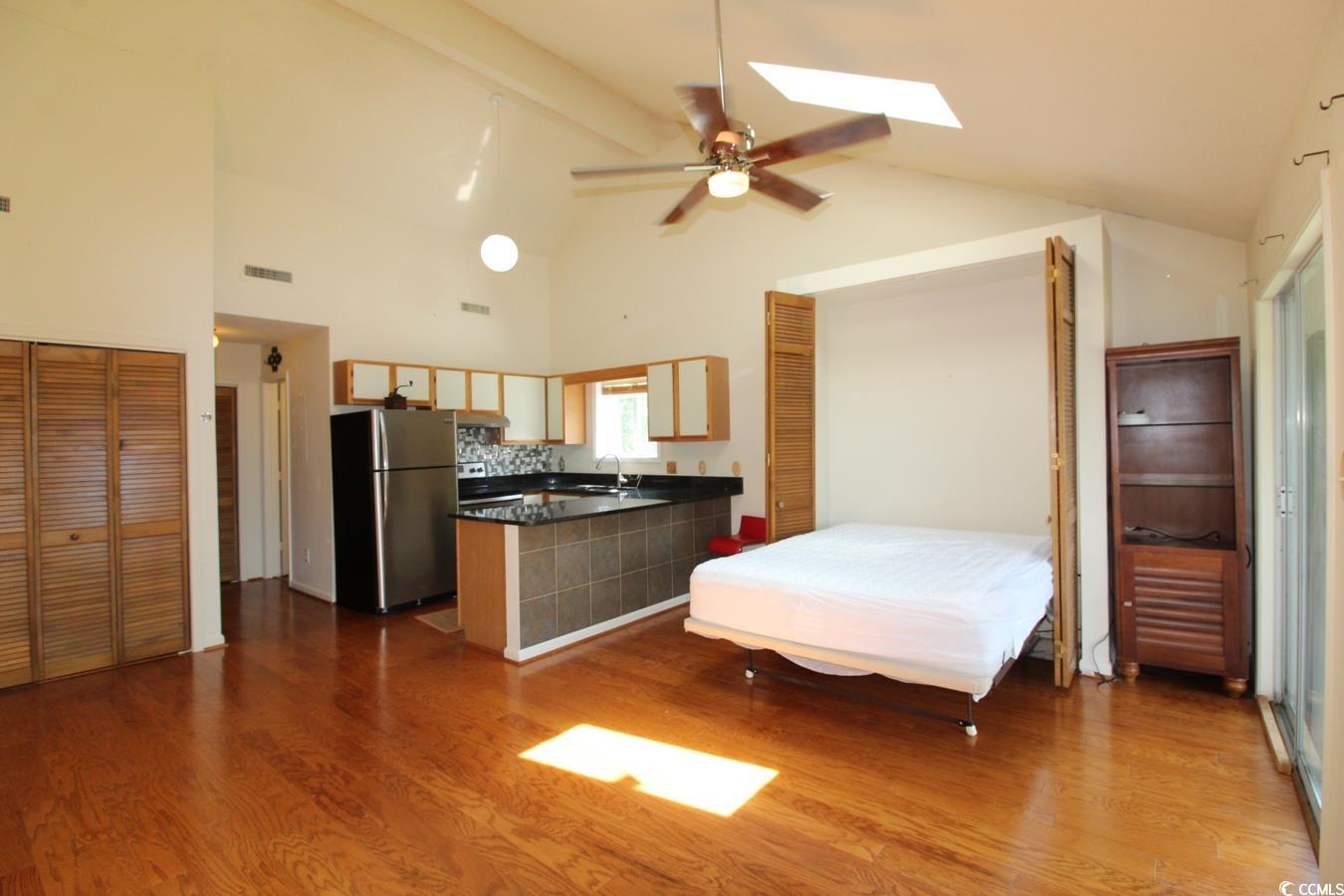 Priced to sell. This top floor, end unit has extra windows & two new skylights that allow for plenty of natural light. This studio condominium is located in the Fairwood Lakes III section of Island Green. The interior features natural hardwood floating floors & vaulted ceiling. Recent kitchen renovations include stainless steel appliances, flat top stove & granite countertops, tile counter kick wall. The kitchen also has a window over the sink, new stainless-steel sink with modern faucet and new backsplash. Sleeping accommodations are facilitated with a Murphy Bed. Newer lighting fixtures throughout include an extra-large remote controlled ceiling fan. There is a large, covered porch (17x7.5) with carpeting that enjoys extra privacy with this being a top-floor, end unit. New roof installed on the building in August 2024. HOA dues include water/sewer, security, basic cable and internet. Fairwood Lakes III is conveniently close to all the Coastal Carolinas has to offer, without being in the middle of all the traffic and crowds.