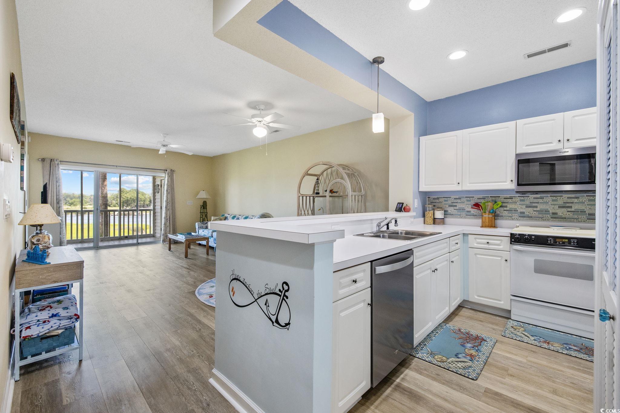 MOTIVATED SELLER! Enjoy breathtaking views all around you from the Intracoastal Waterway to the Eastport Golf Course, in this beautifully updated 2-bedroom, 2-bath condo at The Moorings at Eastport. Sold fully furnished and move in ready, this bright and airy unit features durable LVP flooring and elegant plantation shutters throughout. The kitchen offers stainless steel appliances, a breakfast bar, ample cabinetry, and a small pantry space, opening seamlessly into the dining and living room combo. Large sliders lead to a screened-in balcony with tile flooring, a sunshade, and a storage closet, perfect for soaking in panoramic views of the waterway. The views are simply stunning from the kitchen, living and dining areas, and the primary suite. The spacious primary bedroom includes an ensuite bath with a shower and walk-in closet, while the second bedroom is adjacent to a full bathroom with a tub. A dedicated laundry closet adds convenience. Residents enjoy access to two pools, one exclusive to The Moorings and another located near the Eastport golf course clubhouse. The community also offers peaceful walking and biking paths and the opportunity to take in both sunrise and full moon views right from your back porch. Dont miss your chance to own this slice of coastal paradise!