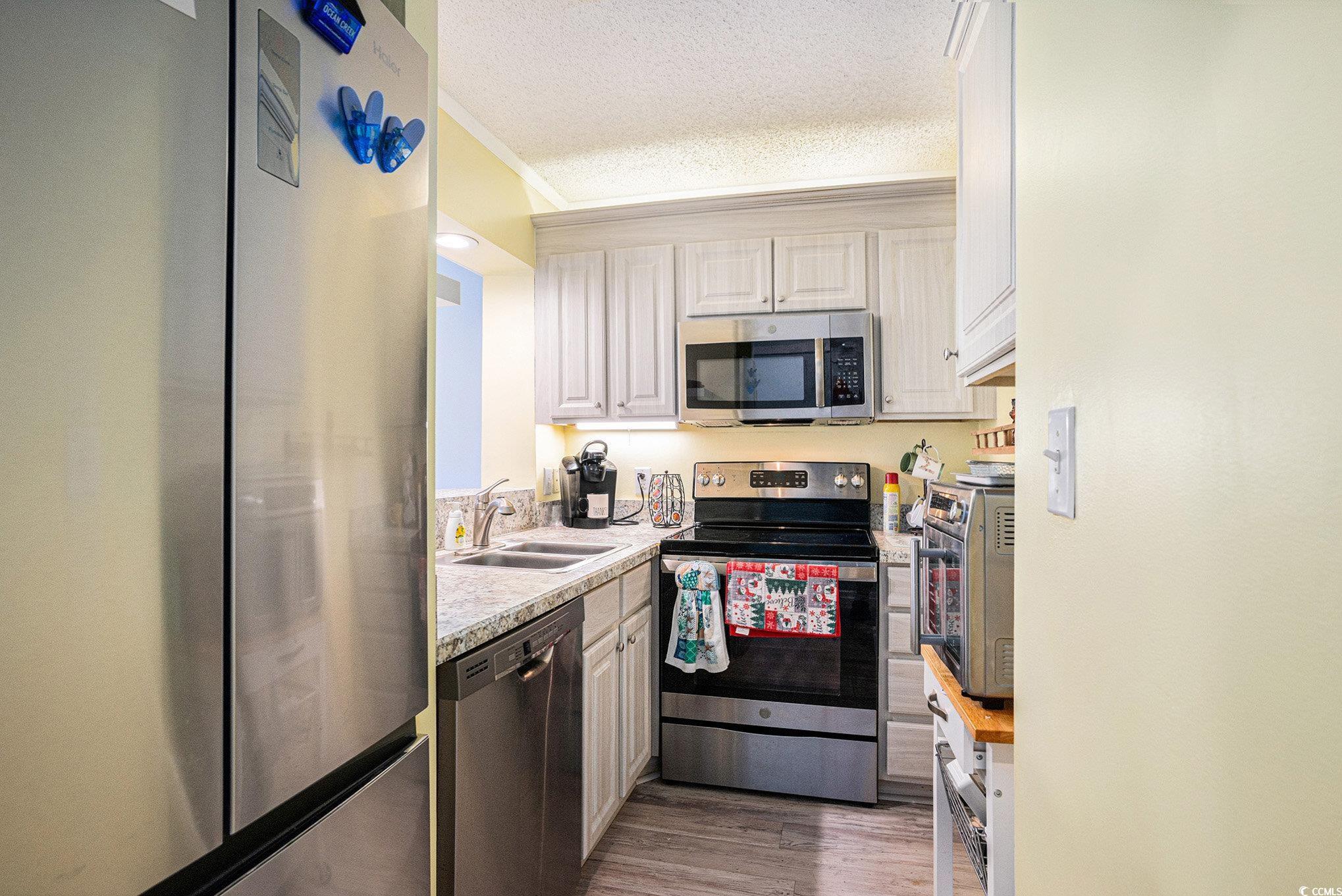 This is a beautifully updated 1-bedroom, 1.5-bath end unit in Ocean Creek Resort. Located on the 3rd floor with elevator access, this spacious condo features an open layout with stylish and durable LVP flooring, perfect for coastal living. The kitchen offers modern appliances and ample cabinetry, while both bathrooms have been fully renovated with elegant tilework and tasteful finishes. Enjoy peaceful views and abundant natural light from your private screened porch, surrounded by lush landscaping. Ideal as a primary home, vacation escape, or investment opportunity. Nestled in a gated, 57-acre resort community, you're just a short walk to the beach and have access to top-tier amenities: indoor/outdoor pools, a private oceanfront beach club with dining, tennis courts, a fitness center, and scenic walking trails.