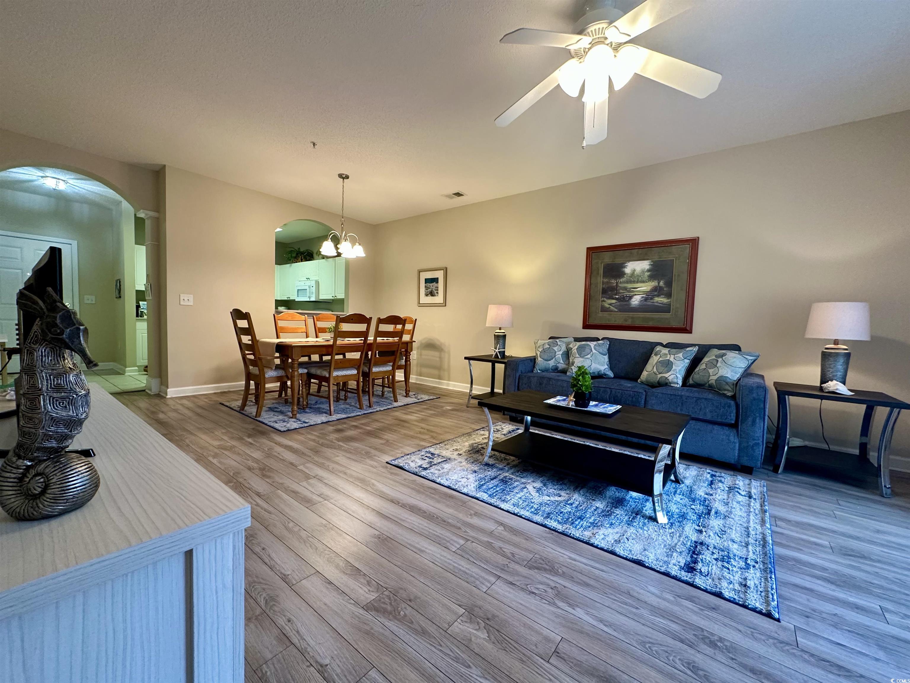 Golf enthusiasts and Beach lover getaway! An exceptional place to enjoy part time or full time that can also produce income! Enjoy the tranquil pond view in this terrific 2 bedroom and 2 bath fully furnished condo that can sleep 6 in the highly desirable and gated Barefoot Resort River Crossing community. Brand New sleeper sofa, accent tables, tv console, area rugs and dining light fixture. Plus, a Newer HVAC system. Light and bright kitchen with pretty quartz counters, brushed nickel hardware, newer appliances, under-mount stainless steel double sink, and fresh paint. The open concept living and dining areas with updated laminate floors offer easy entertaining and care. Low pile carpet and ceiling fans give comfort in the bedrooms. Both baths are inviting with modern light fixtures and neutral decor. A lifestyle like no other can be found here with access to 4 championship golf courses, 5 miles of live oak lined trails, a private beach cabana, multiple pools (including one overlooking the Intracoastal Waterway), on site restaurants, access to a deep water marina, near to Barefoot Landing for shopping, more dining and entertainment and a free seasonal shuttle right outside the community gate!