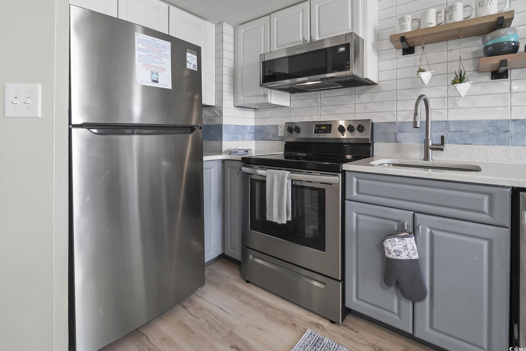 Welcome to Holiday Sands South! This beautifully updated 1-bedroom, 1-bath condo offers everything you need for the perfect coastal getaway or investment property. Thoughtfully designed, it features two custom vanities with quartz countertopsone inside the bathroom and one conveniently outside. The brand-new light LVP flooring flows seamlessly throughout the unit, creating a fresh, modern feel. The primary bedroom is plenty big for a king-size bed, walk-in closet, and large owners closet for extra storage. In the kitchen, youll find quartz countertops, a stylish tile backsplash, stainless steel appliances, pantry, and coastal-inspired finishes. Extra sleeping space comes from a tucked-away Murphy bed. Step onto your 10th-floor balcony, complete with Polywood captains chairs, and soak in the breathtaking ocean viewsperfect for morning coffee or afternoon cocktails. Holiday Sands South offers top-notch amenities, including an oceanfront pool, indoor pool, lazy river, hot tub, fitness center, and oceanfront caf. Youre just minutes from Myrtle Beach International Airport, The Market Common, and the iconic Myrtle Beach Boardwalk. HOA covers all utilities, exterior insurance, and H06 policy for peace of mind. Additional perks include an in-unit washer/dryer. Dont miss your chance to own a turn-key ocean-view retreat in one of the Grand Strands most desirable oceanfront resorts!