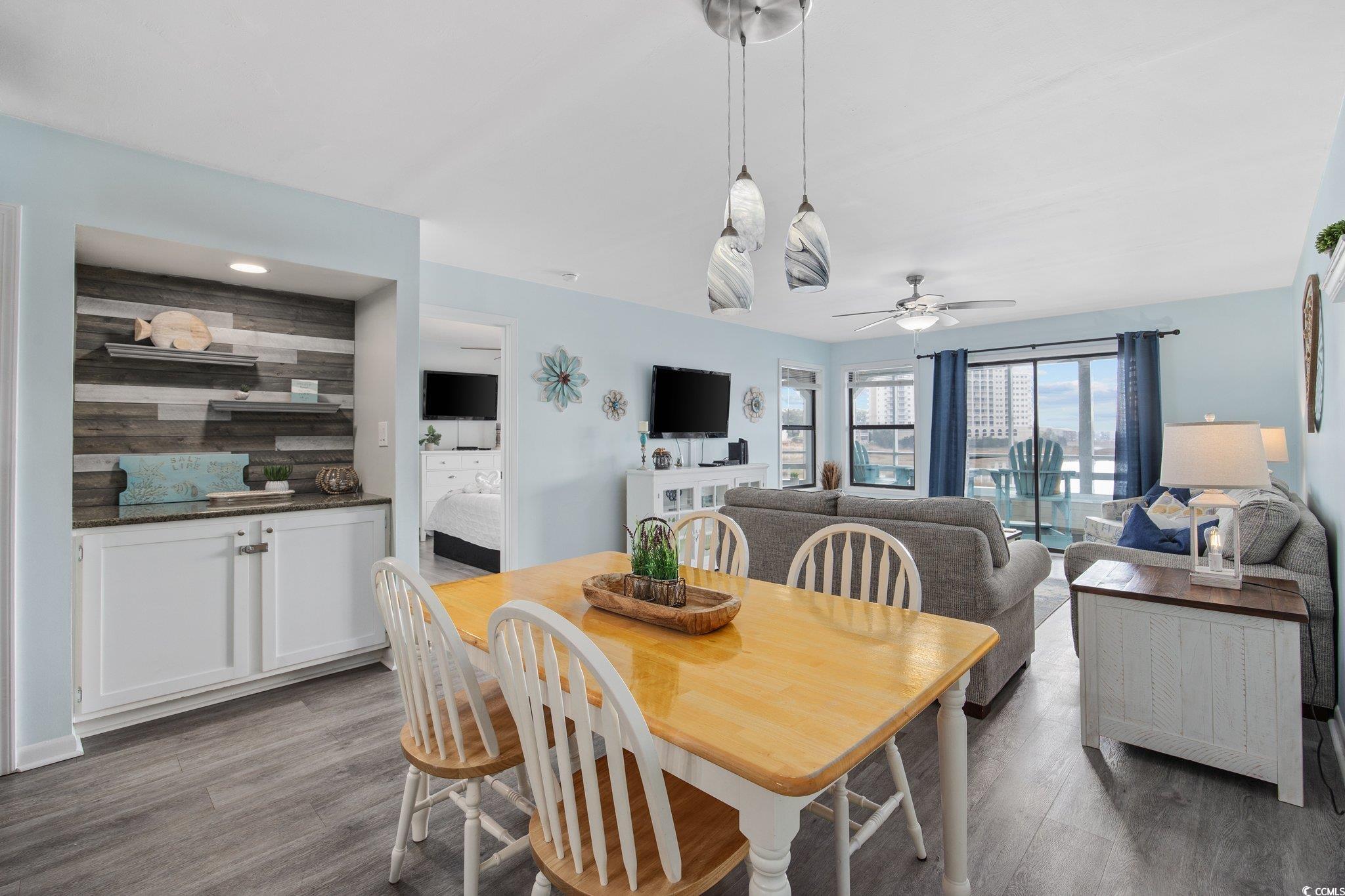 Experience ultimate relaxation in this beautifully furnished beachside retreat, showcasing stunning marsh views! Located in the desirable Dunes Pointe community near Shore Drive in Myrtle Beachs Arcadian area, this charming first-floor condo is perfect for vacations, short-term rentals, or year-round living. The interior features sleek LVP flooring, stainless steel appliances, fresh paint, and sophisticated accents, including pendant lighting and a glass backsplash. The kitchen is equipped with granite countertops and a convenient dry bar, while the master bathroom offers a luxurious walk-in shower with tile and pebble flooring. Both the living room and master bedroom open to an expansive screened in porch, providing serene views of the saltwater marsh, freshwater lake, and the prestigious Dunes Golf & Beach Club. Relax and enjoy the sights of egrets, wood storks, and eagles while savoring your morning coffee or evening wine. Just a short walk from the beach, Dunes Pointe offers fantastic amenities such as indoor and outdoor pools, hot tubs, tennis and pickleball courts, a clubhouse with a grill area, and a recreation room with a pool table. This pet-friendly and golf-cart-friendly community is designed for comfort and convenience. Ideally situated near Ocean Annies, Tanger Outlets, Barefoot Landing, and TONS more! Restaurants, Activities, and Shopping surround you in this prime location. Come check out this magnificent condo today!
