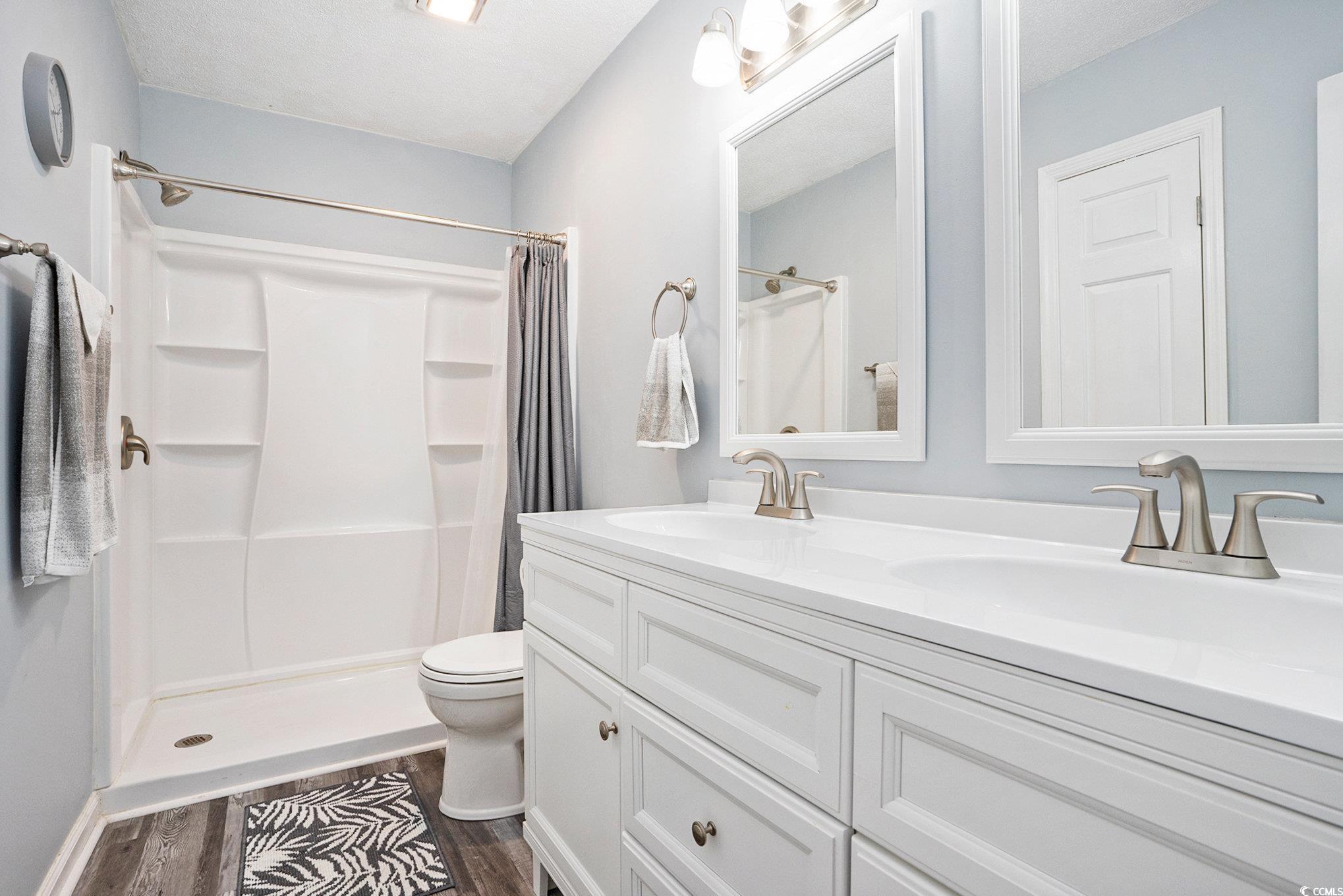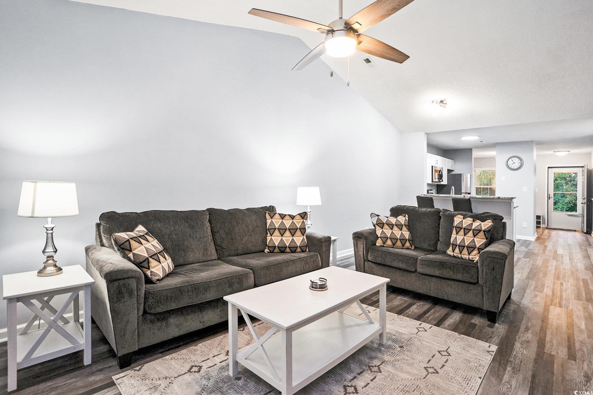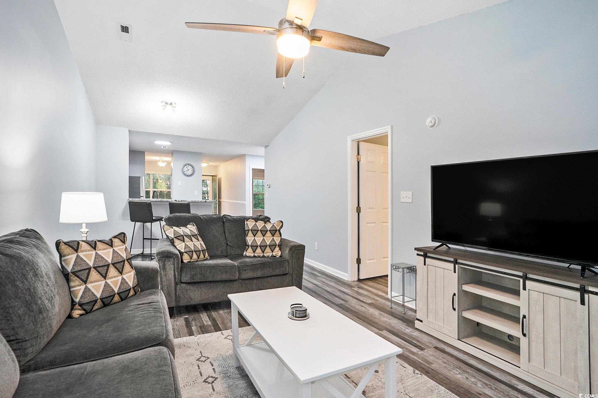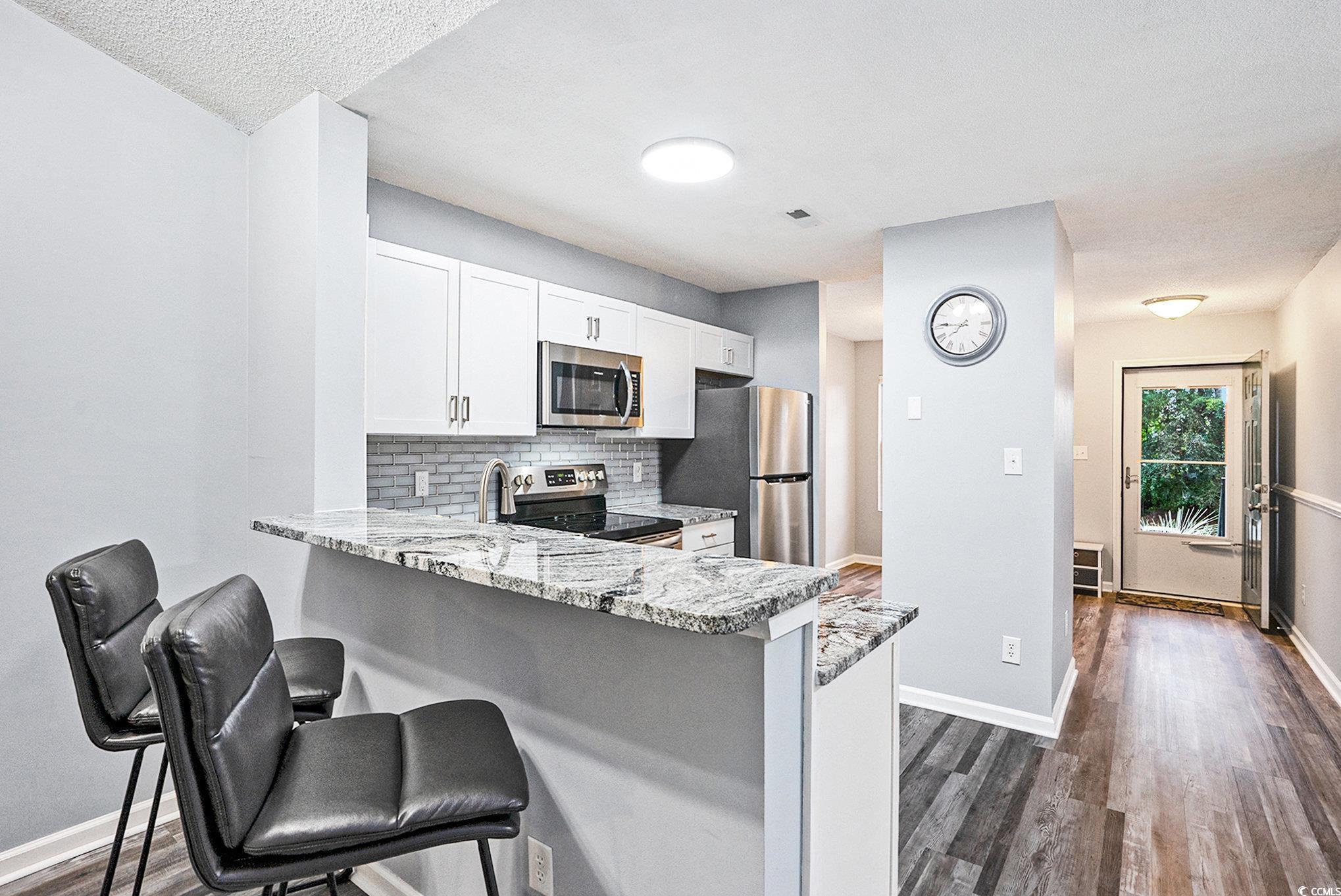 This beautifully updated 2 bedroom and 2 bath, second-floor condo features LVP flooring throughout, granite countertops, tiled backsplash, solid wood cabinets, and all-new stainless steel appliances. Two new sliding glass doors with built-in blinds open to a screened porch from the master and great room. Freshly painted throughout with new brushed nickel hardware, updated electrical, and new indoor/outdoor carpet at entry and porch. The laundry room includes a washer, dryer, and custom shelving. The master suite offers a walk-in shower, double vanity, comfort-height toilet, spacious walk-in closet with custom shelving, and a large linen closet. Perfect as a primary home, vacation getaway, or investment. Colonial Creek is a well-maintained community with easy access to beaches, shopping, dining, and healthcare along the Grand Strand.
