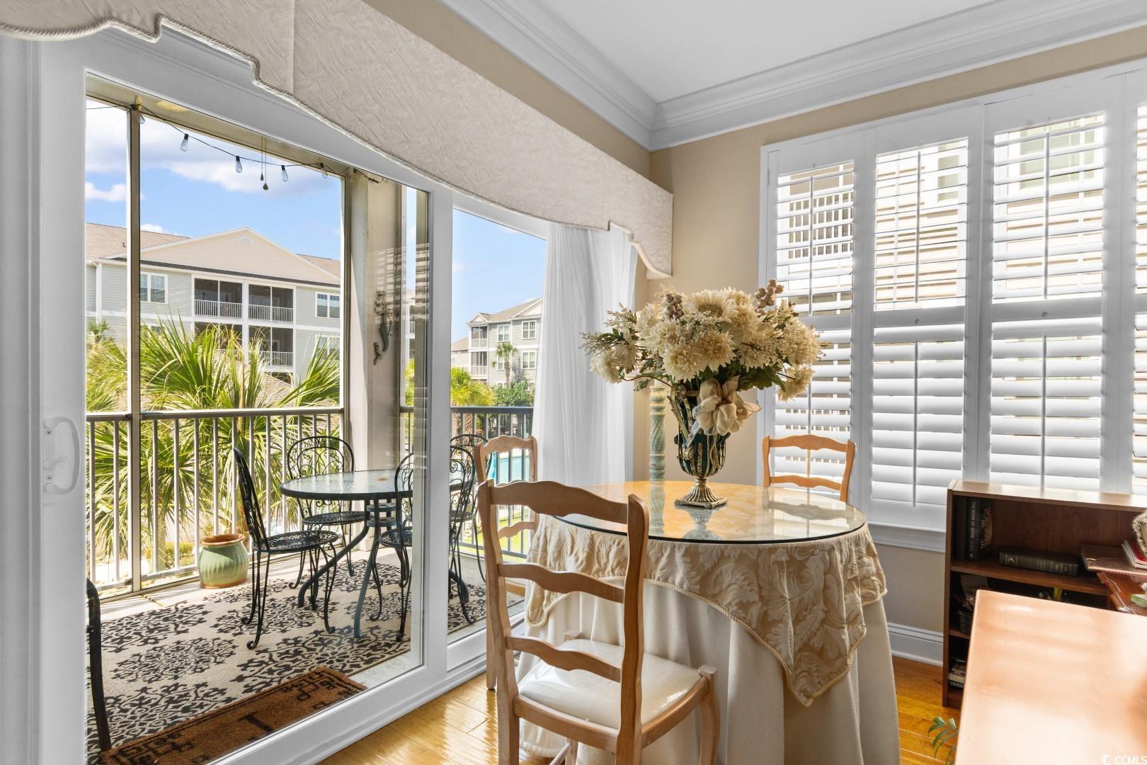 Nestled in the highly coveted community of The Village at Queens Harbour, this immaculate 3-bedroom, 2-bath condominium at 301 Shelby Lawson Dr is a true gem. This home has been meticulously maintained with annual HWH and HVAC servicing, and is move-in ready. Step inside to discover a home filled with custom upgrades and sophisticated details. The elegant, vinyl plank flooring spans the entire home, complementing the crown molding and additional trim work that elevate every room. The stunning custom built-ins throughout the home provide both beauty and functionality, offering a seamless blend of style and storage. The kitchen is a chef's dream, featuring stainless steel appliances, beautiful granite countertops, and a chic backsplash. The spacious primary suite offers a private sanctuary, separated from the other bedrooms by a grand double-door entry. Its luxurious en-suite bath provides the perfect space to unwind. Ceiling fans in every room ensure comfort, while the serene screened in balcony offers stunning views of the sparkling pool and a covered relaxation area, perfect for enjoying a peaceful morning coffee or an evening cocktail. The location is unbeatable. Enjoy the convenience of being within walking distance to top-rated restaurants and shopping. You are also just a short drive from the beautiful South Carolina beaches and popular destinations like Market Commons, the Marsh Walk, Brookgreen Gardens, and world-class golf courses. This pristine condominium is waiting for its new owner. Schedule your showing today!