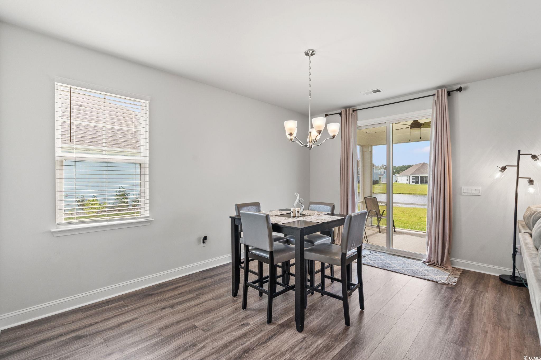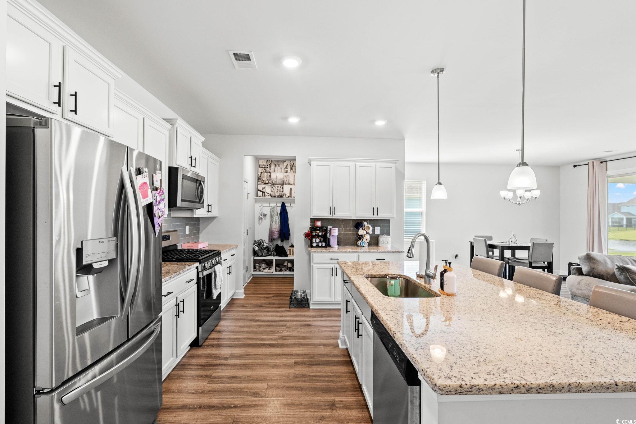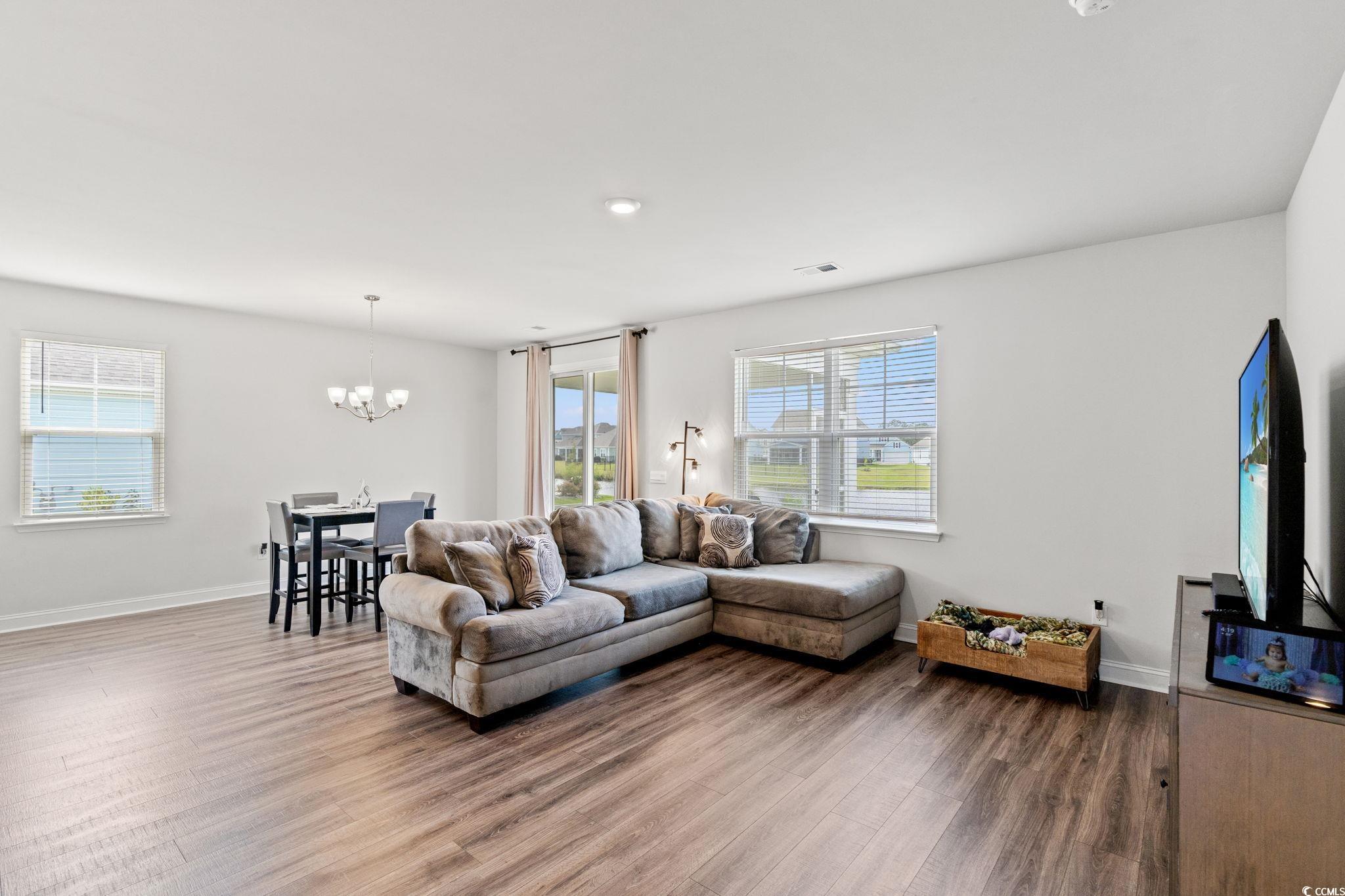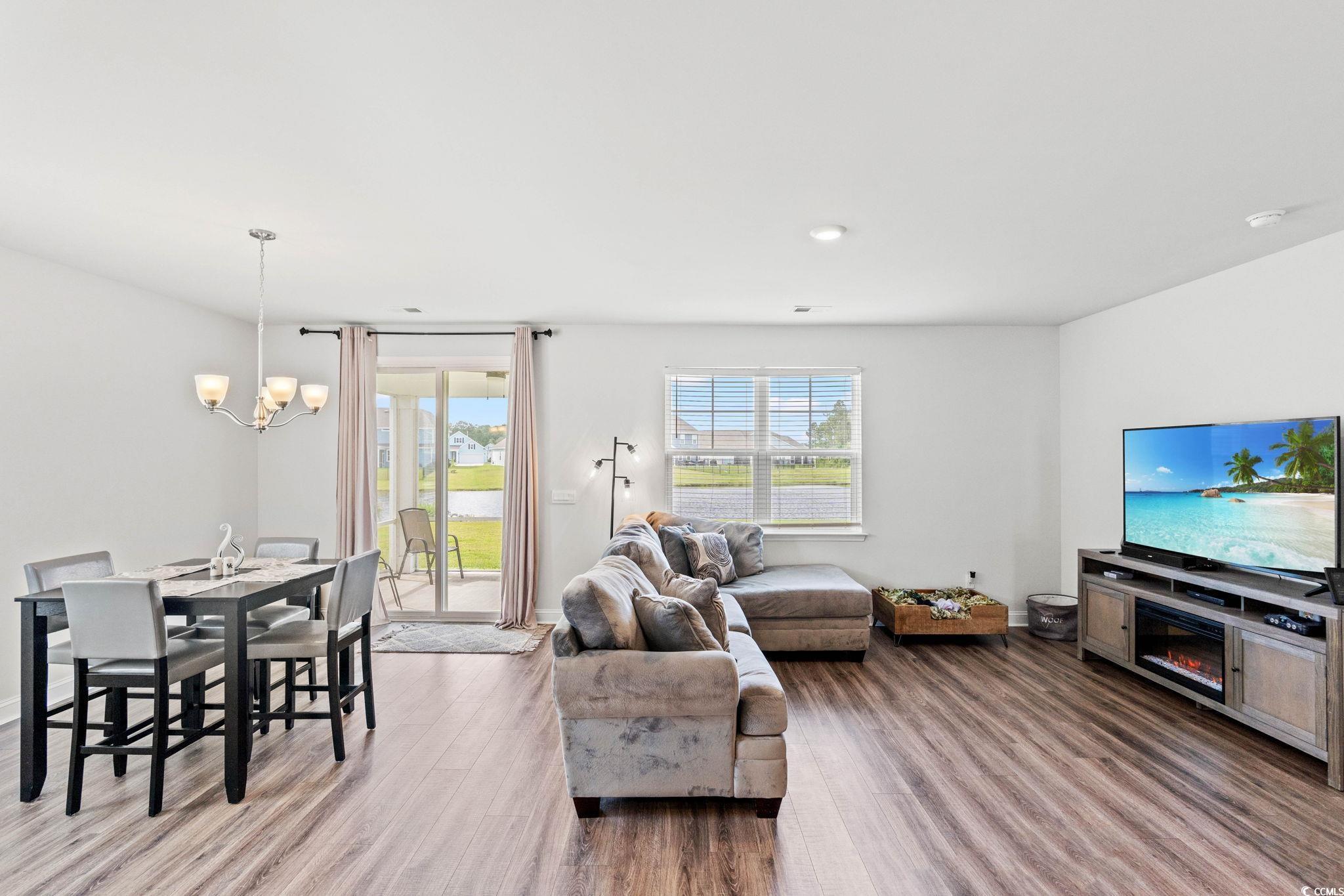 Welcome home to this beautiful open 4 bedroom, 2 1/2 bath home which is located in the very popular Lakes community in Myrtle Beach, South Carolina. Stacked stone elevation, inviting front porch, and 8 ft. entry door with glass. Beautiful wide plank laminate flooring flows through the foyer, kitchen, living room, and dining room with tile in the bathrooms and laundry room. The kitchen has granite countertops, tile backsplash, stainless Whirlpool appliance, walk-in pantry including a gas range with a large breakfast bar and dining nook. The oversized owners' suite is on the first floor with a walk in closet. The ensuite has double sinks and a walk-in tile shower. The other 3 nice size bedrooms and loft are on the second floor and share a full bathroom that has a tub/shower combo. The loft is perfect for another living area or office. Just minutes from the beach, golf courses, the Myrtle Beach Boardwalk, Sky Wheel, dining, entertaining, hospitals, shopping and the Myrtle Beach International Airport. The Lakes is a community that allows you to golf cart to the beach if you wish. Sliding glass doors off the dining area lead to the rear screen porch that overlooks the pond creating a seamless transition from indoor to outdoor living. Schedule your showing today! Square footages are approximate.