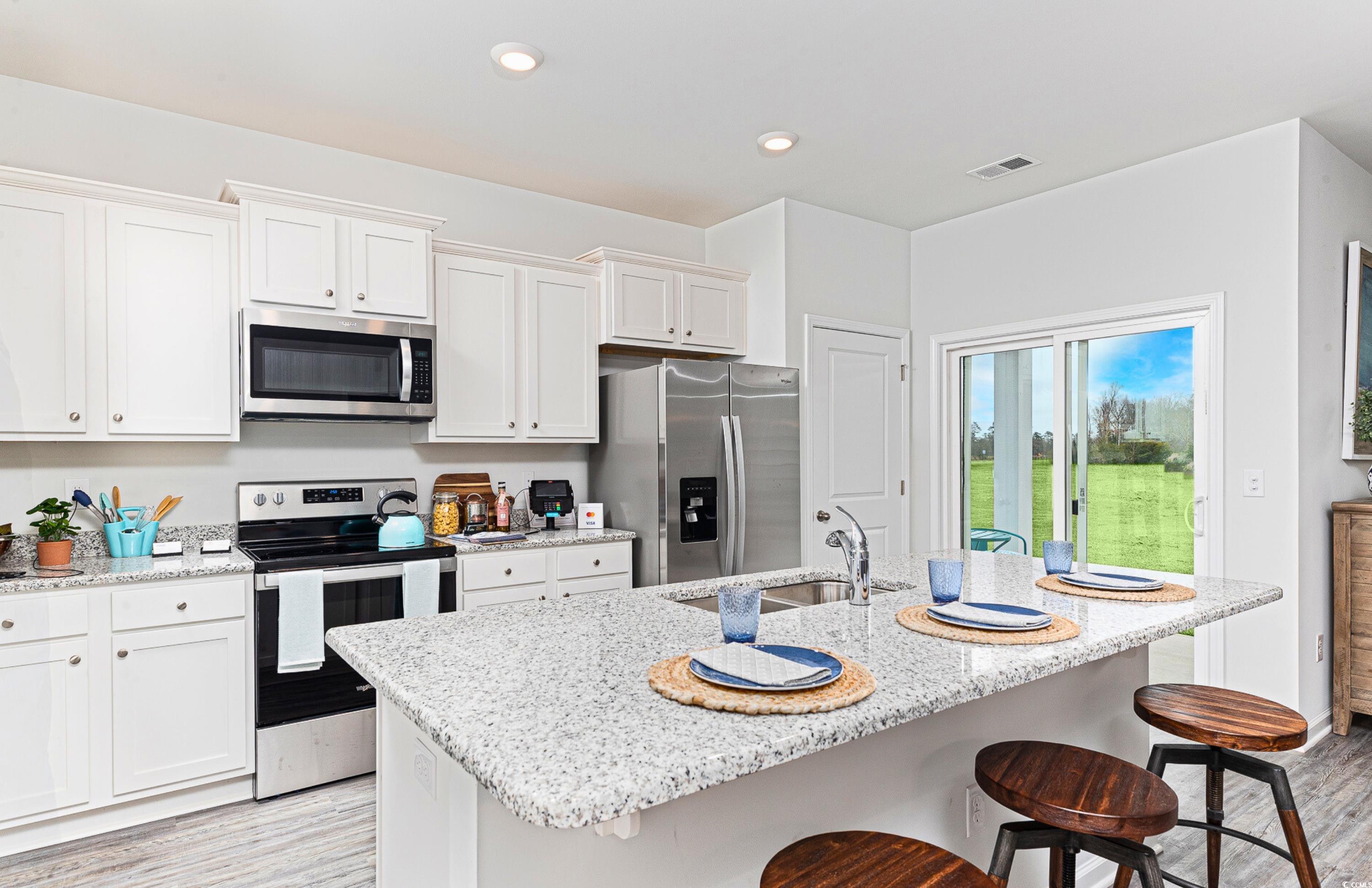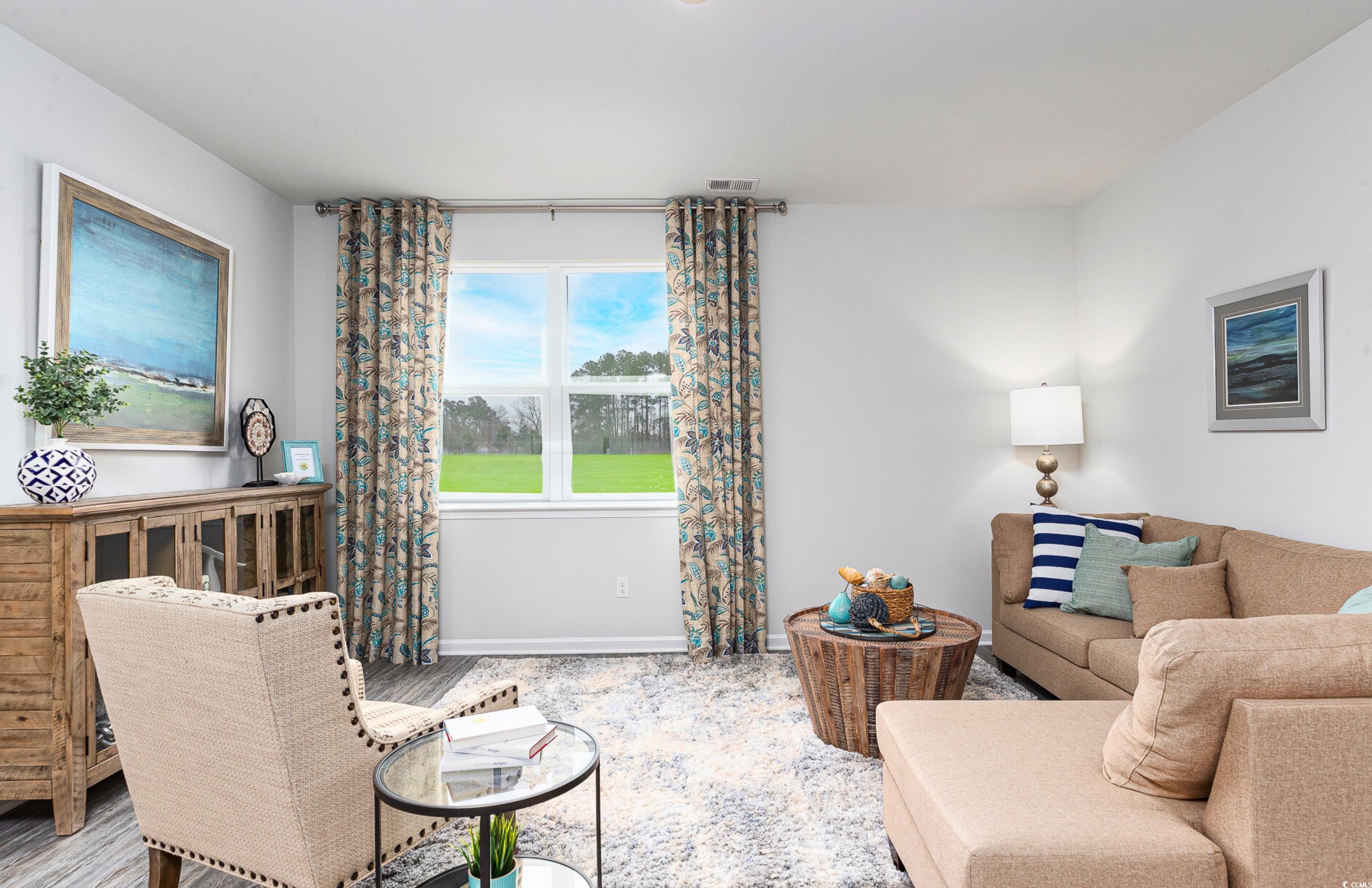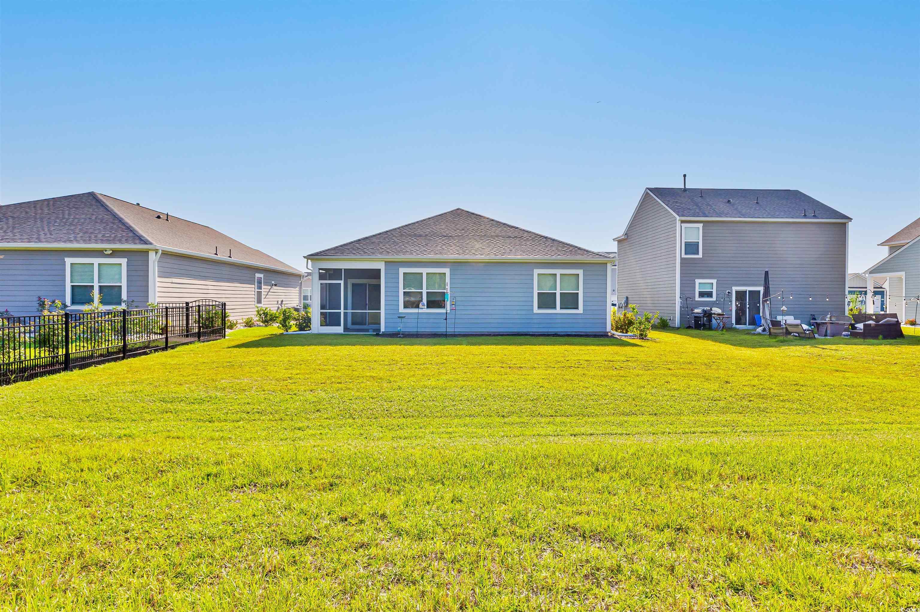 Welcome to 2661 Pegasus Place, showcasing the highly sought-after Kerry model, thoughtfully designed for easy one-level living. This open-concept floor plan features soaring 9-foot ceilings and a seamless flow, perfect for both everyday comfort and entertaining. At the heart of the home is a chef-inspired kitchen with gray painted cabinetry, granite countertops, stainless steel appliances, and a spacious island with breakfast barideal for meal prep or gathering with family and friends. A large laundry room and generous closet space enhance everyday convenience. The private primary suite offers a walk-in closet and en-suite bath with a double vanity and 5-foot shower, while two additional bedrooms provide flexibility for guests, a home office, or hobbies. Additional highlights include beautiful laminate wood flooring in the main living areas, a tankless gas water heater, a two-car garage, and industry-leading smart home technology. Step outside to a covered rear porch overlooking a wooded green space, offering a tranquil backdrop and privacy. This community is thoughtfully designed with paved, lighted walking trails, sidewalks, and curbed streets with gutters, making it easy to enjoy the outdoors and connect with neighbors. Located just minutes from shopping, dining, golf, and the beach, this home also provides access to wonderful community amenities. Photos are of a similar Kerry home. Square footage and features are approximate and may vary.