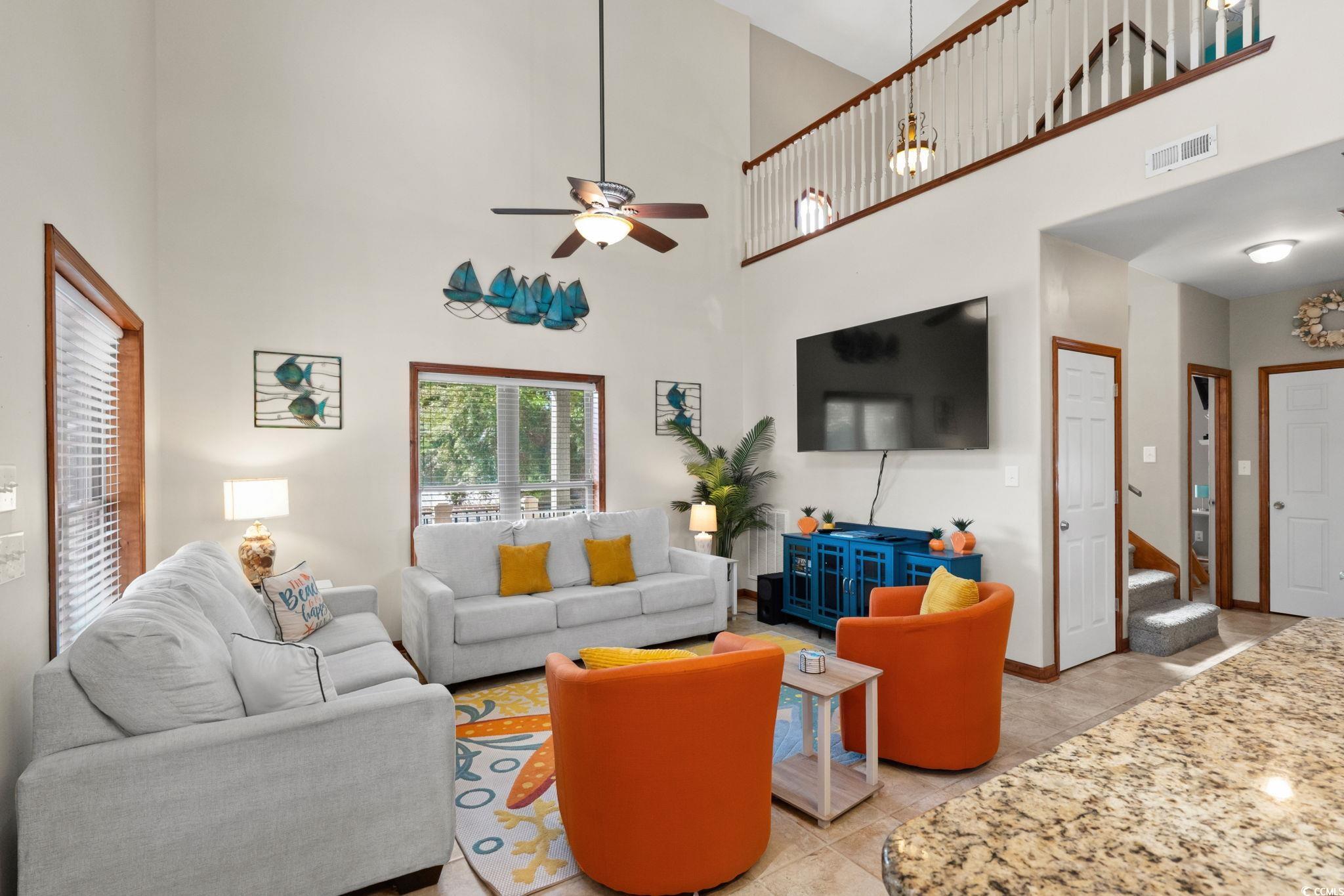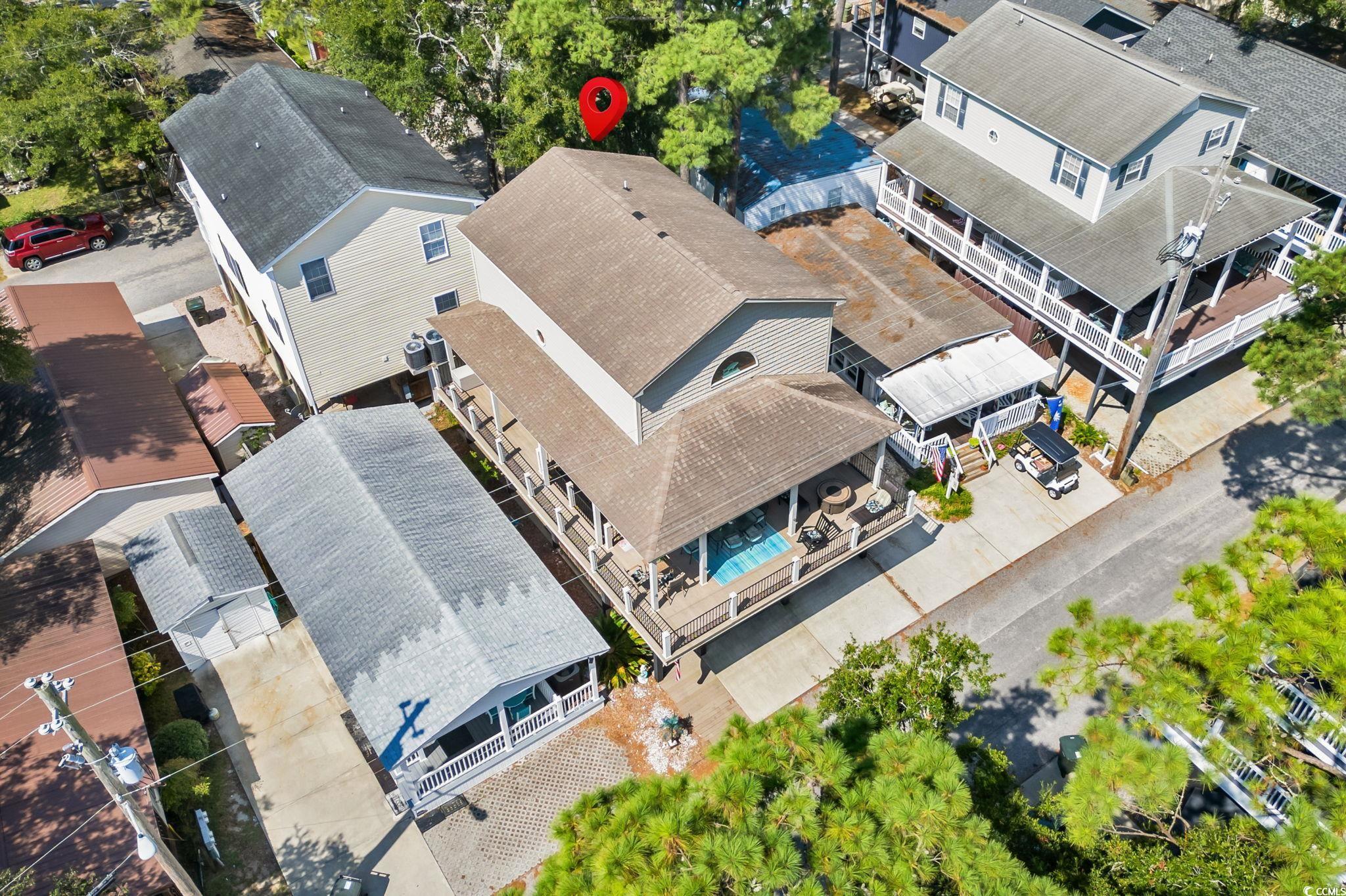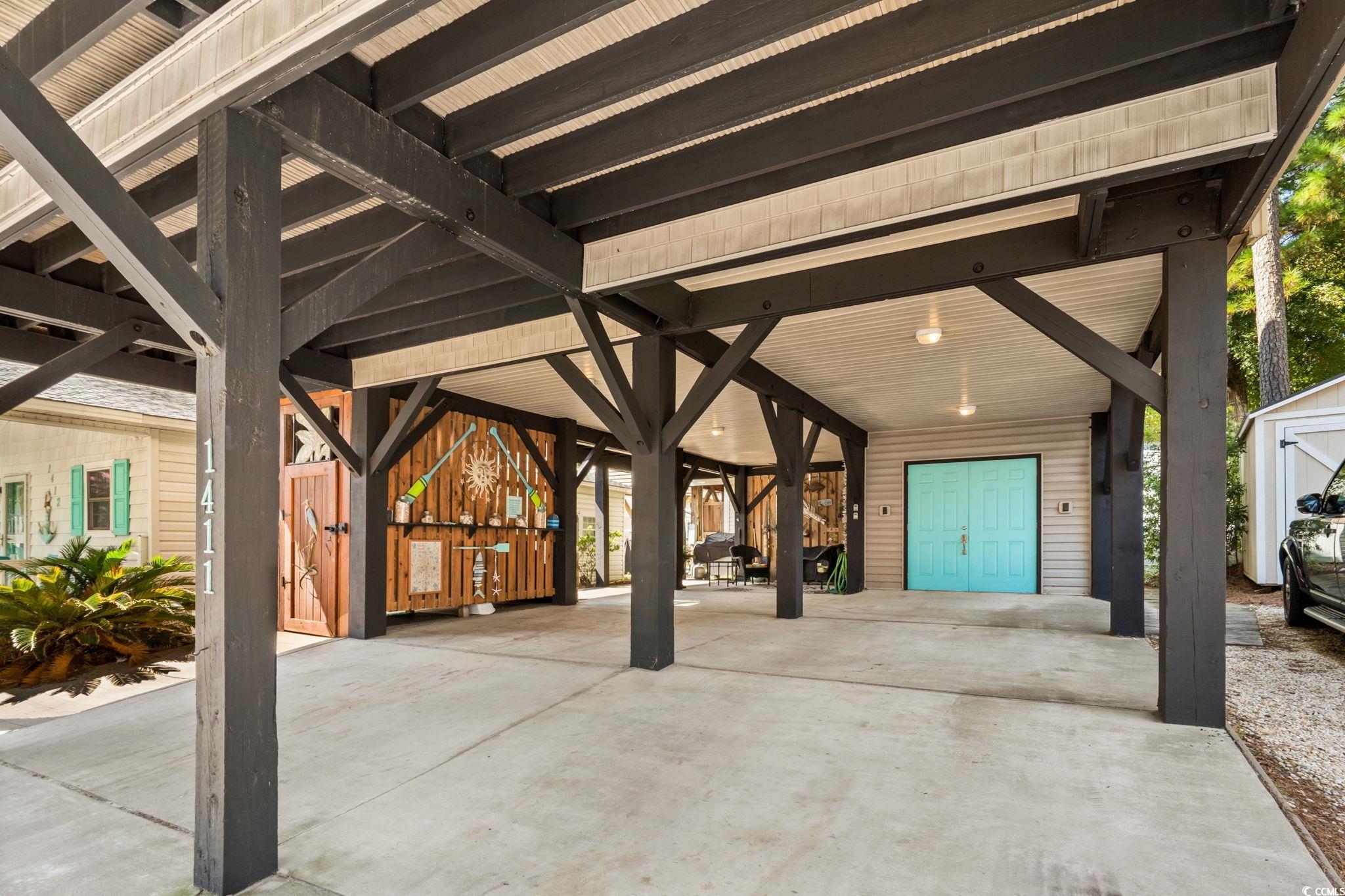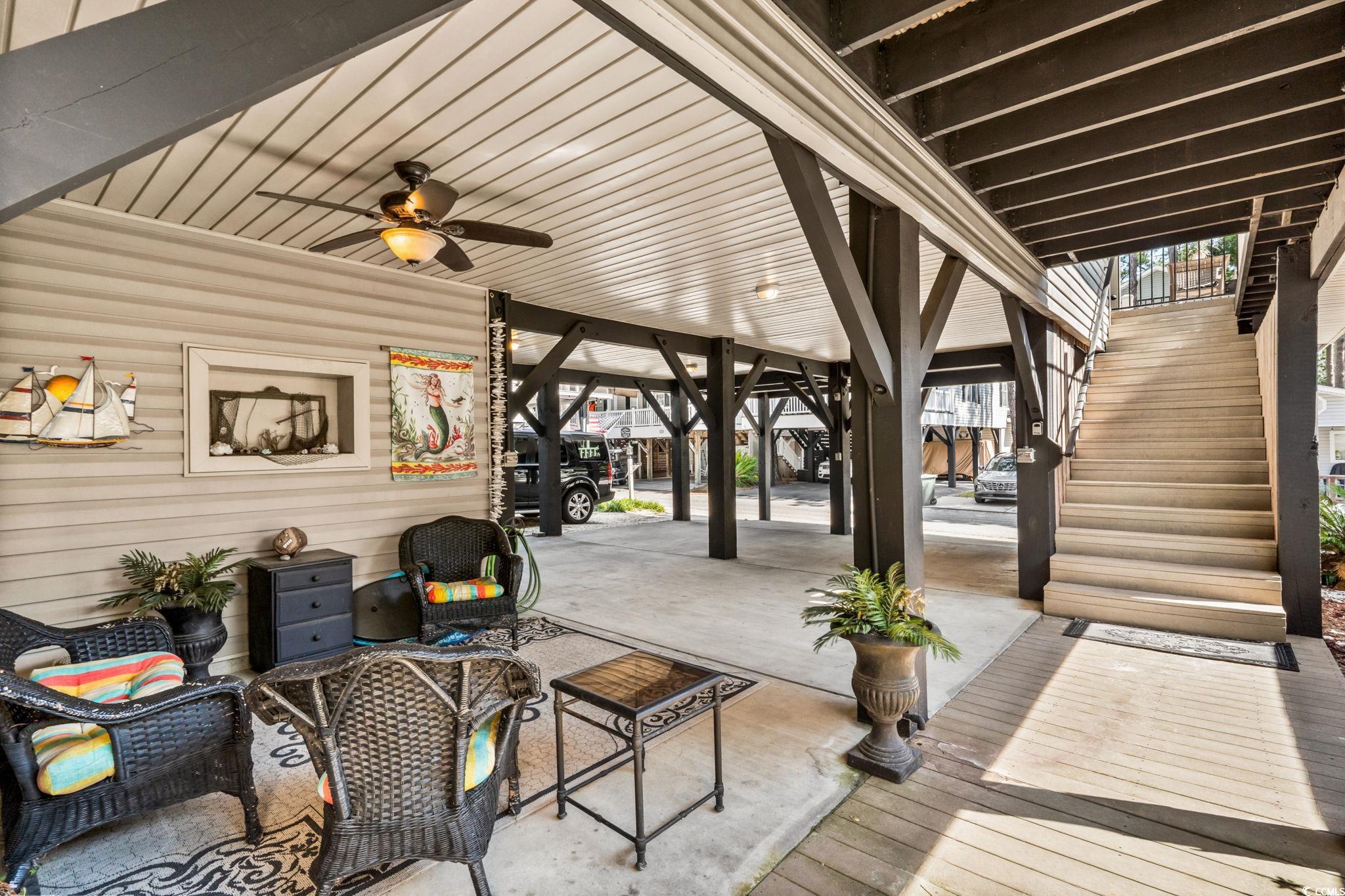 1411 is a 3-bedroom 2 bath two-story raised beach house built in 2010 with new HVAC system in 2024 and added mini-split a/c system for the upstairs primary bedroom in 2024. Under the raised beach house is parking for 4 vehicles, a beautiful outdoor entertaining area with ceiling fan, and outdoor shower. Covered steps lead to the composite covered deck that wraps around the house on the east side. Covered deck will give you morning sun and afternoon shade, dining table with 6 chairs, high-top table with 2 chairs, 2 lounge chairs, firepit, 2 ceiling fans, and additional east facing covered deck with ceiling fan. Entering inside the beautiful home you have cathedral ceilings with ceiling fan, large living room with open concept dining and gorgeous kitchen. Kitchen has custom wood cabinets, granite counters, stainless steel appliances,(refrigerator and microwave are 1 year old) island with 4 bar stools, and dining area with table and seating for 4. First floor has tile floors in the living room and kitchen, LVP floors in the bedrooms and bathroom. 2 bedrooms and 1 full bath with large walk-in tile shower with glass door, Full-size stackable washer/dryer are located on the 1st floor between the downstairs bedrooms. Upstairs is the primary suite with large bedroom, vaulted ceilings with ceiling fan, huge bathroom with dual vanities, garden soaker tub, and walk-in shower. This home is being sold fully furnished! NEW ROOF 2025!!