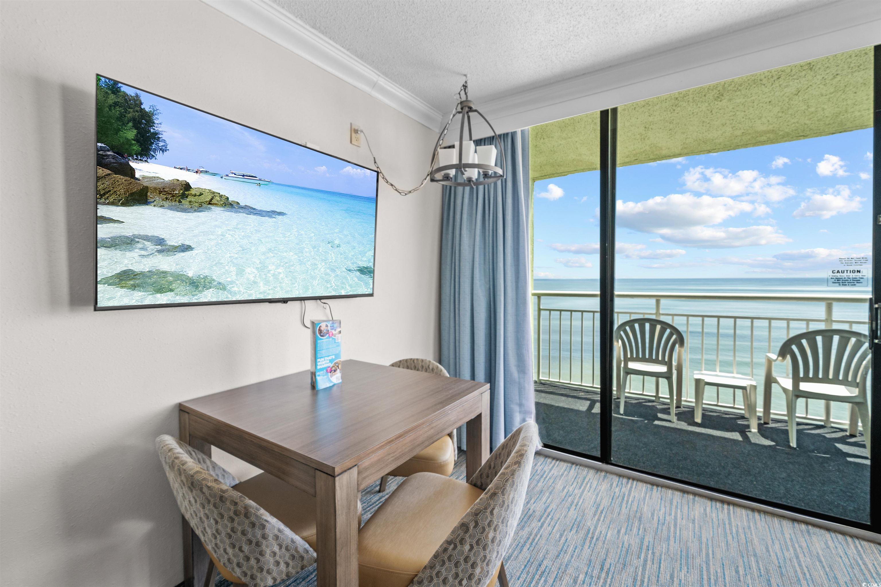 Beautiful TRUE 1-bedroom, 1-bath oceanfront condo in the highly sought-after Coral Beach Resort. This deluxe end unit offers more square footage than standard one-bedrooms and features a unique layout with two balconies; a large wrap-around balcony off the living area with breathtaking ocean and skyline views, plus a second private balcony accessible only from the bedroom. Fully furnished, the condo includes granite countertops, designer furnishings, flat-screen TVs, custom cabinetry, full kitchen, Murphy bed, and more. With its flexible layout, the condo can comfortably accommodate up to 6 guests. Coral Beach Resort is renowned for its unmatched amenities, named Best Family Accommodations by The Travel Channel. On-site features include indoor and outdoor pools, a lazy river, waterpark, sauna, fitness center, bowling alley,entertainment zone, multiple dining options, and meeting/banquet facilities. With its rare true 1-bedroom layout, unbeatable oceanfront location, and strong income potential, this property is a standout opportunity in Myrtle Beach.