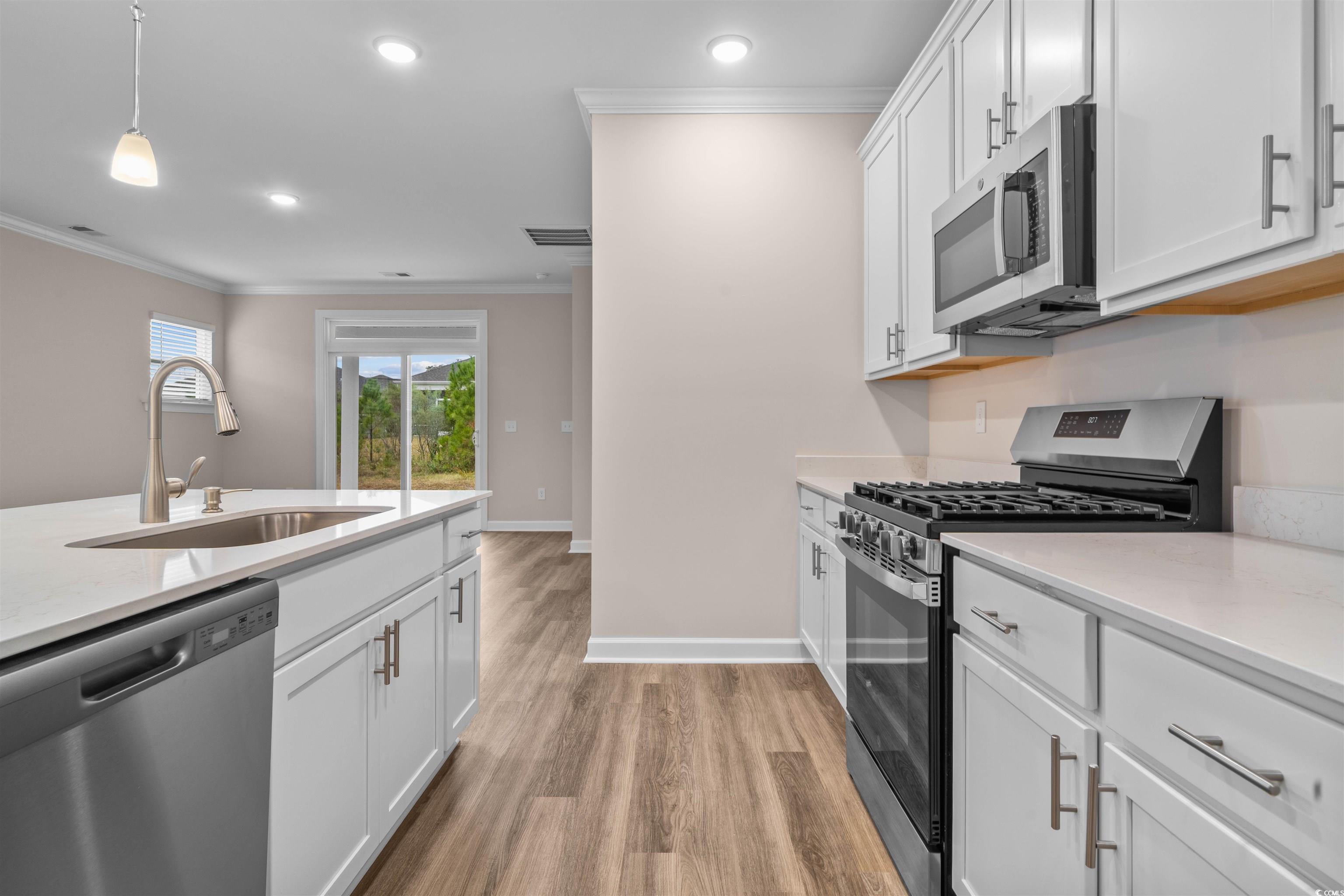 As you enter through the foyer, a hallway to your right leads to a cozy bedroom featuring a walk-in closet. Across the hall is a full bathroom, complete with a convenient linen closet. Continuing through the home, youll discover a spacious kitchen with a stunning island, perfect for hosting holiday gatherings. The kitchen is equipped with a MOEN Brushed Nickel pull-out faucet and a built in soap dispenser. Prepare delicious meals on your natural gas stove, then gather with loved ones for dinner. The journey continues into the inviting great room, where you can unwind after a long day, cozy up, and enjoy your favorite shows. But the comfort doesnt end there! At the rear of the house, youll find the Owner's Suite, a private retreat with a walk-in closet, a double bowl sink and a separate enclosed toilet room. The bathrooms are equipped with MOEN brushed nickel bath accessories and faucets, offering a modern and elegant touch throughout the home.