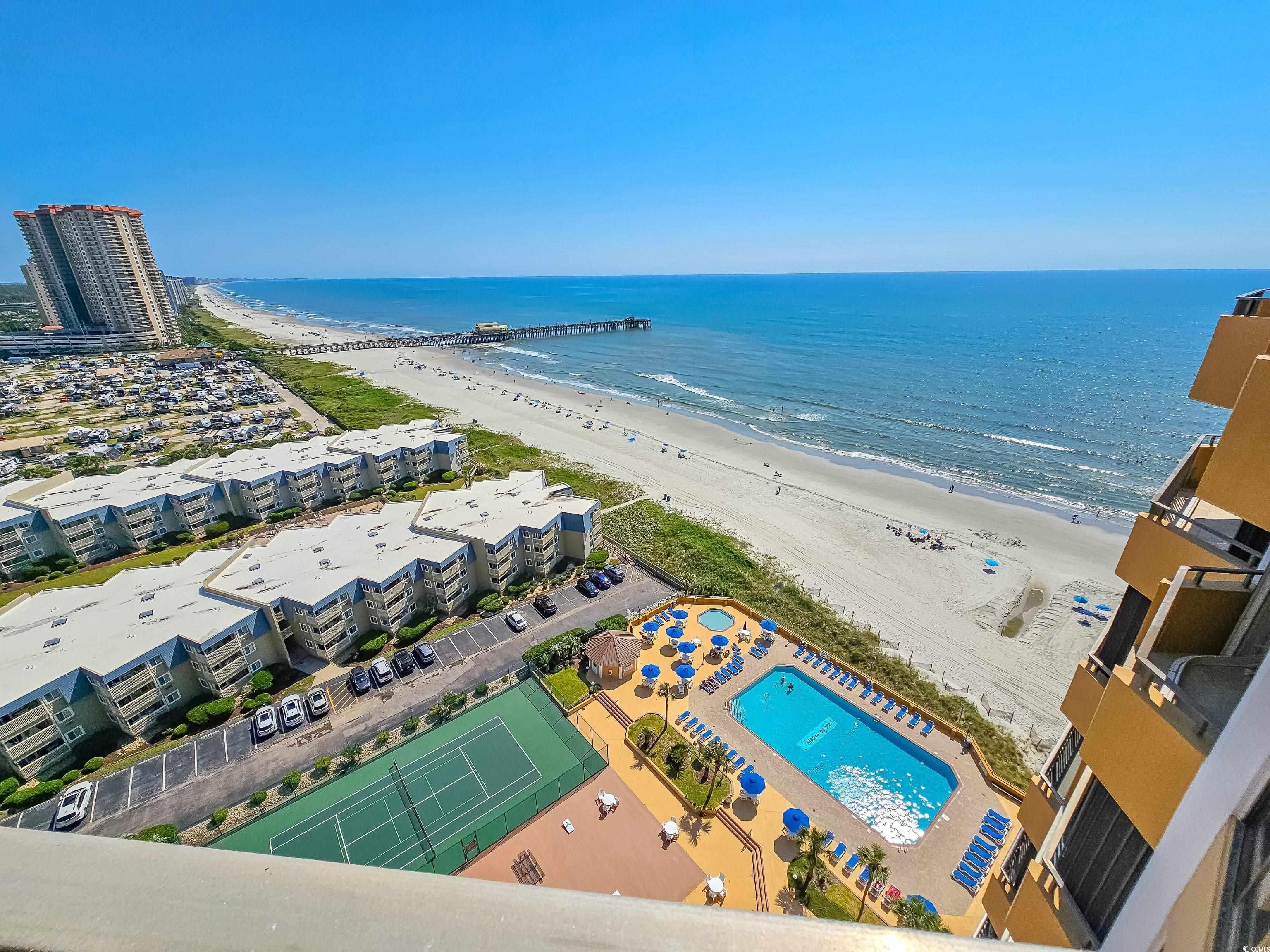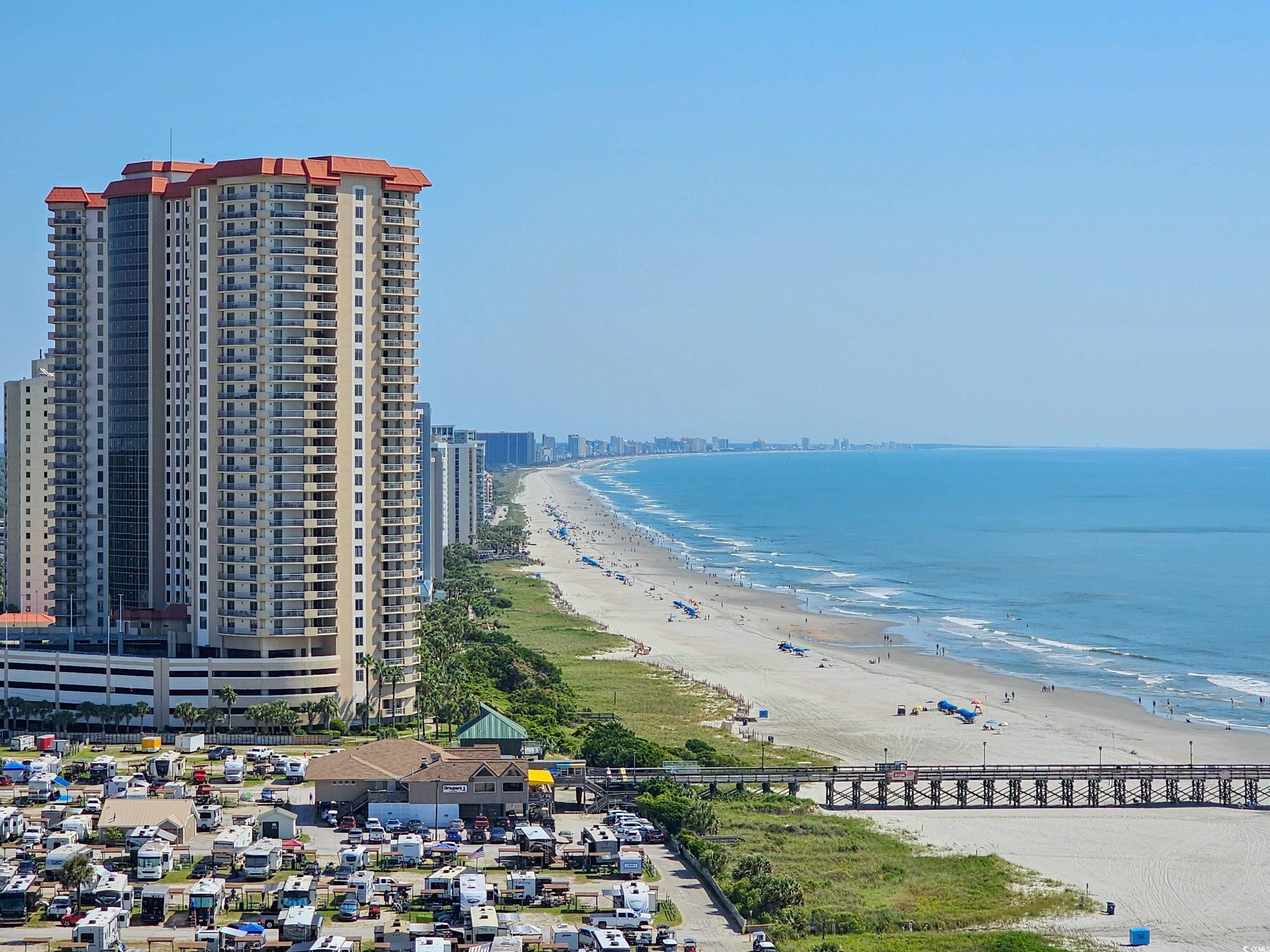 Experience breathtaking views every day, you will never want to leave your balcony! Step inside this two-bedroom, two-bath residence and enjoy the view from every room, and what a sunrise! The unit is furnished with a fireplace between the living and dining rooms and glass cases in the dining room, which are great for showcasing those special items. The kitchen has solid surface countertops, stainless steel appliances, a breakfast nook, and steps off to the balcony. Hurricane shutters on the balcony. The primary suite and the split bedroom floor plan have large walk-in closets. There is extra storage at the end of the hallway. This luxury oceanfront tower has amenities like no other tower on the beach. Beautiful lobby with 24-hour security at the front desk, oceanfront lounge, pool with Tiki bar, Bon Apptit restaurant and dining area, billiards and media room, fitness center, ladies' and men's sauna, game room, underground parking, basketball and tennis court, and much more! Great primary residence, second home or rental option. A must see!