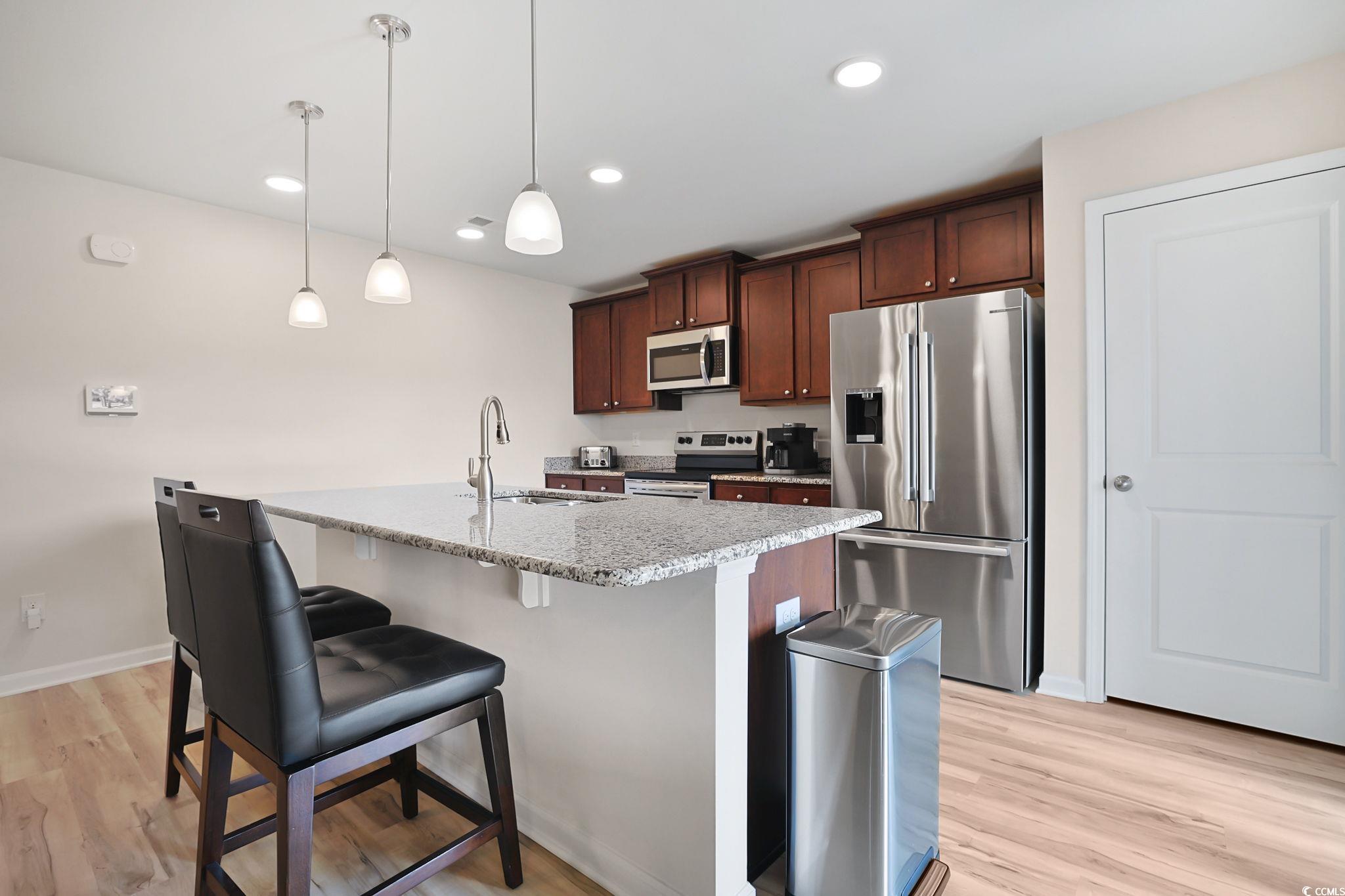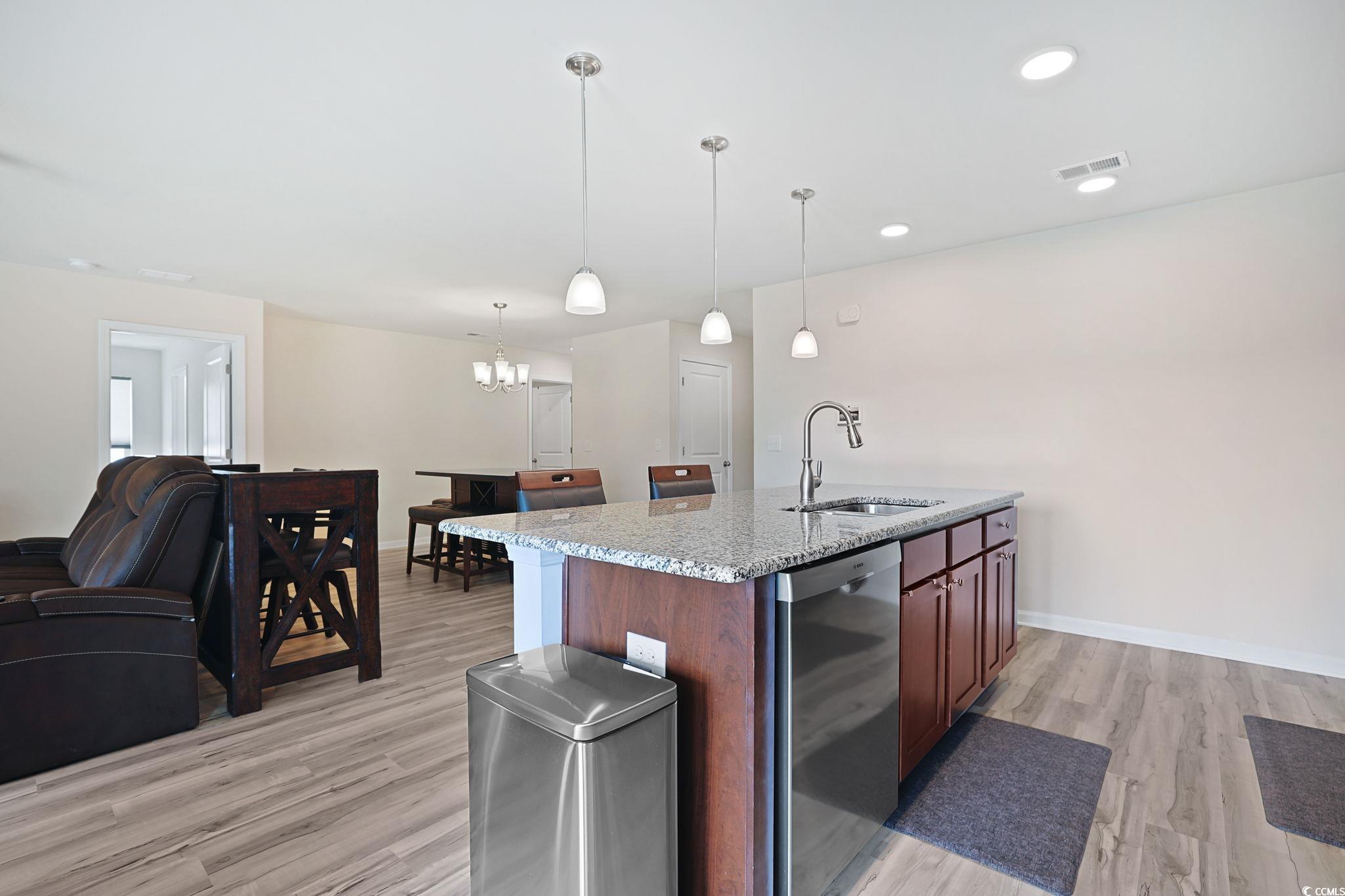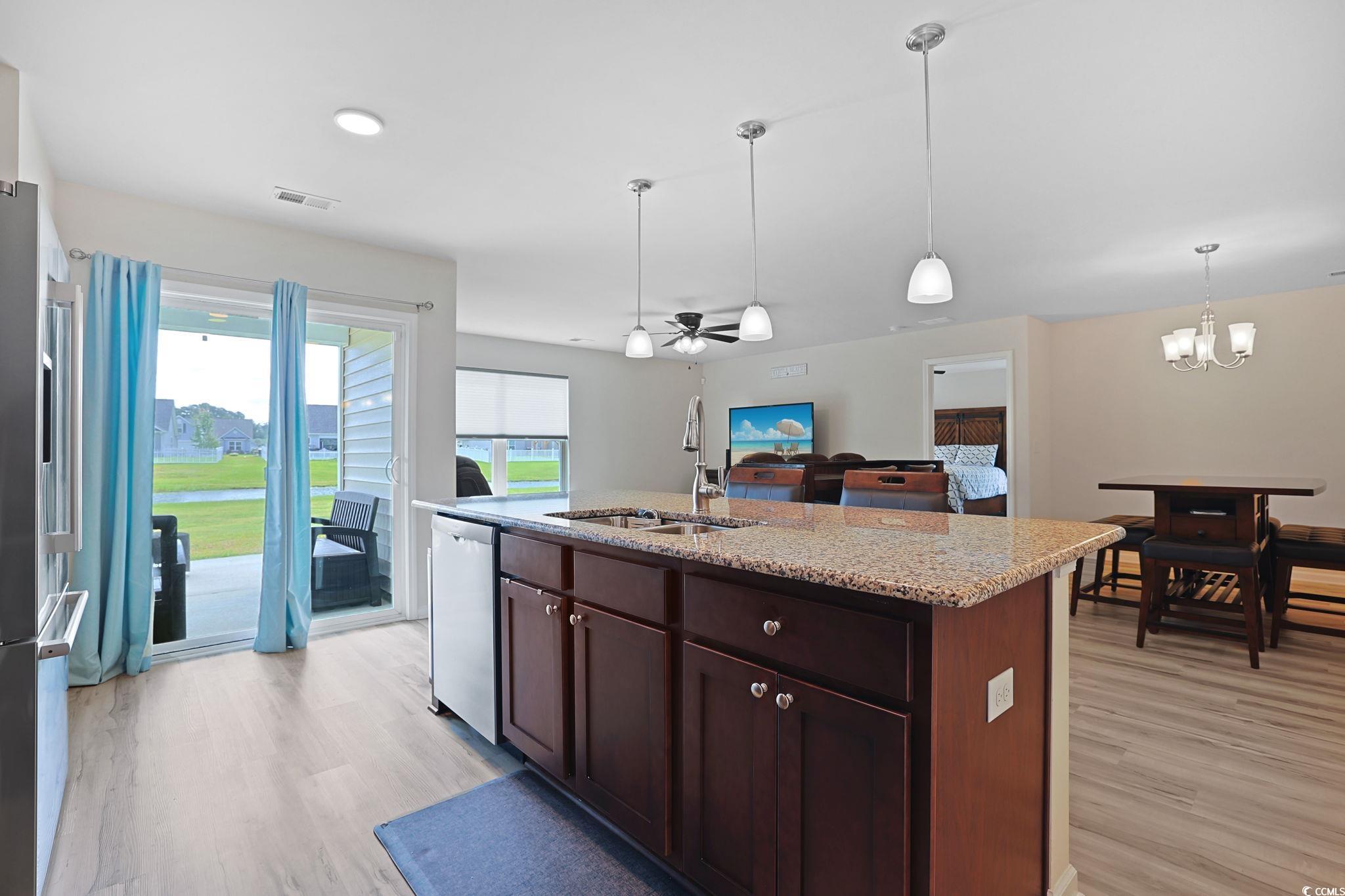 Introducing this 3 bedroom 2 bath home located in the popular Oak Glenn community. This home features BRAND NEW wood look LVP & BRAND NEW carpet flooring, smooth flat ceilings, an open floor plan that showcases a sliding glass door that opens up to the relaxing covered & uncovered back patio with tranquil lake views. The cheerful kitchen is equipped with a one year old stainless steel appliance package, granite counter tops, ample cabinet spaces, a practical pantry, and a kitchen island with a breakfast bar. The primary bedroom offers lake views, a ceiling fan, private access to the primary bath that presents a vanity with dual sinks, a comfort station, a deluxe step-in shower, and a large walk-in closet. This home is completed with two additional bedrooms, full guest bath, HVAC air purifier, a Halo whole home water treatment with a purifying system, whole-home surge protector and a two car attached garage. This home affords you easy access to the beach and golfing along with all of the other activities and happenings in Myrtle Beach & Conway including fun eateries, award winning off-Broadway shows, public fishing piers, Conways historic riverwalk, and intriguing shopping adventures along the Grand Strand. Conveniently located to your everyday needs, including grocery stores, banks, post offices, medical centers, doctors offices, and pharmacies. Check out our state of the art 3-D Virtual Tour.