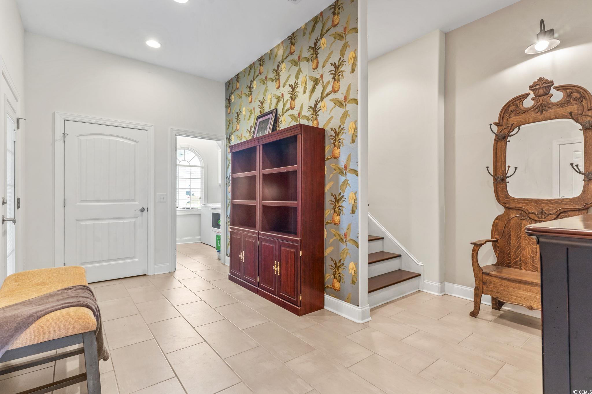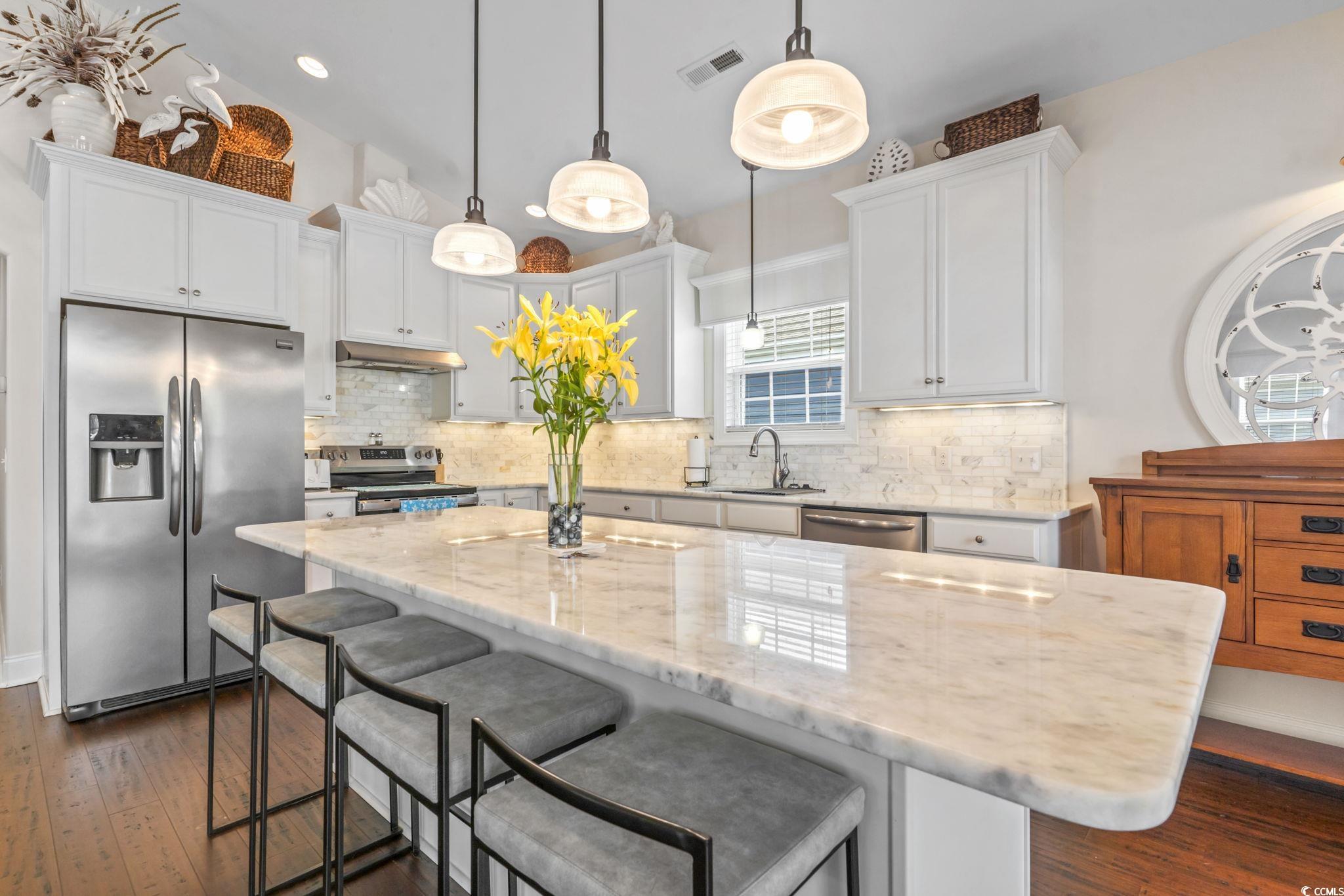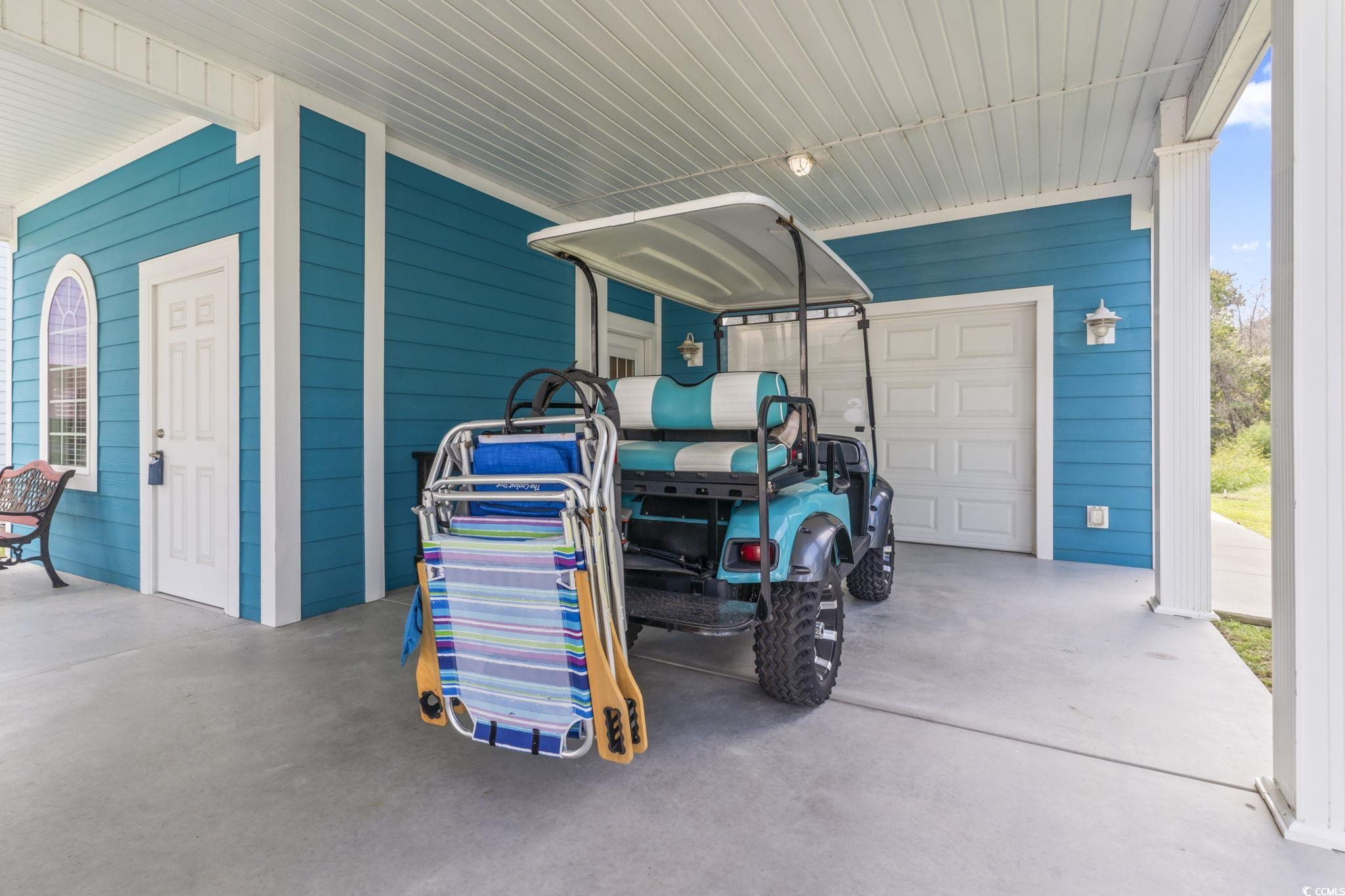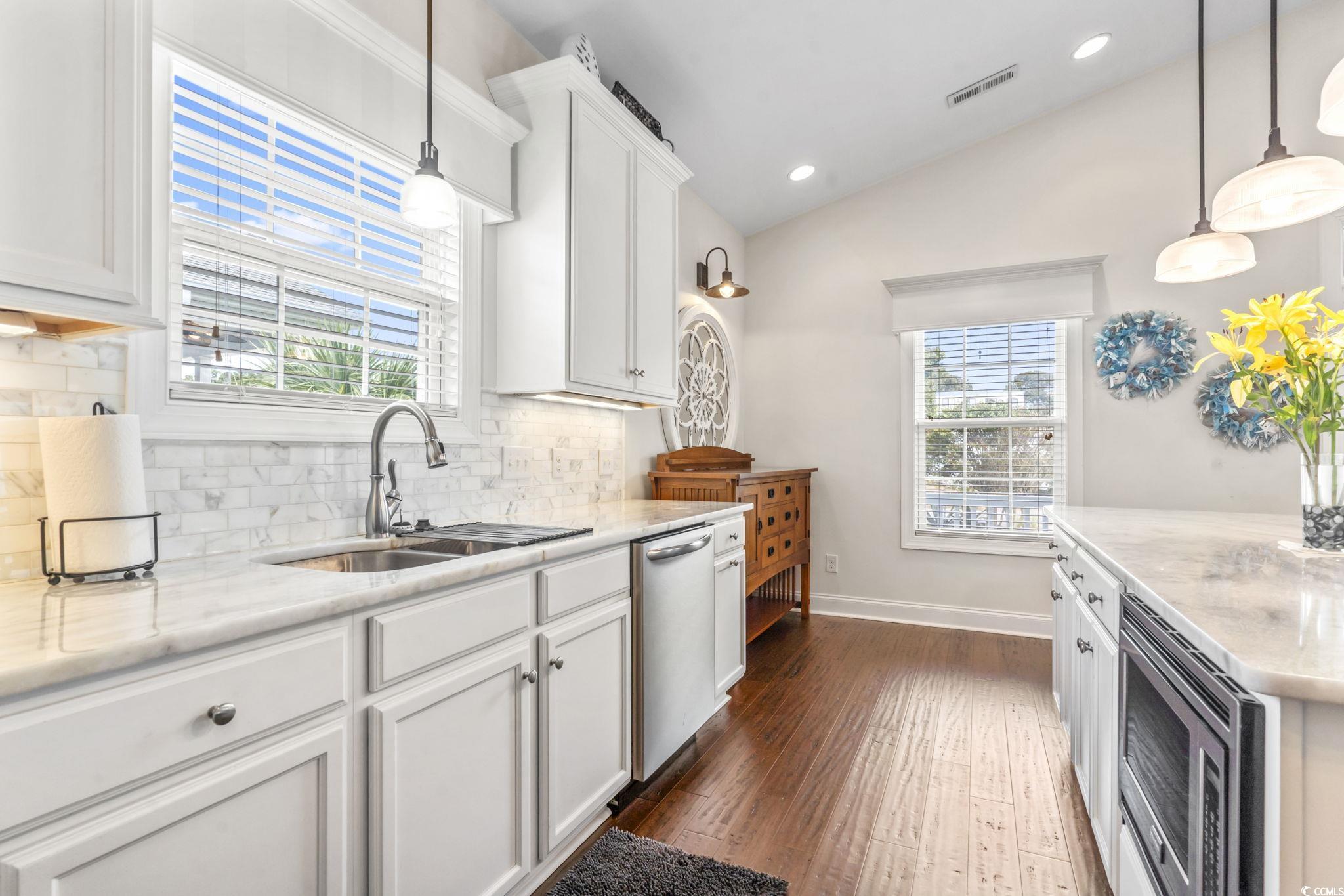 Gorgeous raised beach house near the Cherry Grove section of North Myrtle Beach! This 3 bedroom and 3 bathroom home also features a flexible bonus space downstairs that could easily serve as a 4th bedroom, office, or private mother-in-law suite. On the ground level, you will find a spacious laundry room, extra storage, and a versatile bonus room with full bathroom with shower and a heated and air condition garage. An elevator shaft closet is already in place, allowing for future elevator installation if desired. Upstairs, the main living area is designed for entertaining with vaulted ceilings, recessed lighting, and an open floor plan. The gourmet kitchen includes stainless steel appliances, granite countertops, custom cabinetry, a large breakfast bar, and a stylish tile backsplash overlooking the living room. French doors open to an oversized balcony which is perfect for relaxing and enjoying the sea breeze. The upstairs also includes a walk-in pantry, two additional guest bedrooms with large closets, a full bathroom with custom tile shower, and a spacious primary suite. The primary bedroom offers a walk-in closet, dual-sink vanity, granite countertops, and a beautifully tiled shower and large linen closet. All bathrooms have been upgraded with custom finishes. Complete HVAC system was replaced a few years ago. Luxury vinyl plank flooring runs throughout the main living area, with tile in the bathrooms and lower level. Outside, a private patio with spa overlooks a peaceful wooded area which is perfect to relax. Parking is plentiful with space for up to six cars, plus a garage ideal for a vehicle or golf cart along with extra storage. The home conveys with all appliances, including washer and dryer. The home is located in the desirable Cross Island community of North Myrtle Beach and this home is just a short golf cart ride to the beach and convenient to restaurants, shopping, golf, The Shack, and major highways which makes all of the Grand Strand easily accessible! Home is Priced to Sell and should be at the top of your list!