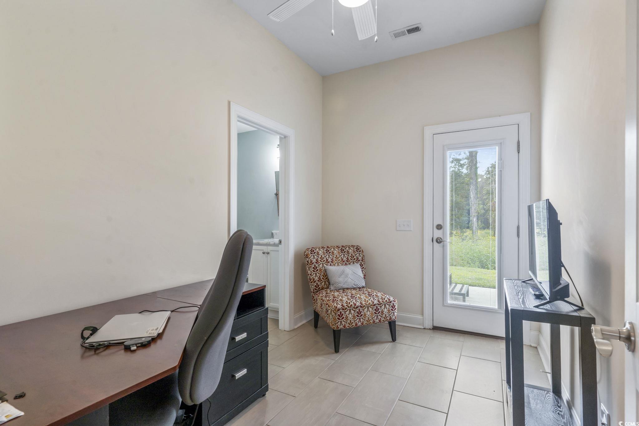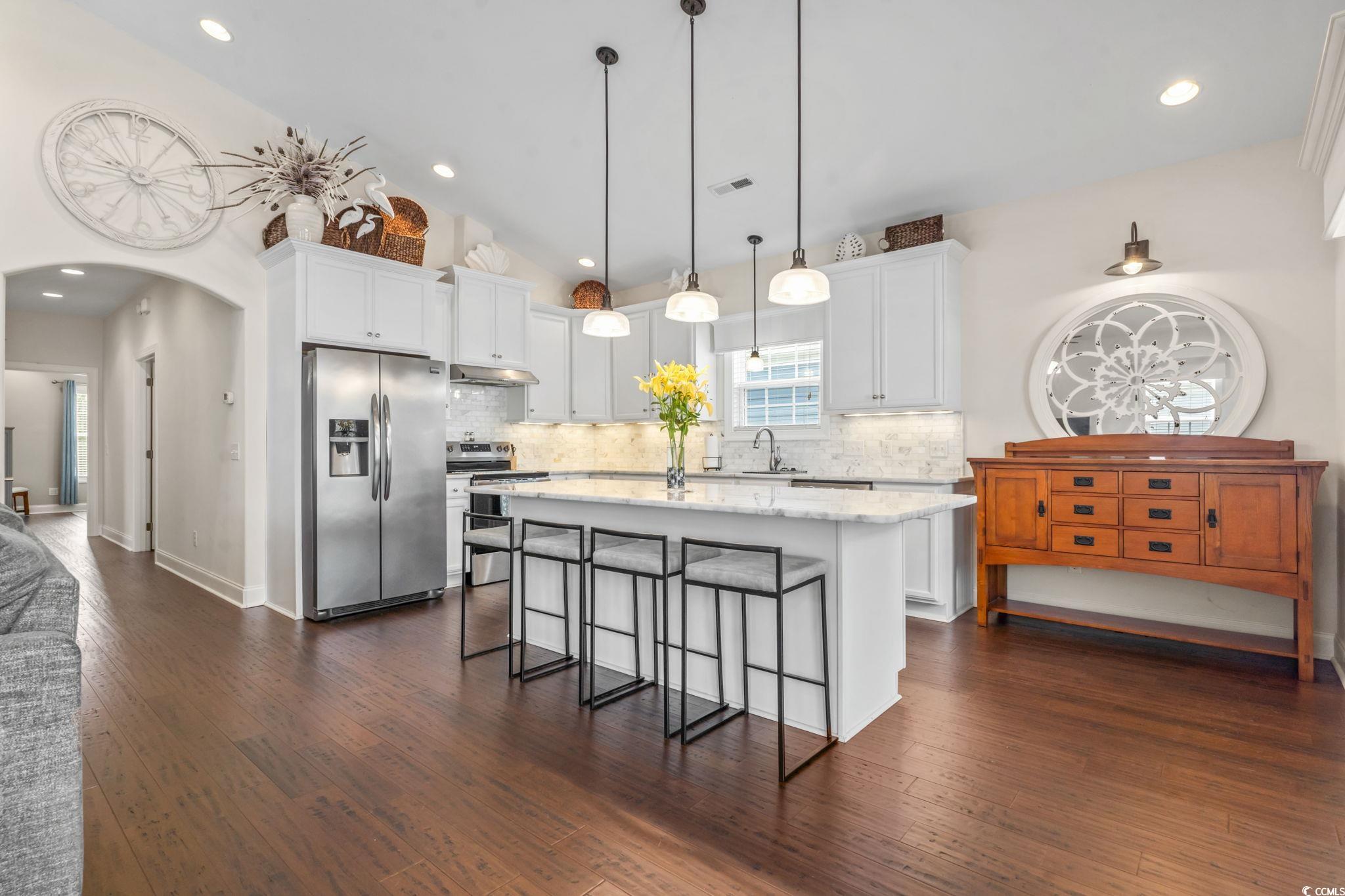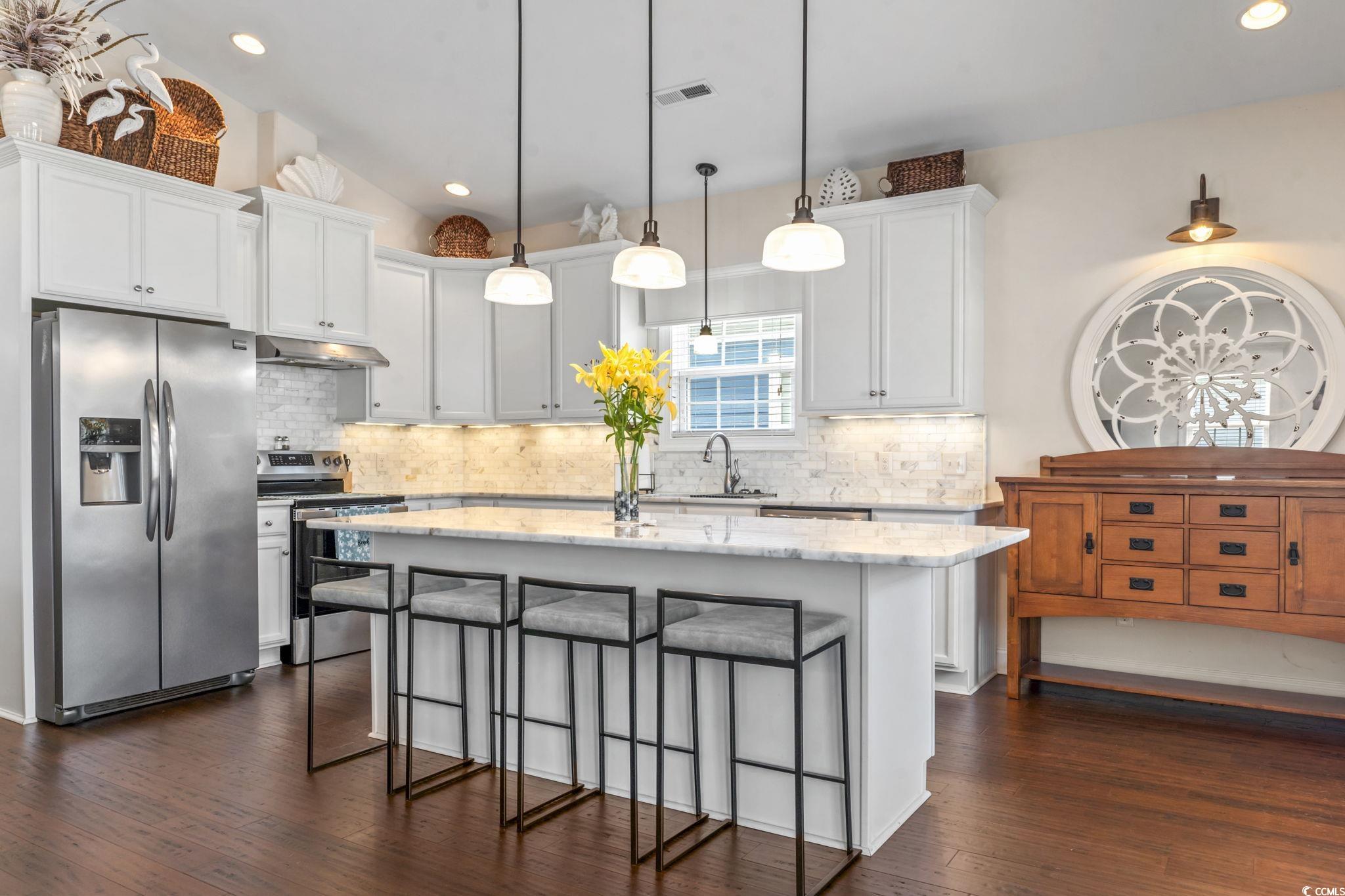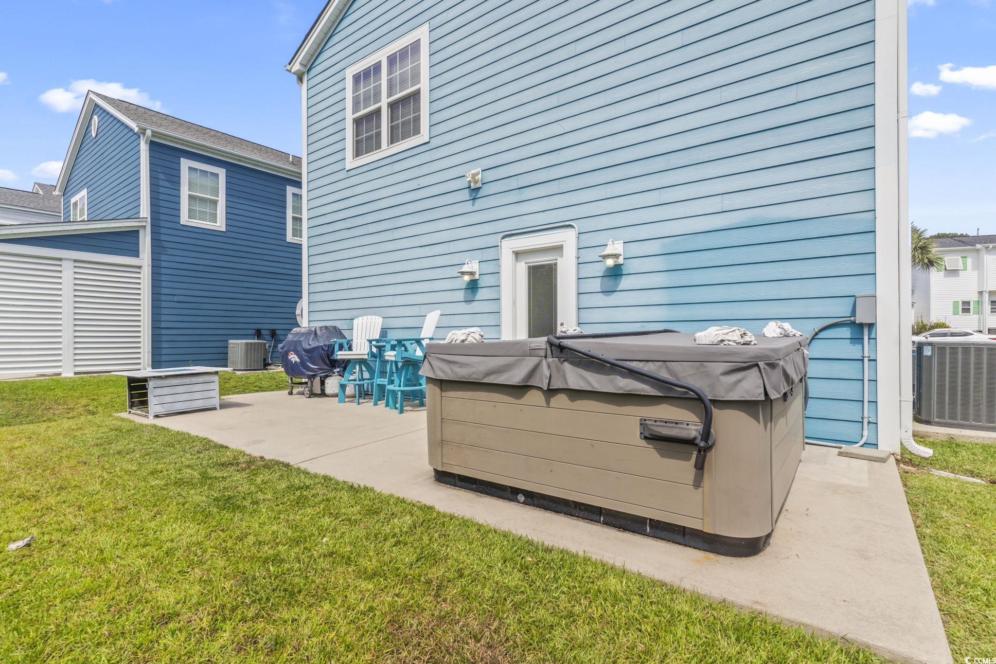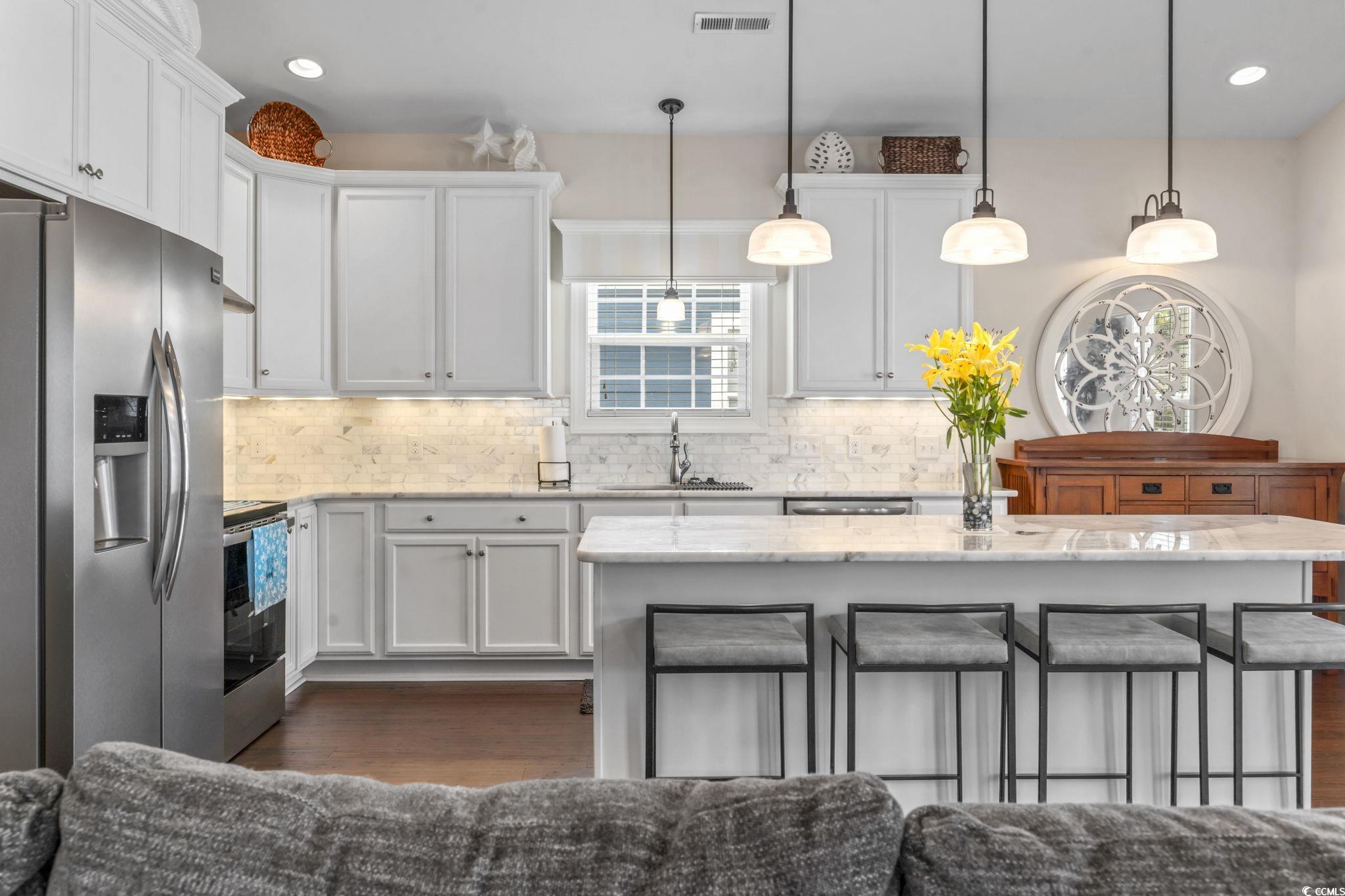 Gorgeous raised beach house near the Cherry Grove section of North Myrtle Beach! This 3 bedroom and 3 bathroom home also features a flexible bonus space downstairs that could easily serve as a 4th bedroom, office, or private mother-in-law suite. On the ground level, you will find a spacious laundry room, extra storage, and a versatile bonus room with full bathroom with shower and a heated and air condition garage. An elevator shaft closet is already in place, allowing for future elevator installation if desired. Upstairs, the main living area is designed for entertaining with vaulted ceilings, recessed lighting, and an open floor plan. The gourmet kitchen includes stainless steel appliances, granite countertops, custom cabinetry, a large breakfast bar, and a stylish tile backsplash overlooking the living room. French doors open to an oversized balcony which is perfect for relaxing and enjoying the sea breeze. The upstairs also includes a walk-in pantry, two additional guest bedrooms with large closets, a full bathroom with custom tile shower, and a spacious primary suite. The primary bedroom offers a walk-in closet, dual-sink vanity, granite countertops, and a beautifully tiled shower and large linen closet. All bathrooms have been upgraded with custom finishes. Complete HVAC system was replaced a few years ago. Luxury vinyl plank flooring runs throughout the main living area, with tile in the bathrooms and lower level. Outside, a private patio with spa overlooks a peaceful wooded area which is perfect to relax. Parking is plentiful with space for up to six cars, plus a garage ideal for a vehicle or golf cart along with extra storage. The home conveys with all appliances, including washer and dryer. The home is located in the desirable Cross Island community of North Myrtle Beach and this home is just a short golf cart ride to the beach and convenient to restaurants, shopping, golf, The Shack, and major highways which makes all of the Grand Strand easily accessible! Home is Priced to Sell and should be at the top of your list!
