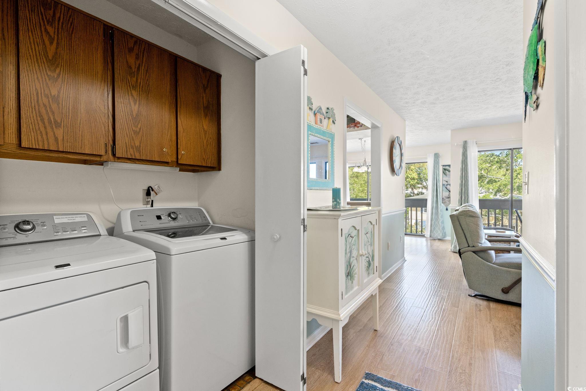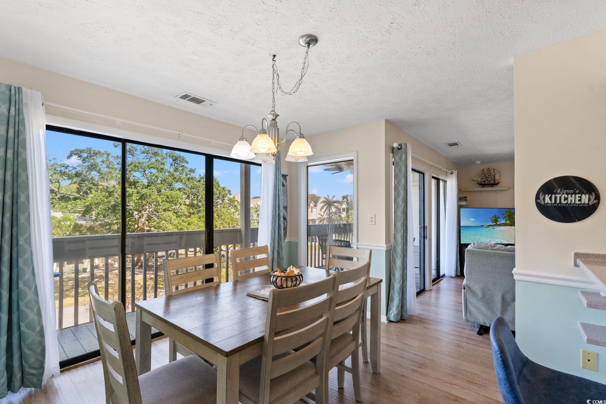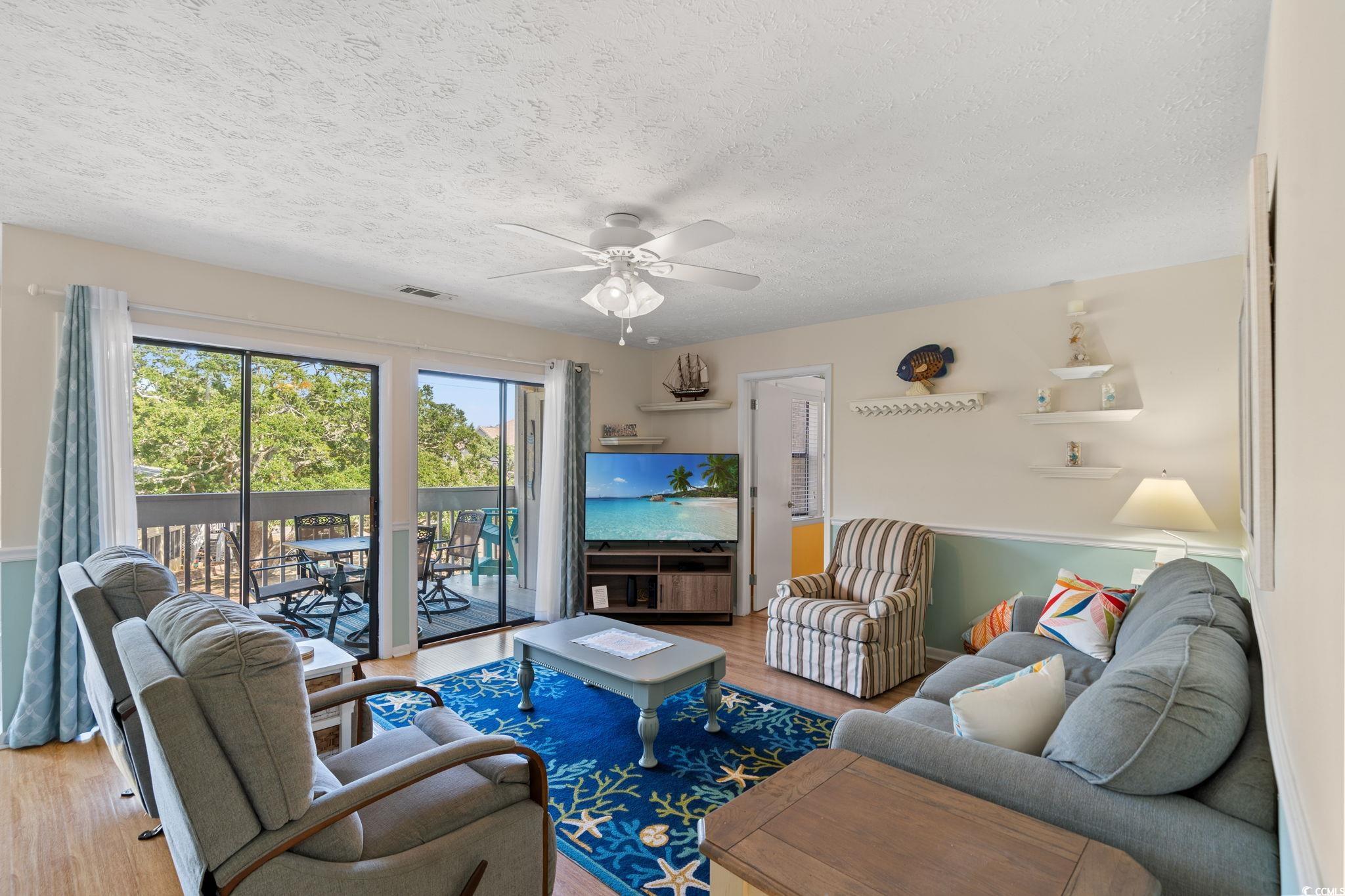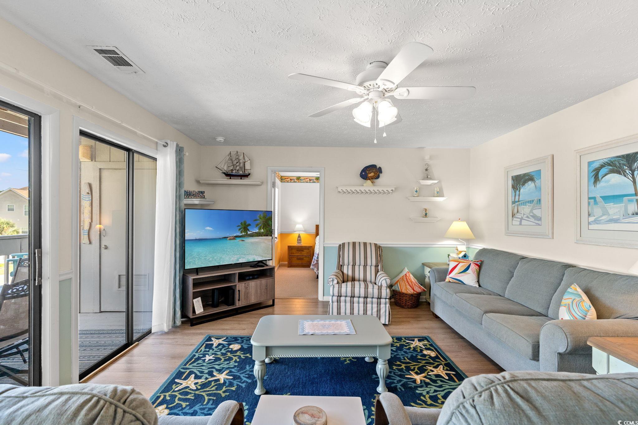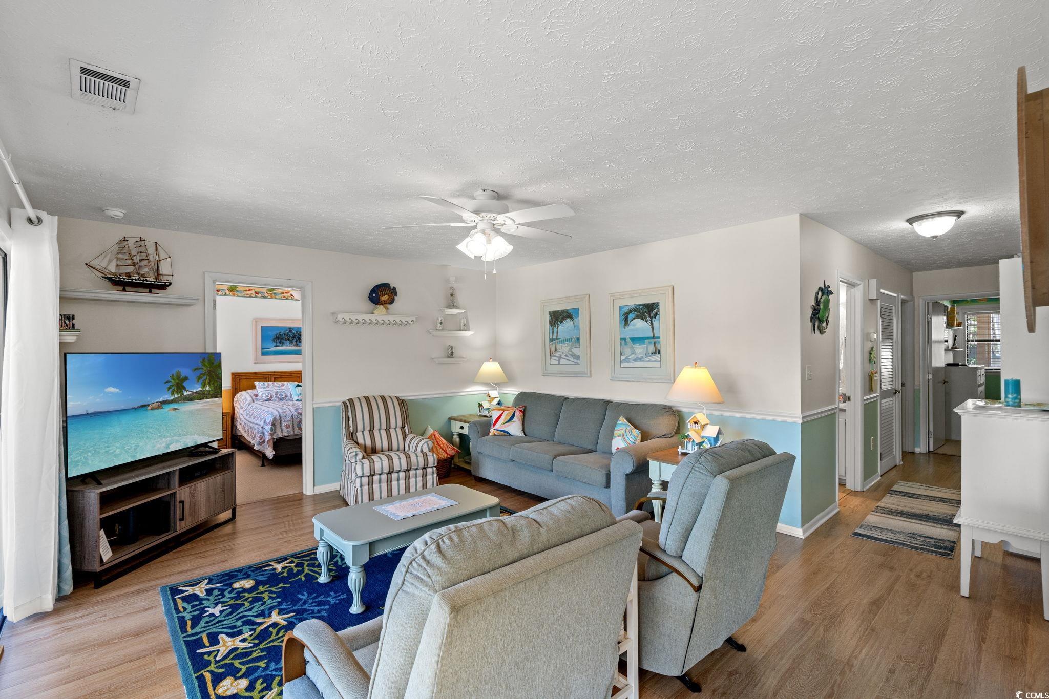 Just one block from the ocean, this beautifully furnished three bedroom, two bath condo offers the kind of coastal lifestyle people dream about when they search for Surfside Beach. Located in the highly sought after Sea Grove Condominiums, this home is tucked beneath mature live oaks and surrounded by lush tropical landscaping, creating a peaceful retreat while still approx. 300 ft. from the Beach. Inside, the condo is bright, open, and truly move in ready. The living and dining areas are filled with natural light and flow seamlessly onto a spacious private balcony where you can feel the ocean breeze and catch a glimpse of the Atlantic. It is the perfect place to enjoy your morning coffee or unwind after a day at the beach. Luxury flooring enhances the main living spaces, while the kitchen and baths feature ceramic tile and the bedrooms offer comfortable carpeting for a cozy feel. The primary suite is generously sized and includes its own en-suite bath, a vanity area, and a large closet, making it an ideal owners retreat. The home also features a walk-in pantry, full size washer and dryer, and both interior and exterior storage closets, which is a rare find in beach condos. Parking is easy and convenient with two assigned spaces, including covered parking under the building, and one space can even be used for your gas golf cart. Sea Grove offers a true resort style experience with a sparkling pool, gazebo, and grilling area that owners and guests love. Whether you are looking for a second home, a primary residence, or a smart income producing vacation rental, this condo checks all the boxes. Its proximity to the beach, Surfside Beach Pier, dining, shopping, golf courses, entertainment, and medical facilities make it highly desirable for both personal use and rentals. This is a property that allows you to enjoy the beach lifestyle today while also making a sound investment in one of the Grand Strands most popular coastal communities. All square footage is approximate and not guaranteed. Buyer is responsible for verification.
