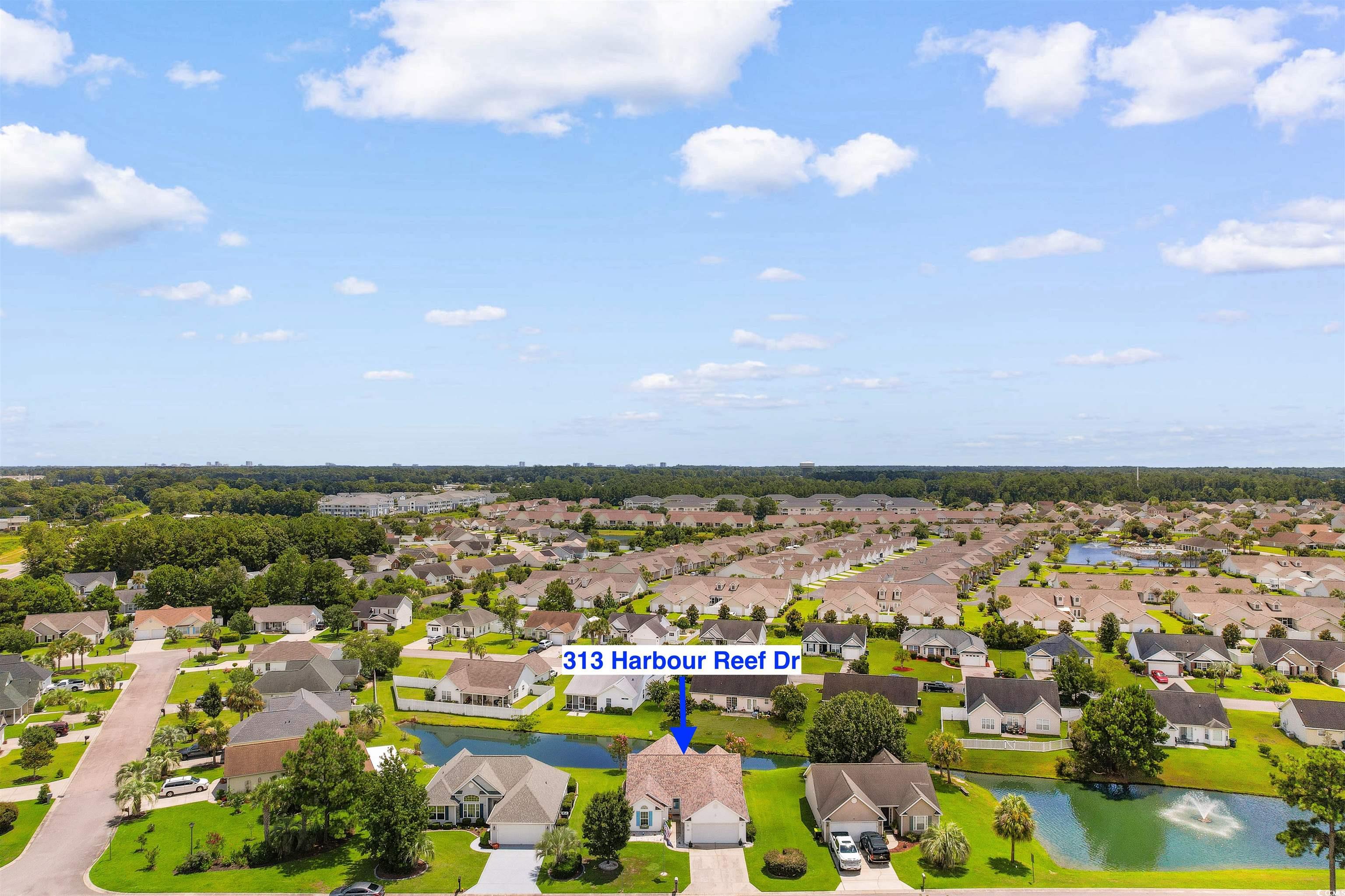 This charming 3-bedroom, 2-bath home offers the perfect blend of comfort, thoughtful updates, and a peaceful pondside settingjust minutes from the beach, Market Common, and a wide range of shopping and dining. Inside, vaulted ceilings and engineered hardwood floors in the main living areas create a warm, open feel, while the kitchen features ample cabinetry and counter space, under-cabinet lighting, a new GE stainless steel refrigerator (12/2023), and a sunlit eat-in dining area. A formal dining room adds even more flexibility for entertaining. The primary suite is a true retreat, featuring vaulted ceilings, a large walk-in closet with attic storage access, and a private en suite bath with a soaking tub. Two additional bedrooms share a second full bathroom with a walk-in shower. These rooms offer flexible space for hosting guests or setting up a home office or hobby area. The enclosed sunroom, overlooking the pond, is perfect for relaxing or entertaining year-round and features new porch screens and tinting (4/2024). Additional highlights include a new roof (10/2021), new AC unit (3/2020), Air Scrubber by ActivePure (2/2025), new washing machine (7/2025), updated fire alarms (2017, with annual battery replacement), fresh air filter (2/2025), and a two-car garage with overhead attic storage. Located in the desirable Peninsula at Palmetto Pointe, this home combines peace, convenience, and pride of ownershipideal as a full-time residence or coastal retreat.