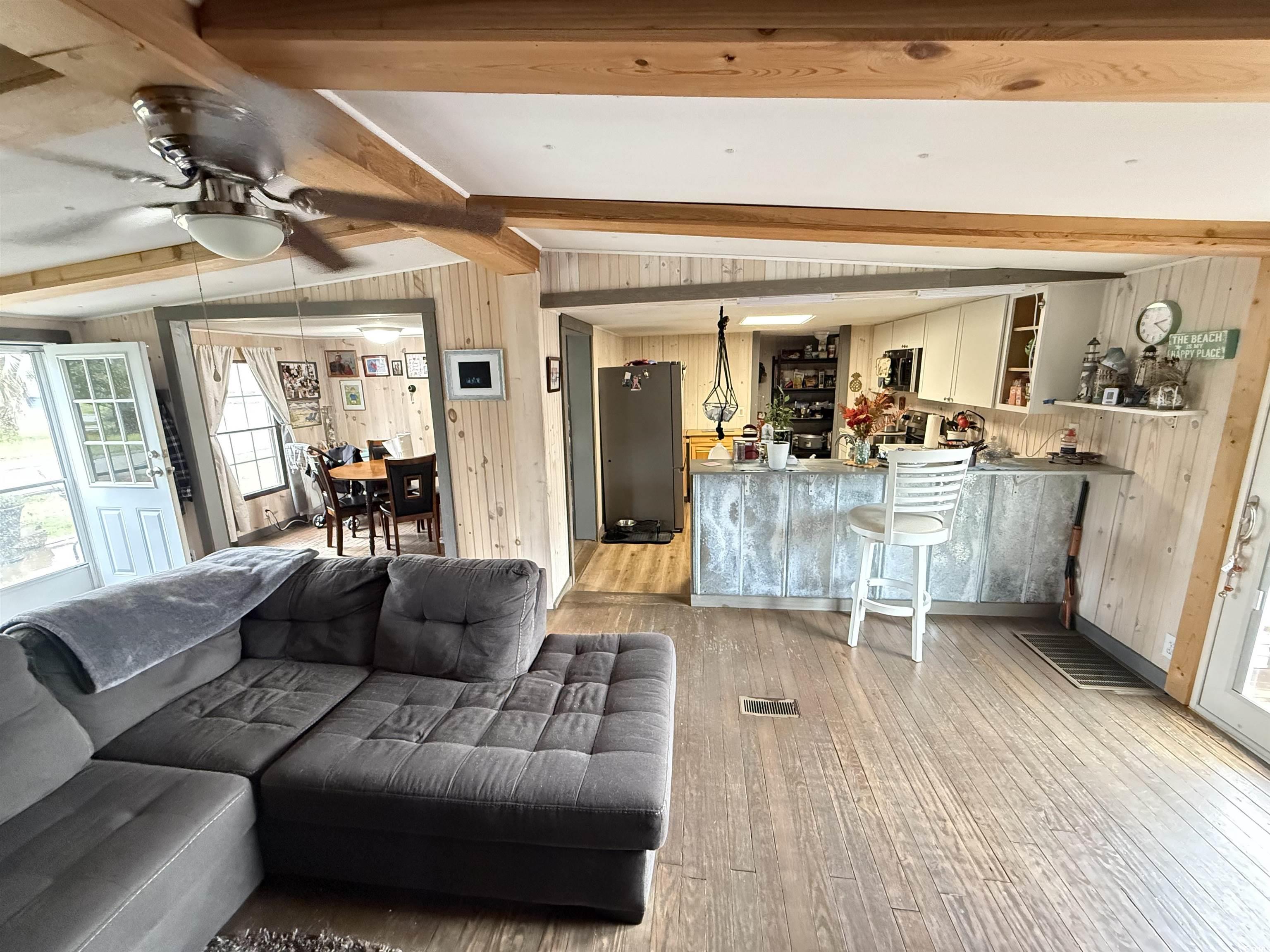 FamilyRoom: BeamedCeilings, CeilingFans, Fireplace