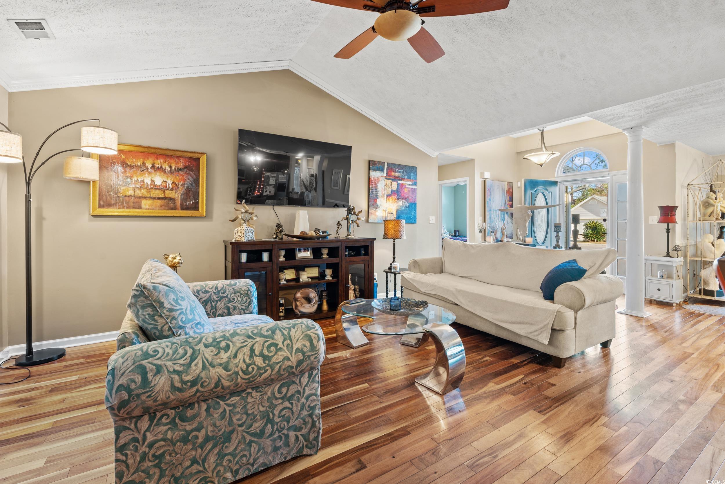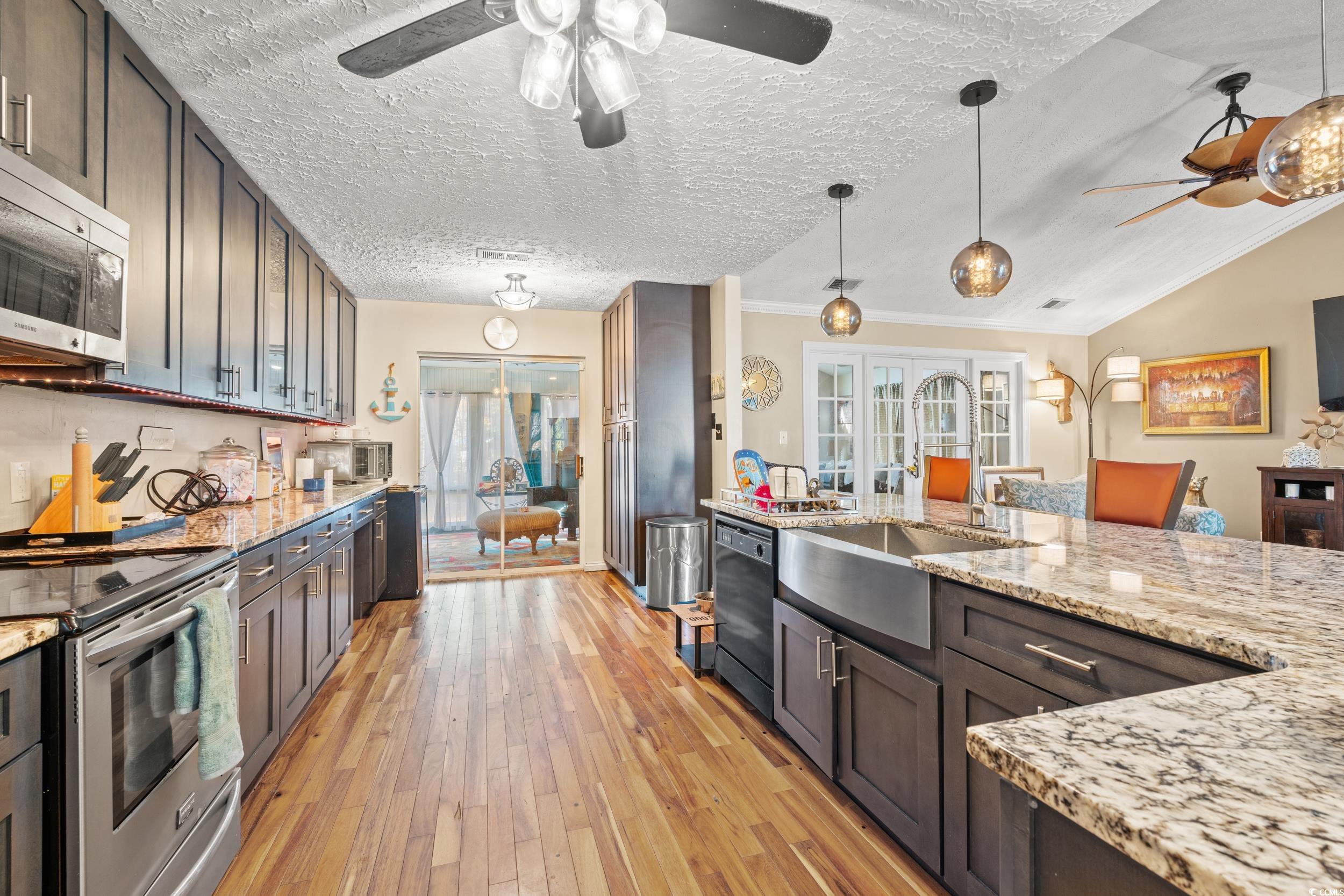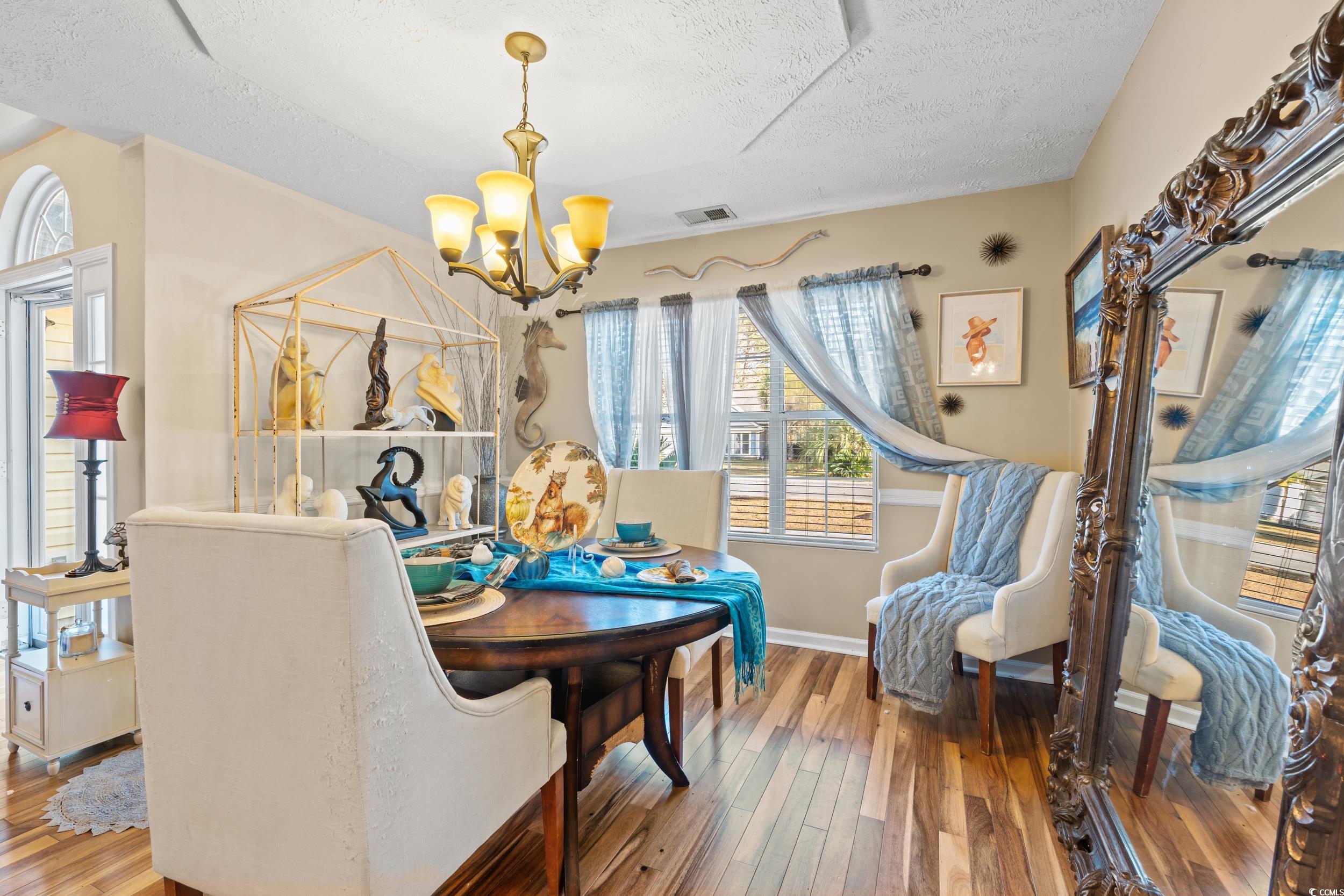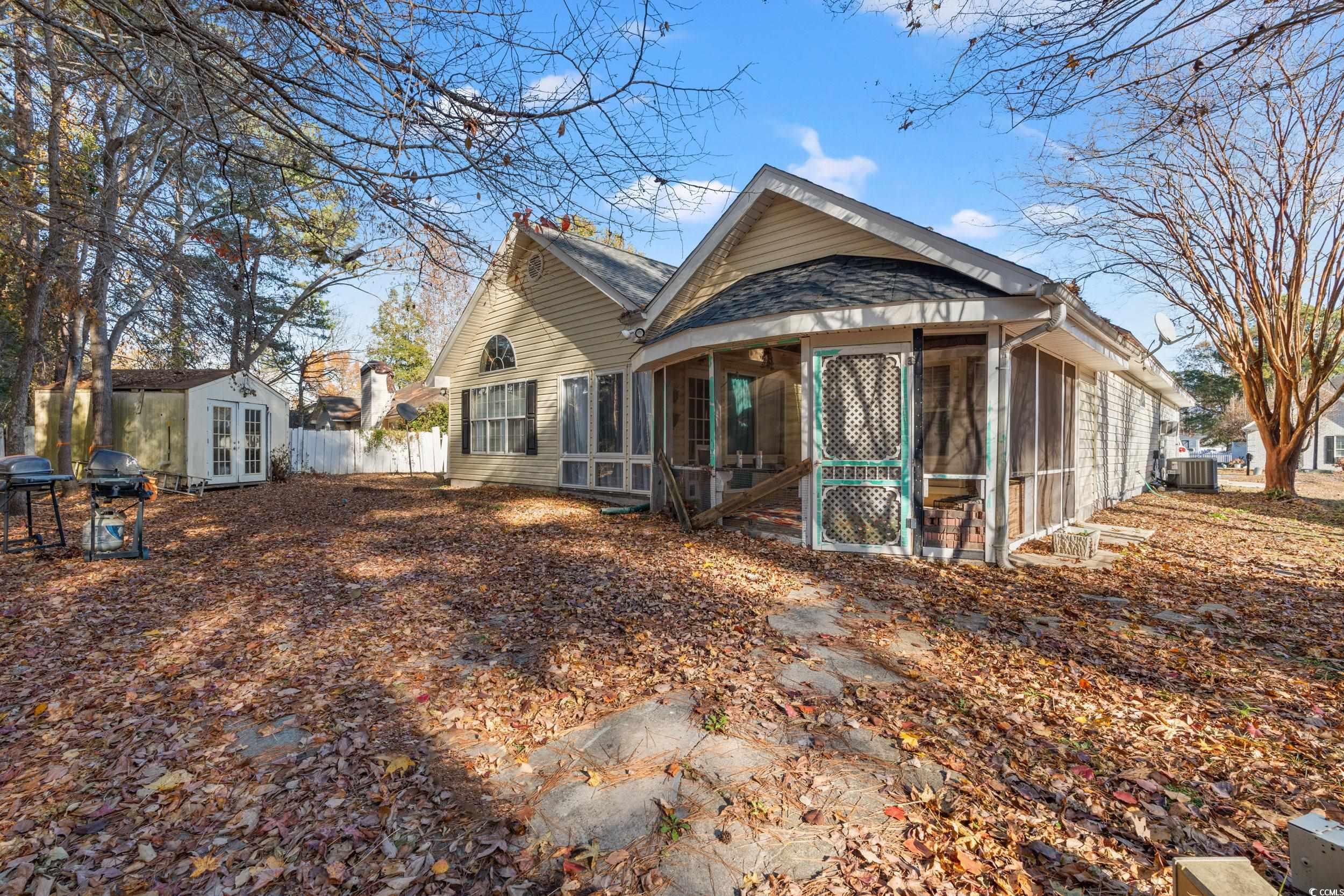 Discover this charming and spacious 3-bedroom, 2-bathroom home located in the highly desirable Hidden Woods Subdivision. With over 2,200 heated square feet, an attached 2-car garage, and thoughtful upgrades throughout, this property offers comfort, style, and functionality. A new roof installed in 2022 adds peace of mind, while the open floor plan is perfect for modern living. The dining room and master suite feature elegant tray ceilings, adding a touch of sophistication. Gorgeous real hardwood floors flow through the dining room, living room, and kitchen, enhancing the homes warmth and appeal. The kitchen is a chefs dream, with custom-built cabinets providing ample storage, a pantry cabinet, wine cooler, and a convenient desk area. New granite countertops, a farmers sink, and stylish pendant lighting over the bar (which seats 4-6) make this space both functional and inviting. The formal dining room, highlighted by striking columns, offers a separate yet connected feel to the living room. The spacious master suite easily accommodates a king-size bed and full bedroom set. The recently remodeled master bathroom boasts a tiled shower, double vanity, separate makeup area, new mirrors and lighting, and a custom overhead light/fan with Bluetooth capability. Two additional generously sized bedrooms, separated by a full bathroom, are located on the opposite side of the house, ensuring privacy. The vaulted-ceiling living room leads to a large bonus room that can serve as a 4th bedroom, home office, or Carolina Room. Step outside to enjoy the tiled, screened sunroom with a vaulted wooden ceiling, ceiling fan, and built-in waterfall, offering a relaxing retreat year-round. Adjacent to the sunroom is a screened lanai, perfect for entertaining or unwinding. The quarter-acre lot features a spacious backyard with plenty of room for outdoor activities, barbecues, and gatherings. A storage building in the backyard can be used as a playhouse, man cave, or additional storage space. The driveway accommodates up to 4 vehicles, making parking convenient for family and guests. With easy access to Hwy 544, Hwy 31, and Hwy 707, and just a few miles from the beach, shopping, and dining, this home perfectly balances tranquility and accessibility. Schedule your showing today to see everything this beautiful home has to offer!
