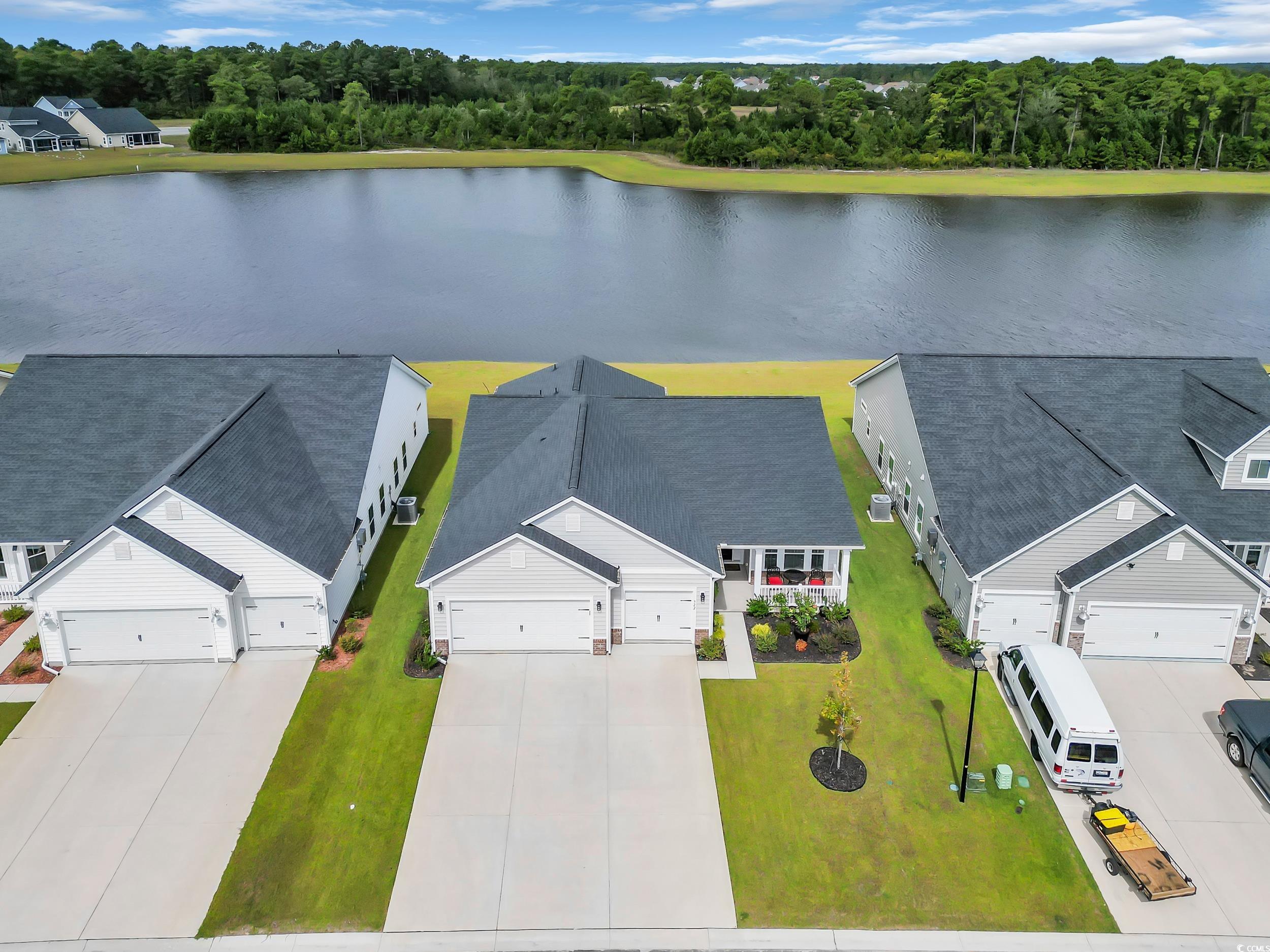 Immaculate pond view home with 3-car garage and thoughtful upgrades. Enjoy stunning lake views from this newly built 3 bedroom, 2 bath home featuring a spacious 3 car garage and numerous upgrades. Step inside to find LVP flooring in the main living areas and carried through the primary suite, offering both durability and style. The open concept floor plan is perfect for entertaining, with large windows framing the serene water views. The modern kitchen features quartz countertops and stainless appliances. Practical upgrades make this home better than new and truly move in ready with epoxy coated garage floors, added cabinetry in the laundry room, drop-down attic stairs and a full sprinkler system for easy lawn maintenance. Relax or host guests on the extended back patio, ideal for enjoying peaceful mornings or evenings by the lake. This home combines luxury, practicality and comfort offering the perfect balance for everyday living.