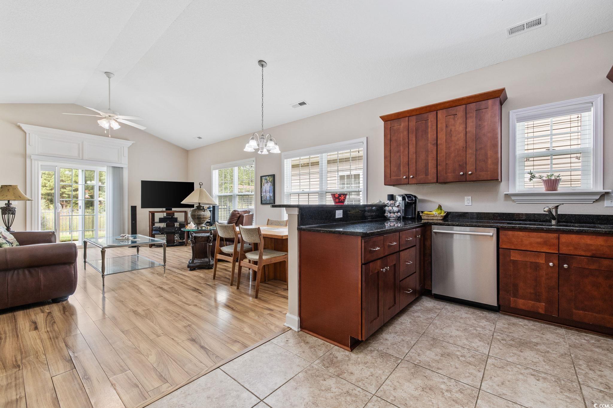 Welcome to this charming 3-bedroom, 2-bath home located in the desirable Palm Cove community! Step inside to find a bright and open floor plan featuring vaulted ceilings in the living room and kitchen, LVP flooring in the main areas, and tile in the kitchen and hallway. The kitchen boasts granite countertops, stainless steel appliances, and plenty of cabinet space. The spacious master suite offers a tray ceiling and peaceful pond view. Enjoy relaxing or entertaining on the outdoor patio overlooking the fenced-in backyard. Additional features include ceiling fans in every bedroom and the living room, laundry hookups in the 1-car garage, and carpeted bedrooms for comfort. Conveniently located just off Hwy 17 Bypass, south of the Farrow Parkway entrance to Market Common, this home offers easy access to shopping, dining, and the beach.