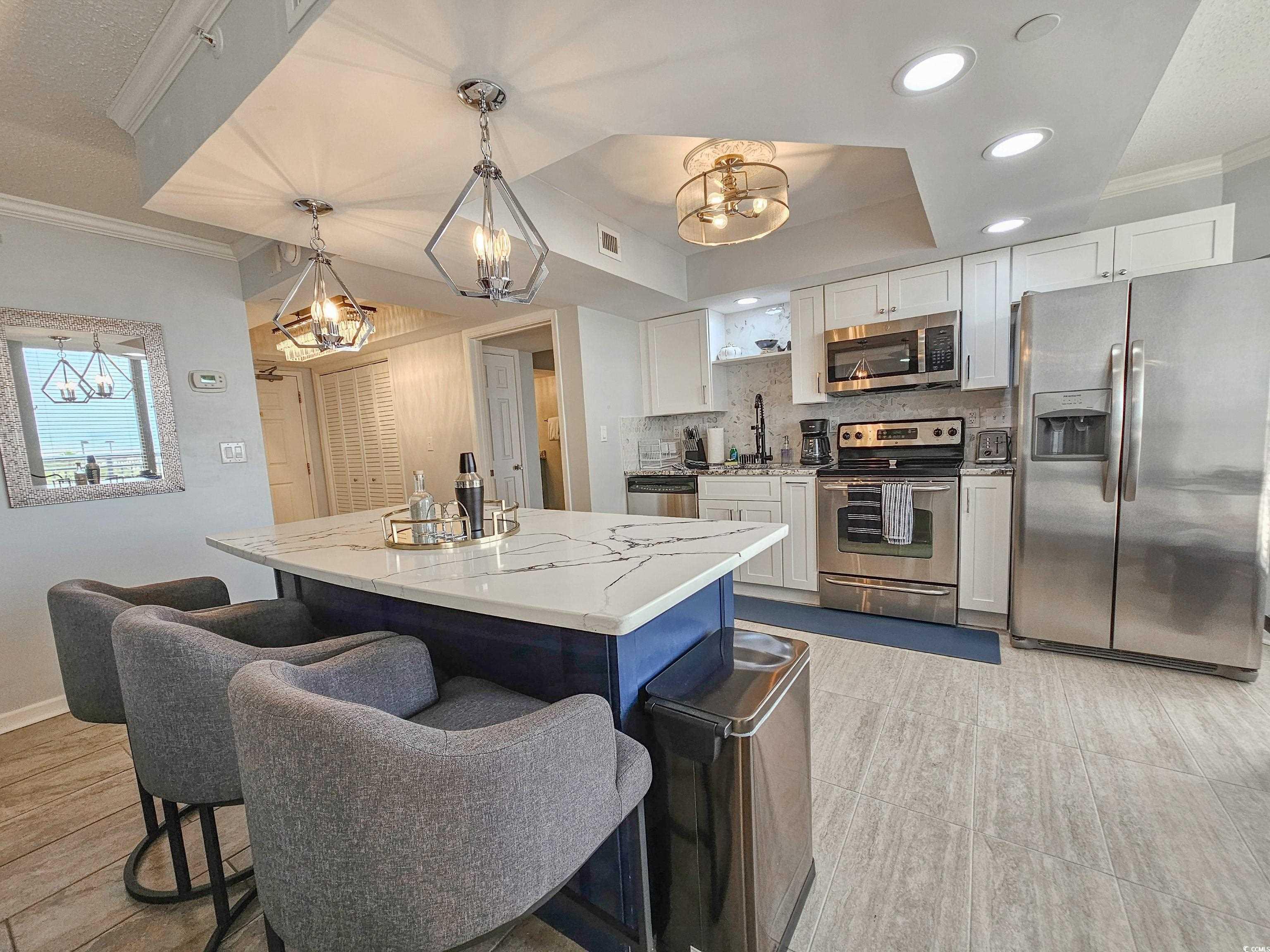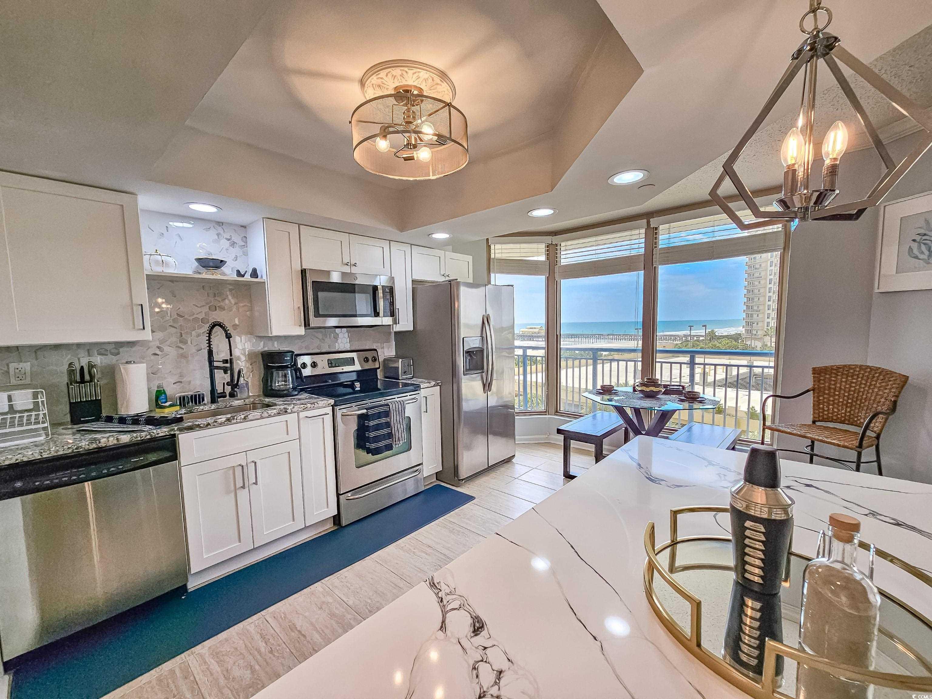 LUXURY ON A LOW FLOOR! This residence was completely remodeled, converting it from a two bedroom to a three bedroom, open concept floorplan. Modern pendant and overhead lighting beams down to showcase contrasting cabinetry with granite and quartz countertops, a pearlescent hexagon tile backsplash and stainless-steel appliances. Natural light pours into the home to reveal the many wonderful features of this cozy, yet spacious, condo an electric fireplace with custom wood mantle, updated furnishings, matching wood-look ceramic tile throughout, new cabinetry with granite countertops and lighting in both bathrooms with a large walk-in shower in the master bath. Don't think because it's on the third floor that you are sacrificing views! You will enjoy great ocean, pool and courtyard views from inside the home, as well as outside from the expansive deck that stretches from the living room to the master bedroom. There are probably many more features that aren't mentioned, so be sure to watch the virtual tour video included with the listing. Kingston Plantation is a 145-acre, master planned community in the heart of Myrtle Beach. Kingston offers a combination of amenities and preserved natural environment that's unparalleled. One-half mile of white sand beach, 12 acres of freshwater lakes and mature trees, all surrounded by beautifully manicured grounds. The Plantation offers amenities such as a magnificent Spa and Fitness Center, four clay and hard surface tennis courts, four pickleball courts, twelve pools, badminton, croquet, beach volleyball and much more! Kingston offers a selection of one, two, three and four bedroom villas, townhomes, lakefront lodges and oceanfront high-rises through the community.