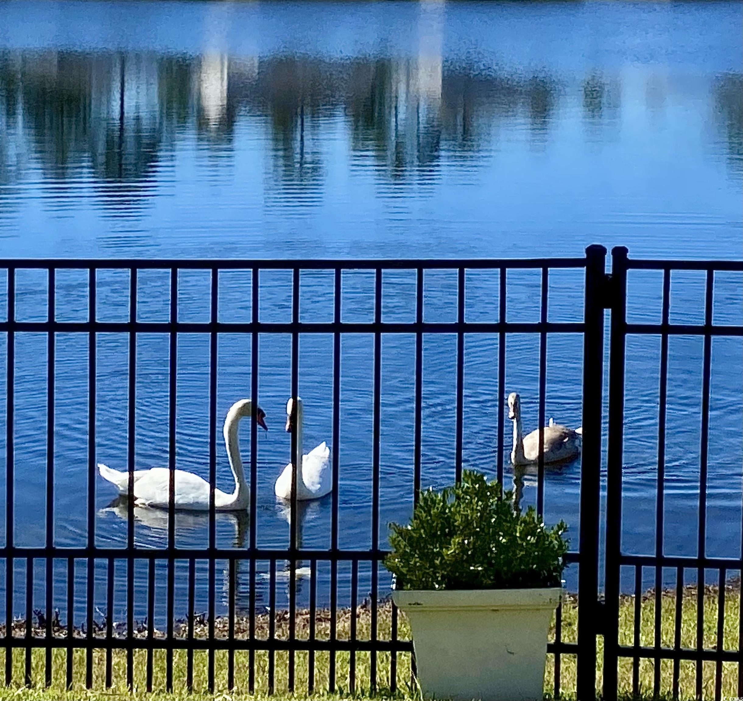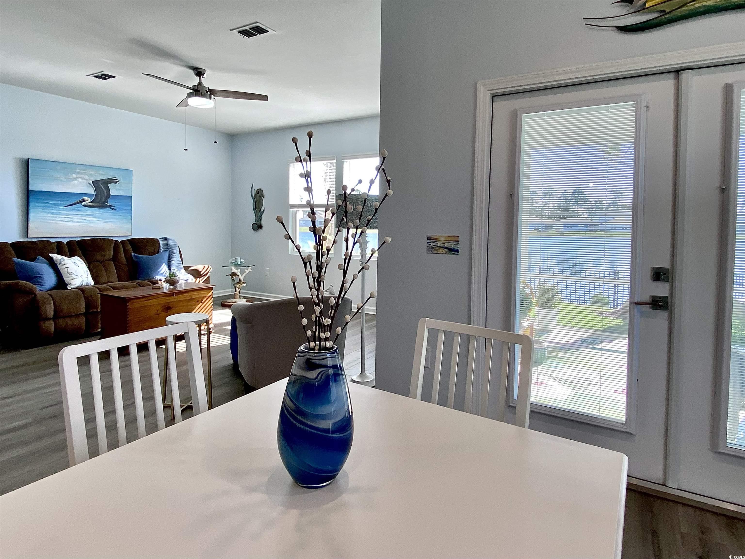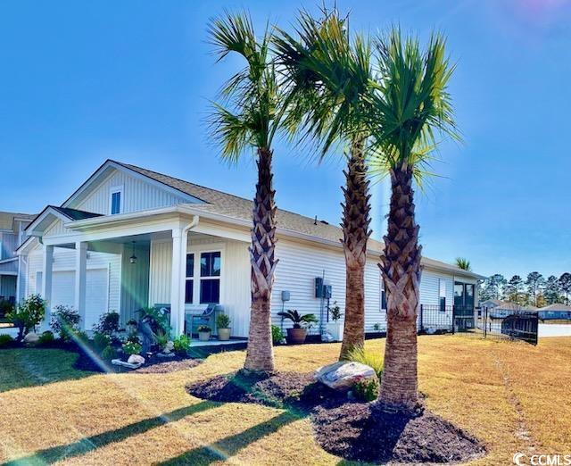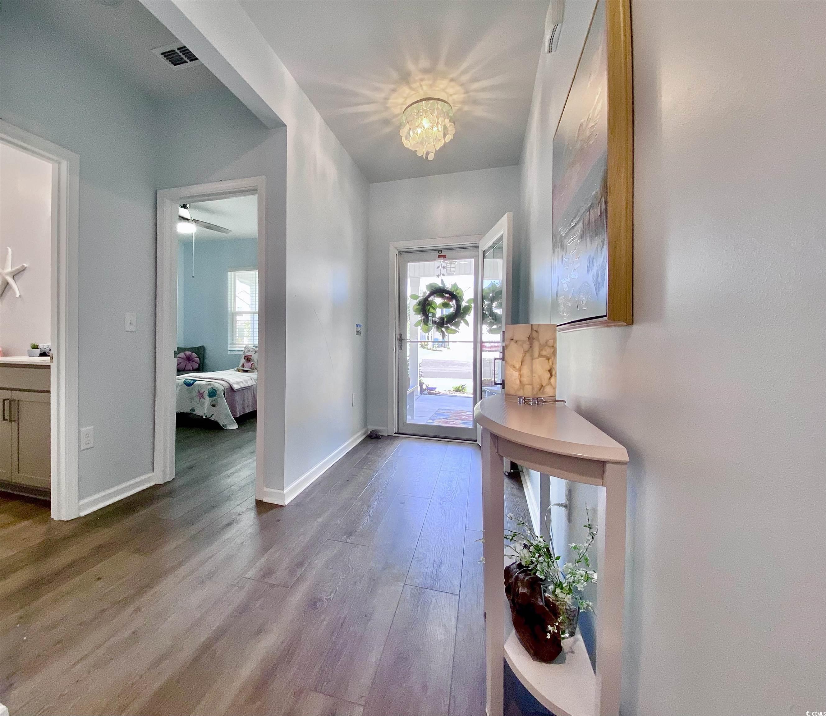 This beautiful home is less than one year old, on a waterfront lot with abundant upgrades inside and out already done for you! Watch the sunrises and sunsets over the large pond as well as the swans, ducks, egrets and turtles, not just from your windows but also from you screen porch and patio! Enjoy shade provided by eight palm trees (Palmetto & Pindo). New mulched beds with roses and other flowering plants surround the house. And don't worry about watering the lawn or flowers as your Hydrawise Irrigation System which senses when to water will take care of it for you. A seamless gutter system protects your home from the rain and new outdoor brass light fixtures brighten your garage and porch. A black aluminum fence frames the back yard, allowing full view of the pond and providing a safe play area for small children and dogs. Enter your home through the new decorative full light front door. Inside, cleaning is simplified by LVP flooring throughout - no carpet! All bedrooms and living room have new lighted ceiling fans with updated coastal lighting in the dining area and entry. Additional lighting has been added to bathrooms. Bath fixtures have been upgraded to comfort height toilets and high arc faucets in all sinks. New mini blinds between glass have been added to patio doors for privacy when desired. Cooking is made easier with under cabinet lighting and cabinet organizers in all base kitchen cabinets. The entire interior of the house has been painted a soft coastal blue and even the garage is finished, painted and has added overhead lighting. All of these upgrades are in addition to quartz countertops in the kitchen and bathrooms, all stainless-steel kitchen appliances, natural gas heat, stove and tankless Rinnai water heater. This lovely home is move in ready with all of the hard work done.