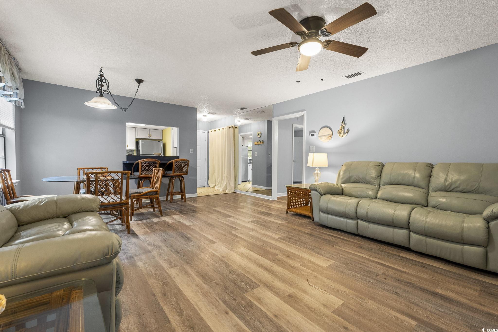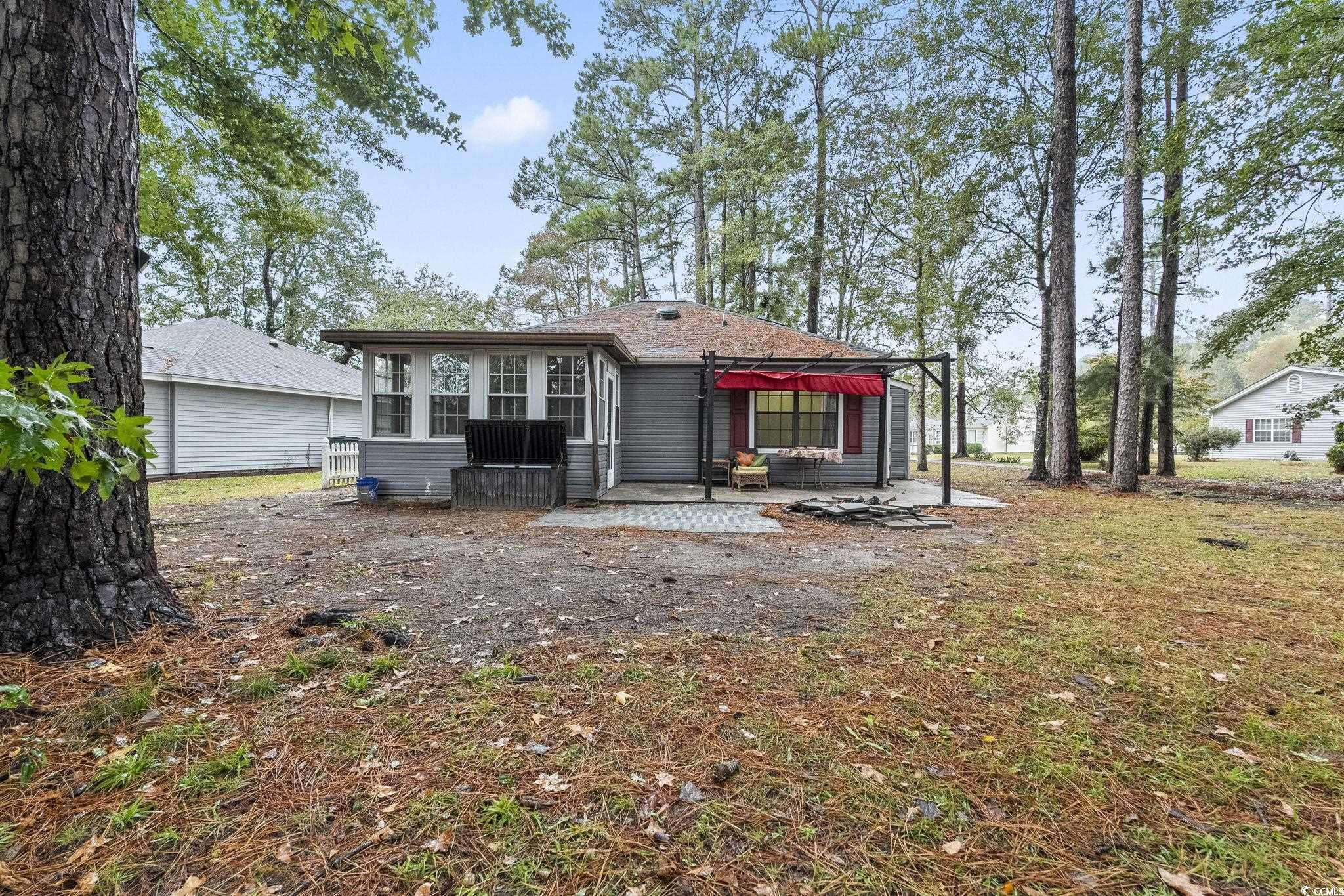 This well-maintained 2-bedroom, 2-bath home offers a bright, open-concept layout and welcoming curb appeal. The spacious kitchen features stainless steel appliances, white cabinetry, granite countertops, and a stylish tile backsplash. Abundant natural light fills the living areas, especially the sunroom, which overlooks a peaceful wooded backyard and the former golf course. Enjoy outdoor living year-round on the large front porch with an extendable awning or relax on the back patio beneath the cheerful red pergola. Located in the gated Myrtle Beach Golf & Yacht Club community, residents enjoy access to a wide variety of amenities, including a clubhouse with indoor and outdoor gathering spaces, swimming pool with outdoor spa, picnic area, tennis courts, shuffleboard courts, and scenic walking and biking trails. There is also a designated area for RV and boat storage, offering convenience for those who love to explore.