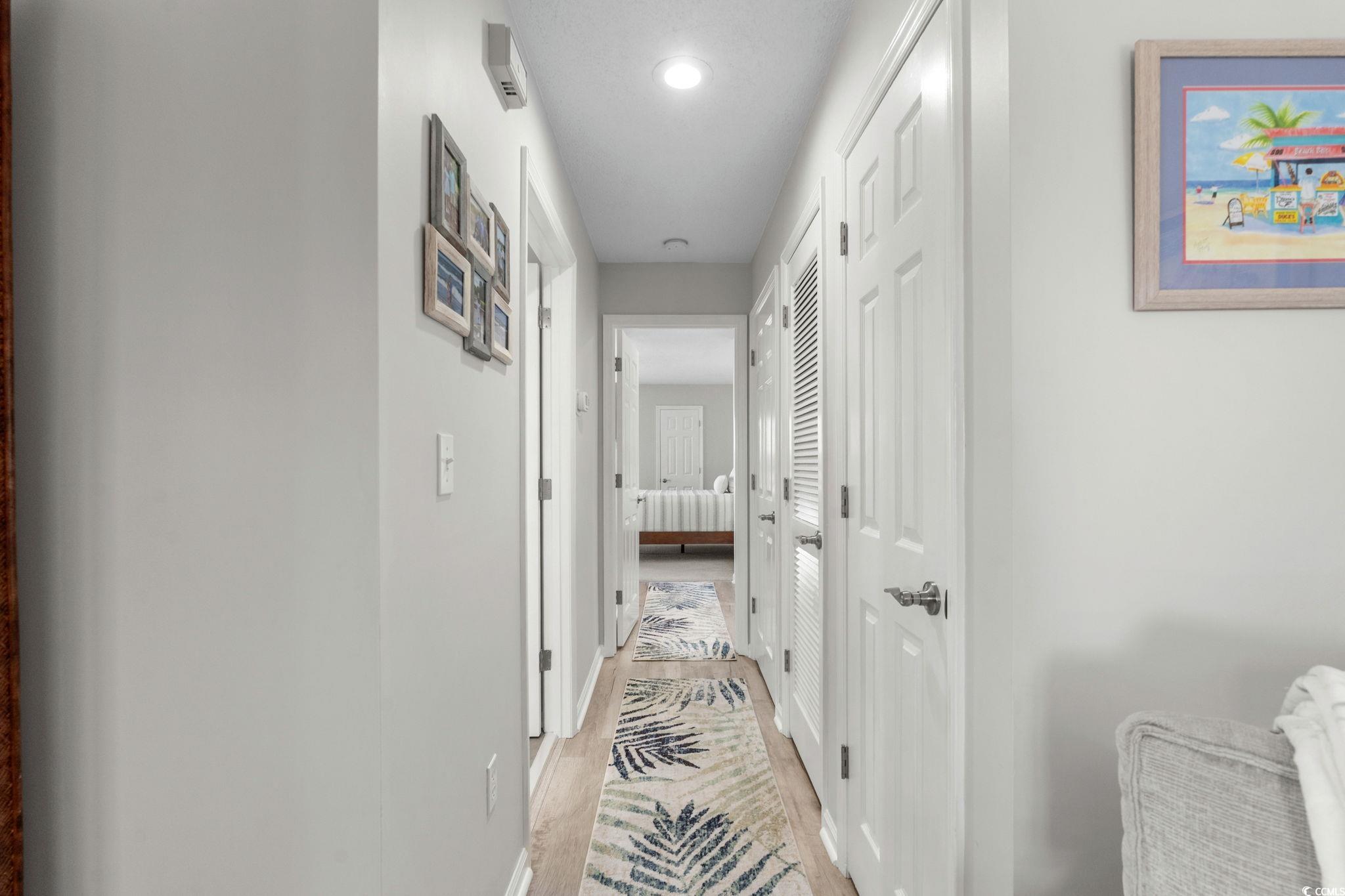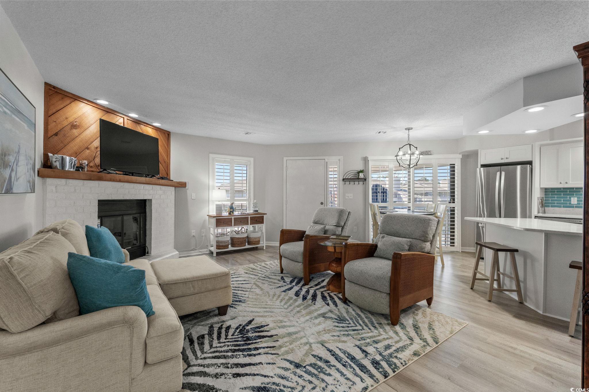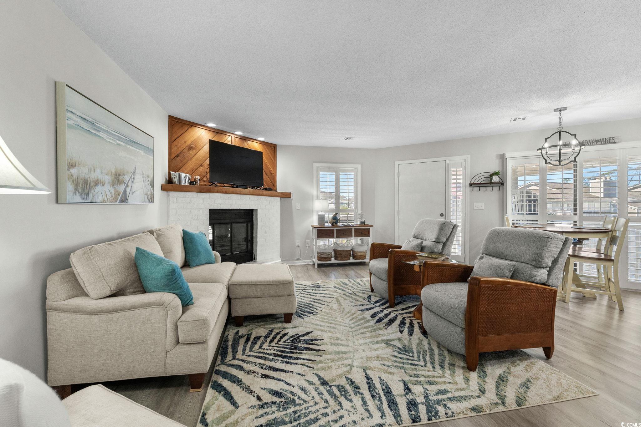 This beautifully renovated Tilghman Lakes 2 bedroom, 2 bath condo offers a modern coastal retreat just steps from the beach in the highly desirable Ocean Drive section of North Myrtle Beach. Located east of Hwy 17 and on 2nd row, this property provides easy access to the sandy shores of the Atlantic. The condo features 1,152 heated sqft and is being sold fully furnished and move-in ready. The condos entrance provides a nice-sized balcony with Adirondack style chairs overlooking the lake and pool. Inside, new luxury vinyl plank flooring runs through the living room, dining area, kitchen, and hallway, with new Gyp-Crete underlayment added beneath for enhanced soundproofing and fire resistance. Other new upgrades include plantation shutters on all windows and the dining areas glass sliding door, new doors and hardware, and energy-efficient LED lighting throughout. The kitchen has been completely updated with soft-close white cabinetry, Quartz countertops, a beach-inspired teal subway tile backsplash, canless LED ceiling lights, and under-cabinet lighting. New stainless-steel appliances include a French-door refrigerator, dishwasher, range, and microwave. The spacious family room centers around a painted white brick fireplace with an electric fire insert, which could be converted back to wood-burning use with HOA inspection approval. The condo features dual primary suites, each with private access to a rear 2nd balcony also overlooking the community pool and lake. Both suites have new carpeting in the bedrooms and new ceramic tile flooring in the bathrooms. Both bathrooms have been fully updated with new comfort-height vanities, dual-flush toilets, and Bluetooth-enabled exhaust fans. The middle bathroom features a double-sink vanity, beautifully tiled walk-in shower with modern glass doors, while the rear bathroom includes a single-sink vanity and a new vinyl tub/shower combination insert. The hallway laundry closet includes a stacked washer and dryer. Amenities include a large community pool, pool deck and hot tub all overlooking the lake, as well as outdoor grilling areas. Golf carts are permitted for both owners and renters. Pets and motorcycles are allowed for owners only. Both Long-term and Short-term rentals are allowed. The buildings roof was replaced around 2016, and the condos water heater was refurbished in 2021 with new thermostats and heating elements. Parking includes one designated space under the building with ample additional unmarked spaces available throughout the complex. A large storage unit on the ground level offers room for beach gear and personal items. The condo also includes a transferable, upgraded 2-10 Home Buyers Warranty valid through mid-August 2026 and a Wi-Fi thermostat for convenient comfort and control. HOA fees include building insurance, water/sewer, common area maintenance, basic cable, pool maintenance, landscaping, property management, and trash pickup. Owners are responsible for interior (HO6) insurance. Come see this beautifully renovated condo in a prime location between the Ocean Drive and Cherry Grove sections that is so close to everything North Myrtle Beach has to offer: shopping, restaurants, entertainment, shag dance clubs, and dont forget the amazing sandy beaches of the Atlantic Ocean!