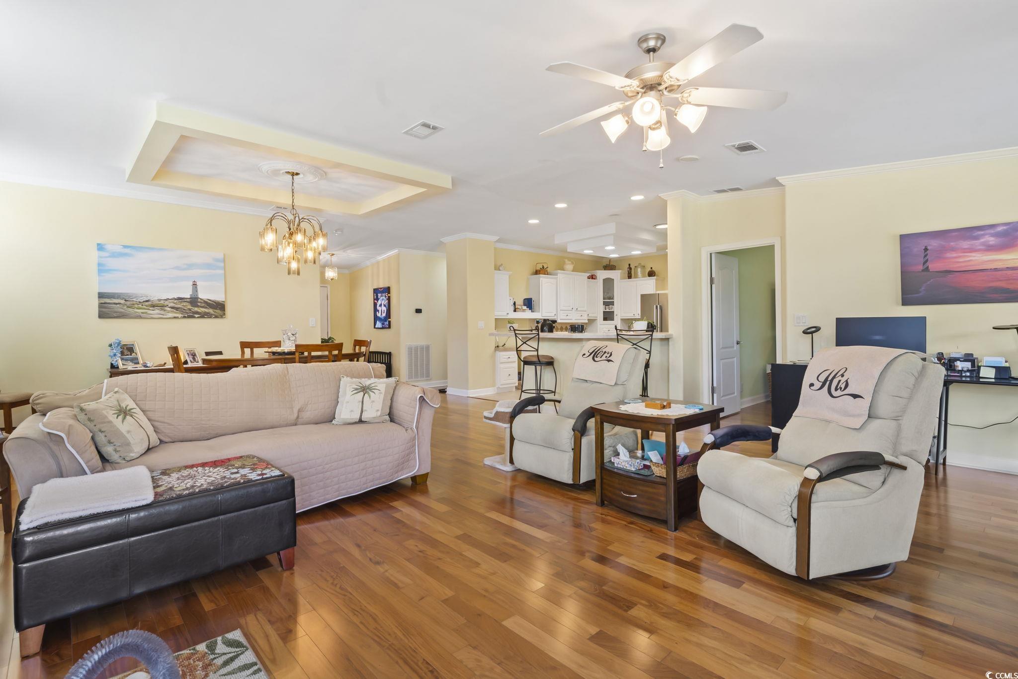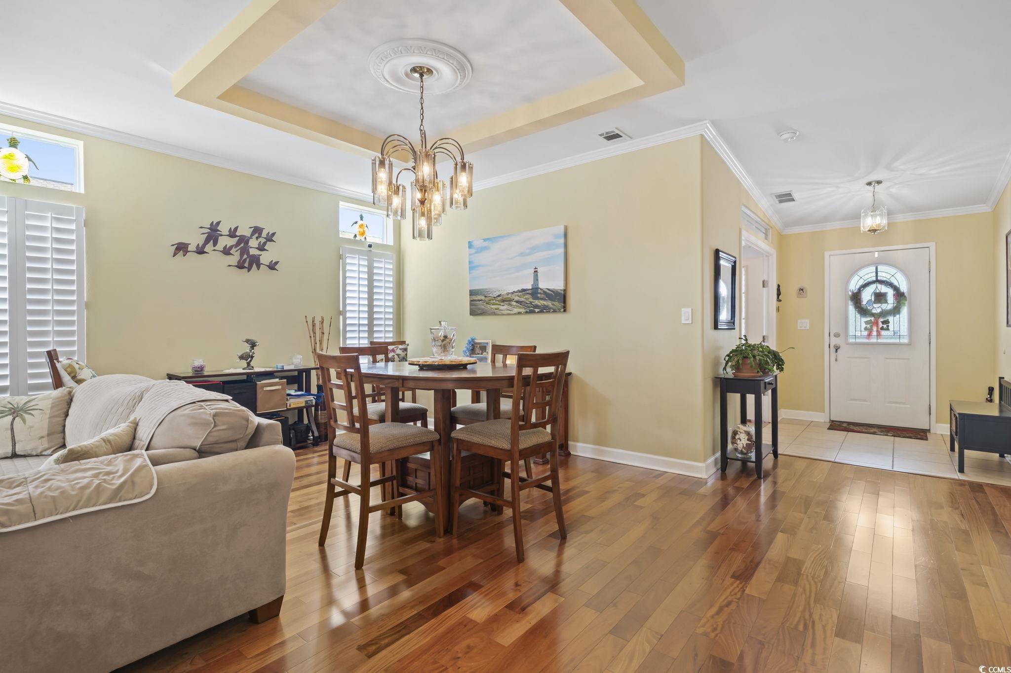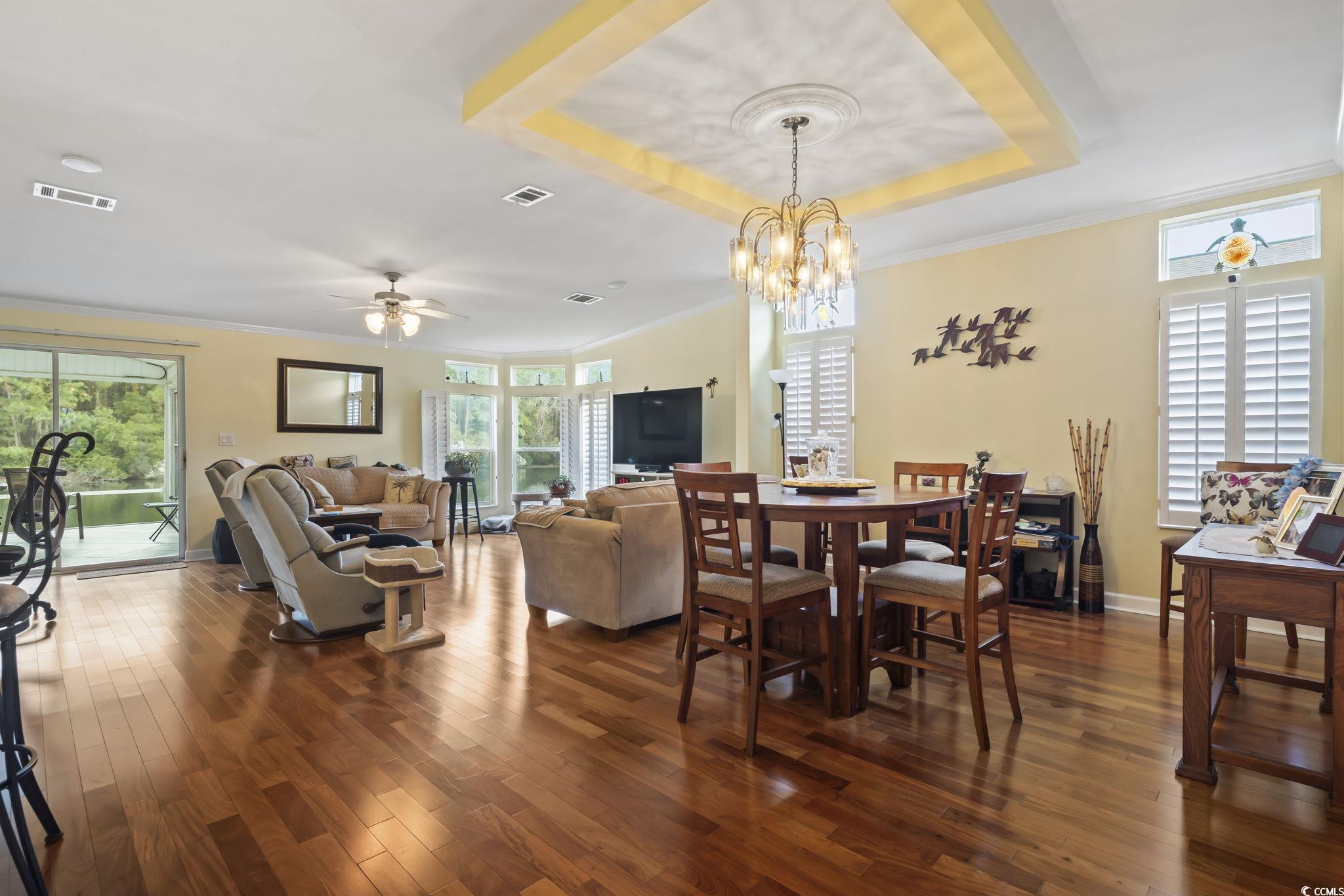 Welcome home to this beautifully maintained 3 bedroom, 2-bath single-level home in the desirable Lakeside Crossing community. Thoughtfully updated and move-in ready, this property combines comfort, charm and modern convenience just minutes from the beaches, shopping, and dining of the Grand Strand. Step inside to discover gleaming wood flooring, plantation shutters, and solar tubes that fill the space with natural light. The open floor plan flows effortlessly from the spacious living room to the dining area and kitchen-perfect for everyday living or entertaining friends and family. The kitchen is equipped with stainless steel appliances, including a new LG refrigerator (2025), dishwasher (2023), and washer & dryer (2023). Enjoy peace of mind with recent major updates- roof 2019 and HVAC 2024. Relax in the Carolina sunshine from your screened in porch or patio while taking in the serene pond view framed by beautiful mature trees- a perfect backdrop for your morning coffee or evening unwind. The professionally designed landscape curbing adds a polished touch to the exterior, enhancing the home's curb appeal. Located in the award-winning 55+ Lakeside Crossing community, residents enjoy resort-style amenities including indoor and outdoor pools, clubhouse, fitness center, tennis and pickleball courts, and countless social activities. Lot fee covers mowing, edging, trash, lot taxes and full amenities access. DON'T WAIT! Schedule your showing today!