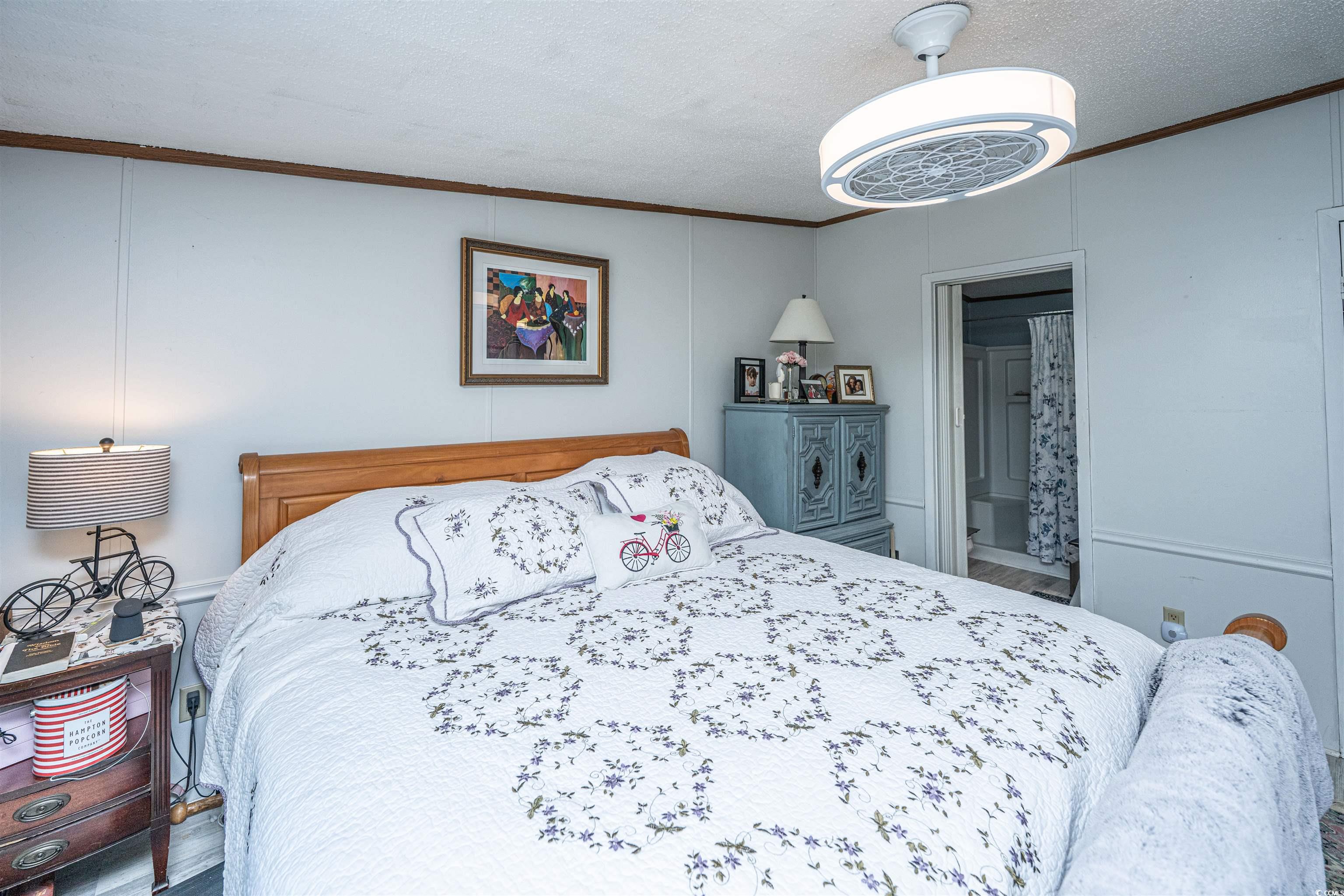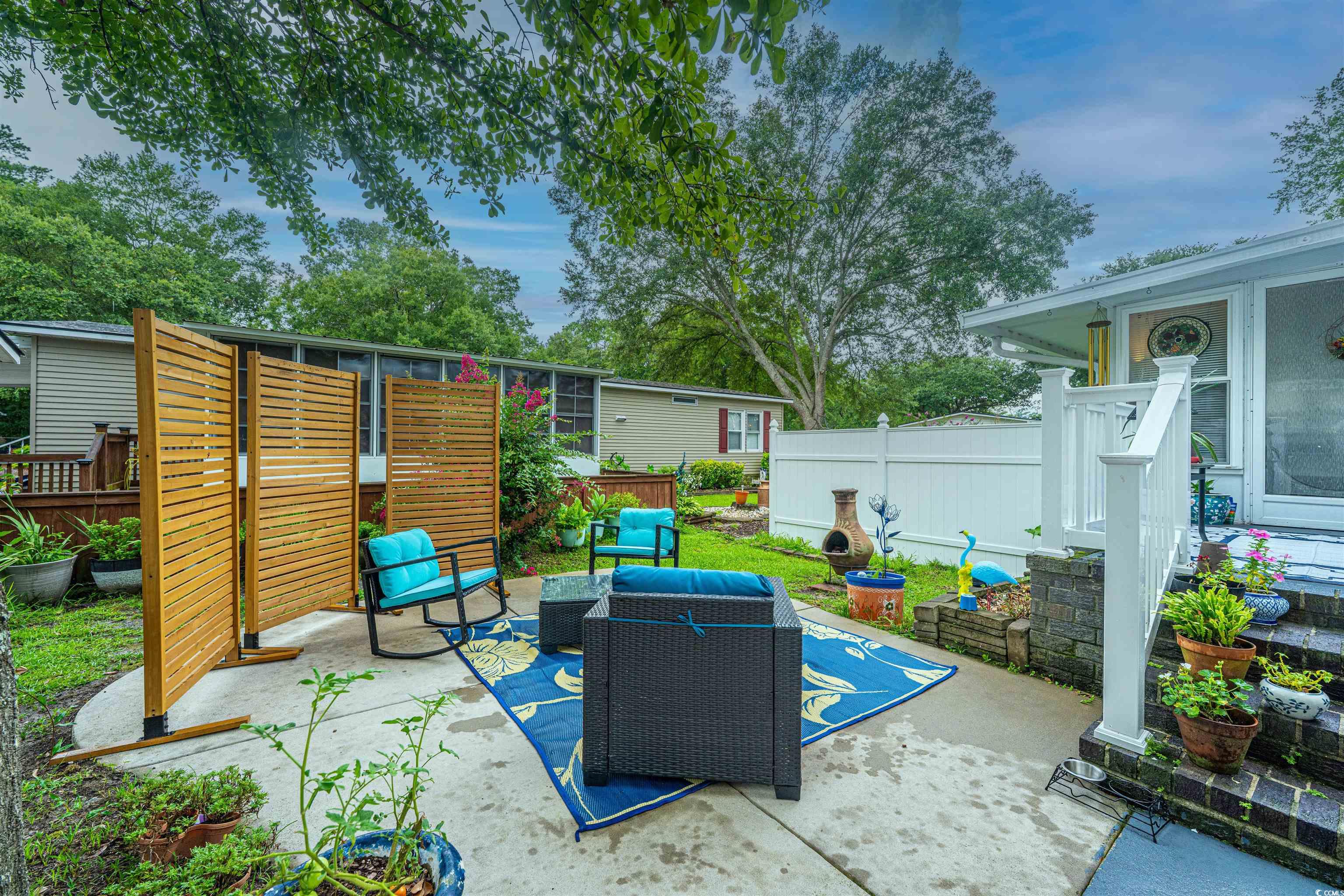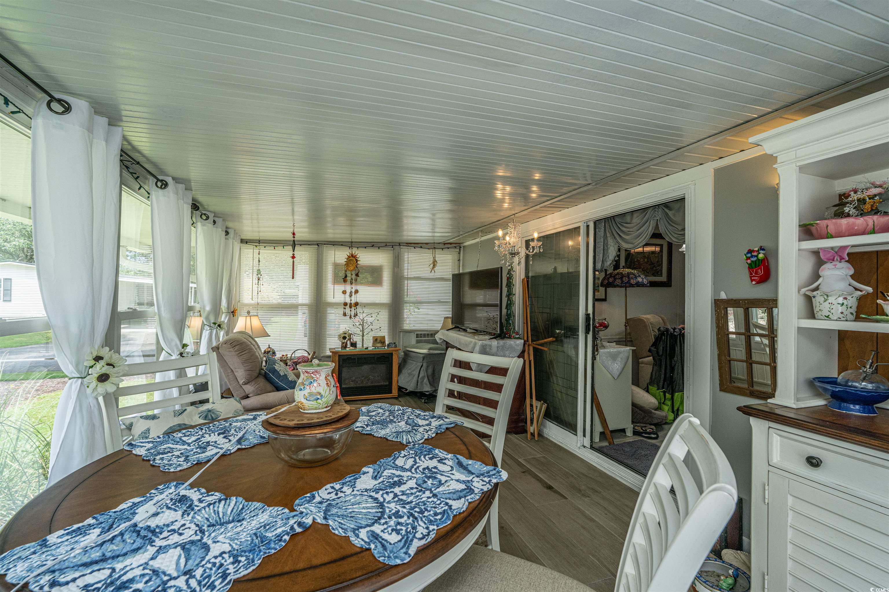 Welcome to Southern Palms, a gated 55+ community in Ladson offering a peaceful, active lifestyle. Here, you own your beautifully remodeled manufactured home while leasing the land. This home was completely renovated in 2017 with additional upgrades in 2024 including HVAC, flooring, countertops, appliances plumbing, electrical, and garage door. Step inside to an inviting open floor plan where a spacious living room flows seamlessly into the updated kitchen and dining area. The private primary suite is thoughtfully separated from the two guest bedrooms and full bath, offering comfort and privacy. Enjoy your mornings on the covered front porch or relax year-round in the all-seasons sunroom. The fenced backyard features a patio designed for both quiet moments and entertaining. Residents of Southern Palms enjoy a variety of amenities: a sparkling pool, putting green, fitness room, billiards, and scenic walking paths around the community pond.