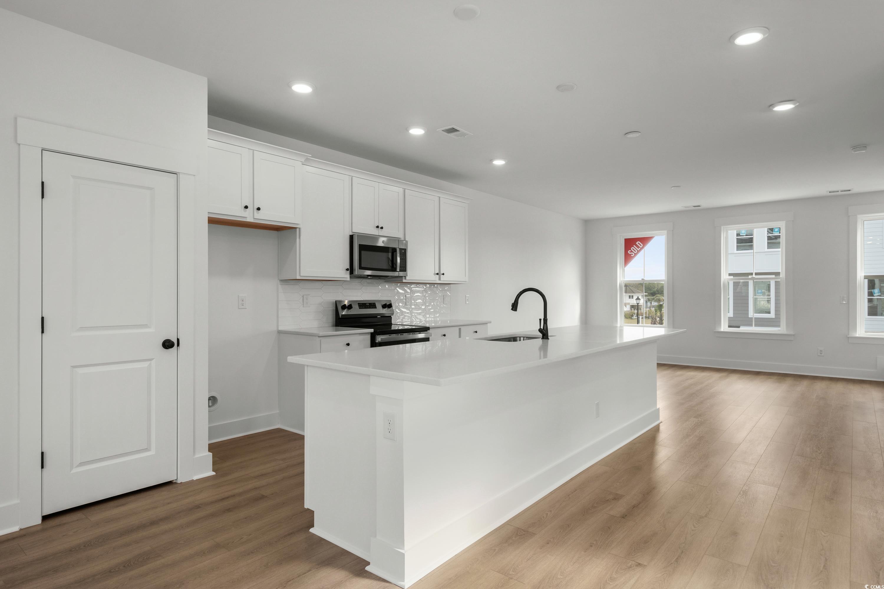 MOVE IN READY! Discover the Brookgreen, a modern three-story 4 bedroom multilevel condo designed for flexible living. The main level features an open-concept kitchen with a large quartz countertop island overlooking the breakfast area, flex space, and family room. Upstairs, the primary suite includes two walk-in closets, dual vanities and an oversized tiled shower, with two additional bedrooms nearby. This home has been thoughtfully curated with black plumbing and hardware throughout. The entry level offers a guest suite for added convenience! LOCATION! LOCATION! The only new low maintenance multilevel condo community in Little River with direct access to marinas, restaurants, and more! Seabreeze Crossing is just steps from the Intracoastal Waterway and only minutes from the beaches of North Myrtle Beach. Featuring 56 beautifully designed homes, Seabreeze Crossing combines coastal charm, low-maintenance living with low condo fee, and an unbeatable locationideal for full-time residents, second-home buyers, or anyone seeking a relaxing beach retreat. *Photos are of actual home