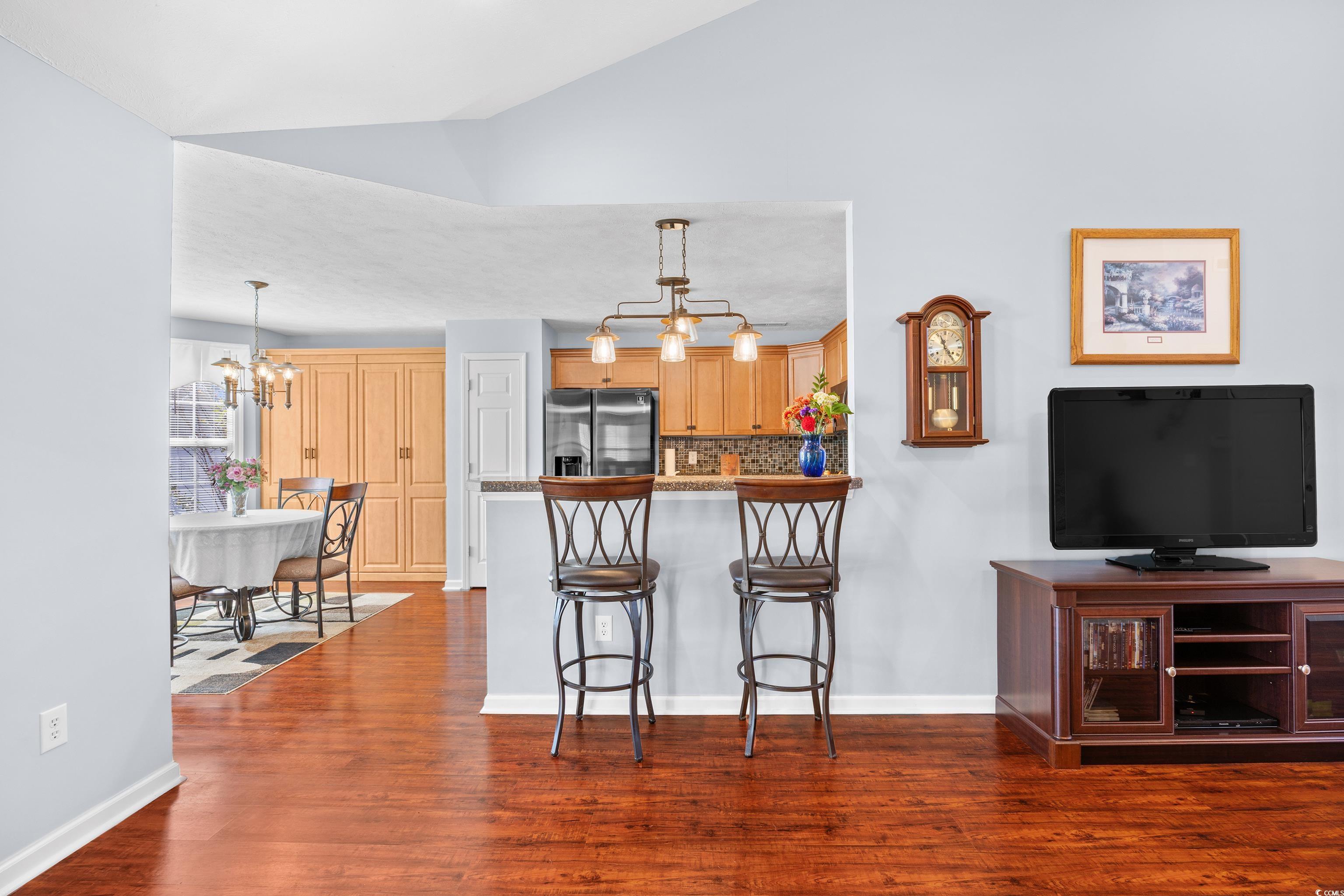 Don't miss out on this meticulously maintained home, offering 3 bedrooms, 2 baths, flex room and 4 season Carolina Room. It's located in The Highland Woods community within close proximity to shopping, medical facilities and all that Myrtle Beach has to offer. The beautifully landscaped yard presents with lovely curb appeal. Pride of ownership is evident from the moment you drive up. When entering the home, you will notice the vaulted ceilings, soothing paint choices and and an abundance of natural light filling the home. A split bedroom plan has two guest bedrooms and shared bath to the right of the foyer. Directly ahead is a sizable Great Room which opens to the 4 Season Carolina Room, furnished with remote window blinds and sightline views to the pond out back. The kitchen space is well equipped with a breakfast bar that seats four people, ample hard surface countertops and complimentary tiled backsplash. And, if that's not enough..an entire wall of built-in pantry and storage cabinets to house groceries, dinnerware and small appliances, keeping everything organized and at your fingertips. The dinette area with a large bay window completes this space. The primary suite is located to the left, rear of the home, offering privacy, a large walk-in closet and en suite bath with a linen closet and vanity storage. The flex room is accessed through sliding glass doors from the Carolina Room. This space has endless possibilities and can be used for a home office, home gym, playroom or craft room...whatever your needs may be. The generous back yard is fully fenced with views of the pond thereafter. You'll also find a nicely sized patio area with a retractable awning, making it a great space for grilling or chilling while enjoying the view and serenity. Also noted is the two car garage. Here you will find a laundry area with newer washer and dryer that will convey. Pull down stairs are in place to attic space which also has a solar attic fan which helps in keeping the home cool when needed. The newly installed HVAC, 2021, has an added germicidal UV light in place as well. In addition, there is a retractable screen garage door that will allow for extra living space, pest control, ventilation, privacy and energy efficiency. Schedule an appointment today to see all this home has to offer !!!