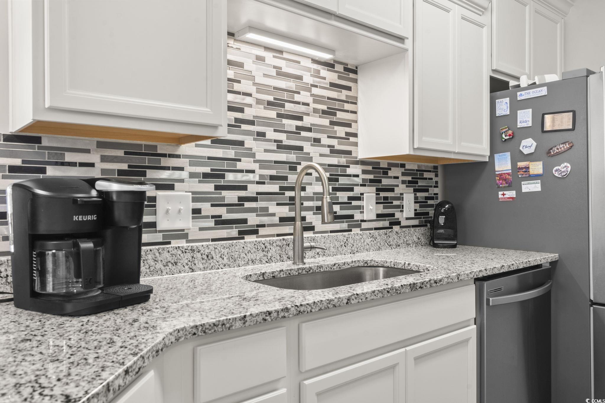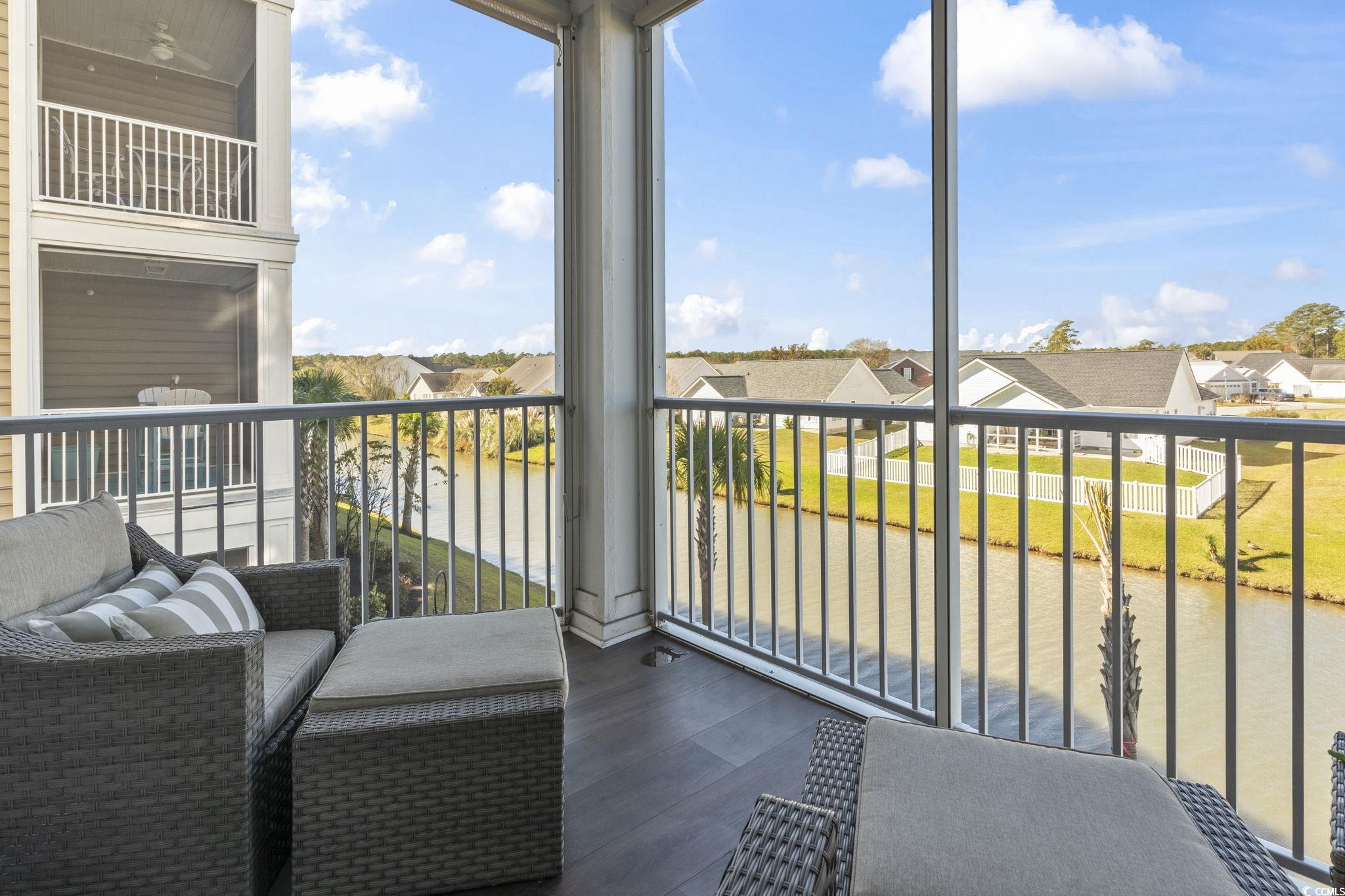 Built in 2024, this exquisite second-floor, end unit combines comfort, style, and convenience, offering an inviting home that feels both sophisticated and warm, and has the benefits from elevator access. Perfectly designed for those who appreciate thoughtful details and a tranquil ambiance, this lovely home features stunning pond views visible from the screened-in porch, making it a serene retreat for relaxation or entertaining. The vinyl flooring and roller shades let you control sunlight and breeze. The spacious living areas are adorned with LVP flooring, while the bedrooms provide plush carpeting for cozy comfort. Every bedroom is detailed with elegant double crown molding, adding a refined touch that elevates the overall aesthetic. The kitchen has modern stainless-steel appliances, paired with a beautiful backsplash that adds texture and visual interest. Whether preparing casual meals or hosting dinner, this area invites culinary creativity within a polished environment. Wainscoting in the dining area adds architectural charm and warmth. The primary bathroom features recessed lighting that creates a clean, inviting atmosphere, and the shower is enclosed with a sleek glass door. Plantation shutters on all windows offers both privacy and a classic style. And an extra bonus, the HOA pays for Internet and Cable! The Village of Queens Harbour II is conveniently close to dining, shopping; Market Common and the Marsh Walk, with the sandy beach just a short drive away. UPGRADES include: Vinyl Flooring and Roller Shades on the balcony, Shower Door in Primary Bathroom, Wainscoting in Dining Area, Recessed Lighting in Primary Bathroom, 2 TV mounts in the Primary Bedroom and Living Room, Cabinets in the Laundry Room, Backsplash in the Kitchen, Ceiling Fans in both Guest Bedrooms and Balcony, Double Crown Molding in all Bedrooms, Storm Door in Entrance, Plantation Shutters on all windows and Roller Shades on the Balcony Doors, added additional Shelving in Guest Bedroom closet.