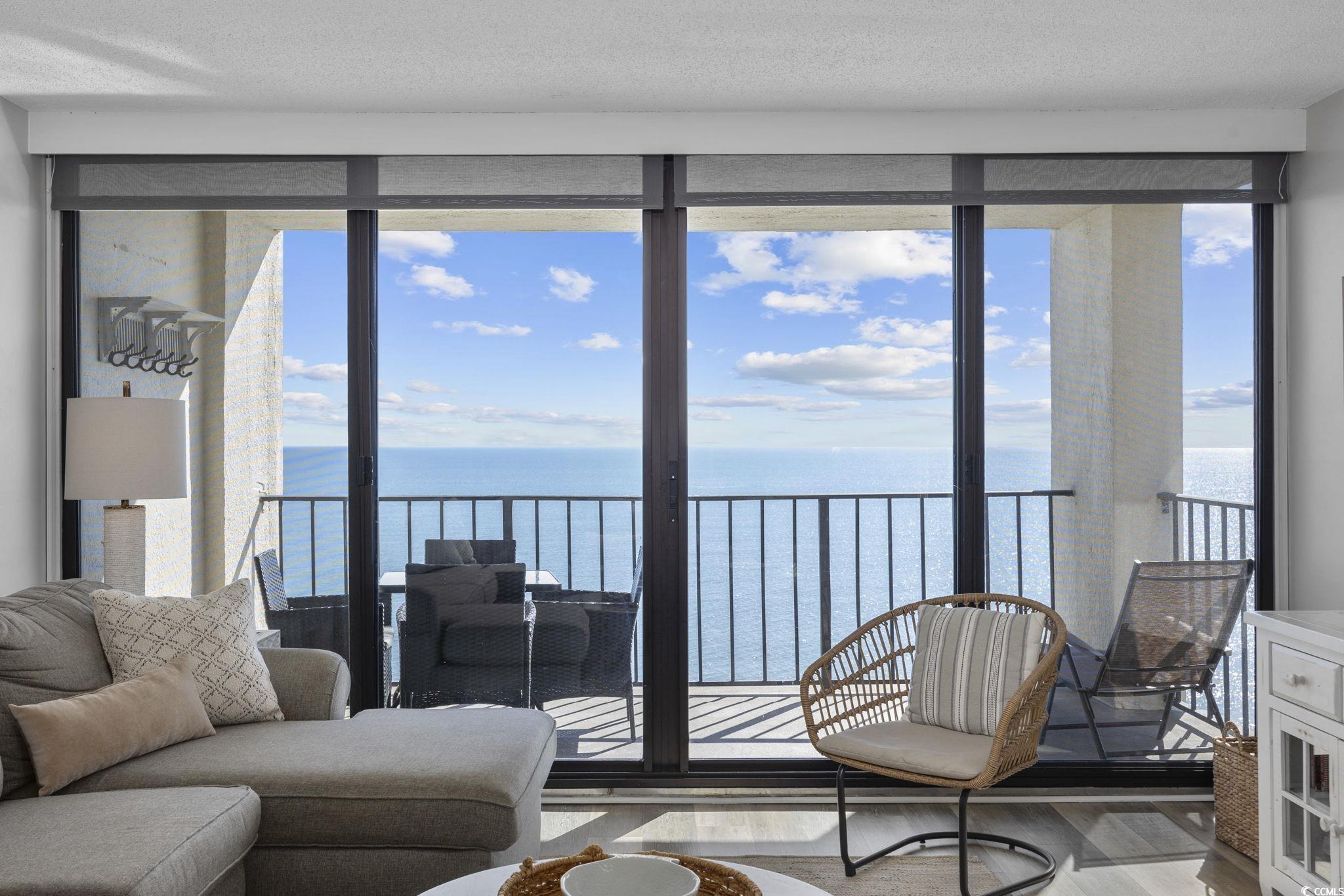 OPEN HOUSE RESCHEDULED>>> 12/14 SUNDAY! FROM 1:15pm-3:45pm!!! As you make your way through the picturesque neighborhood of Arcadian Shores, past the lake and walking path, you see the ocean sparkling in the distance. Perched up high with breathtaking views of the Atlantic Ocean, you'll find this thoughtfully renovated condo on the shoreline. This oceanfront end-unit with sweeping southern views is offered with all furniture and contents. What you see is what you get. Inside, 3 bedrooms and 2 bathrooms create a retreat that blends comfort with coastal elegance. The heart of the home is the updated kitchen with shell-like quartz countertops, wave-patterned marble tile, stainless appliances, and upgraded cabinetry with soft-close drawers, a pantry with pull-out shelving, and not one but two lazy Susans, to keep everything within reach. Its fully stocked and ready for evenings of cooking and gathering. The living room French-door slider opens from the center with no frame blocking the outdoor patio, allowing seamless indoor-outdoor living. There are four sliders total, with balconies, each with their own remote-operated automatic shade for privacy. These large glass sliders function like tall windows, allowing in sunlight, views and the breeze. Both bathrooms have been reimagined with quartz counters, updated lighting, and modern vanities. The primary suite bathroom offers a spa-like tiled shower with the look of marble, and the enlarged hall bathroom offers a tiled tub surround and has an extra space for a shelf. Luxury vinyl plank flooring is installed throughout, welcoming sandy feet. All three bedrooms have a ceiling fan to sleep comfortably. A charming shiplap wall sets the tone in the back bedroom, which features bunkbeds with a trundle and another bed to comfortably sleep six. All rooms sleep ten total. With an updated electric panel, LED hallway lighting, two classic pendant lights and coastal chic chandelier, every detail was considered in the renovation. There are three hall closets inside and outdoor storage on both the same floor as the unit and ground level for easy access to all of your beach accessories. Resort style amenities include a beachfront pool with grills and greenspace, tennis courts, security and covered parking. The HOA fee covers your internet, cable, water/sewer, trash pickup, pool, landscaping, pest control, common maintenance, management and security. Arcadian II is a well-maintained building on one of the most coveted beaches, situated behind Arcadian Shores Golf Course. The best restaurants, world class golf, Shore Drive, Tanger Outlets and Barefoot Landing are minutes away, keeping you close to the action, but quietly tucked away by the peaceful shores of Arcadian. Make this your vacation home, investment or primary oceanfront residence.