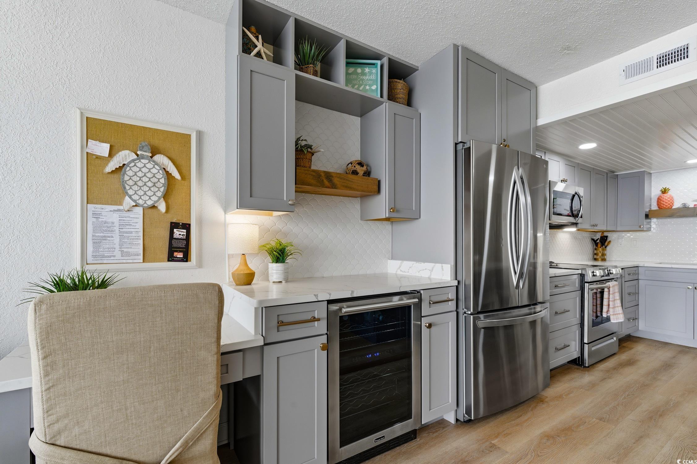 Elegantly coastal, perfectly appointed, and thoughtfully curated407 Waters Edge Resort is a completely updated and spotlessly clean one-bedroom, two-full-bath direct oceanfront condo. Every space is intentionally functional while still open and inviting, and the renovation quality is immediately noticeable from the moment you walk down the hall and see the unobstructed ocean view through the full-wall glass slider. The kitchen with a large island features shaker cabinetry, quartz countertops, a fish-scale tile backsplash, stainless steel appliancesincluding a beverage fridgebrass hardware, under-cabinet lighting, and a built-in desk. Updated flooring extends throughout, creating a clean, cohesive coastal feel. The living area offers comfortable seating, dining space, and a tasteful Murphy bed that blends seamlessly with the dcoran excellent option for guests. Both full baths have been refreshed with modern vanities, fixtures, and finishes, and the in-unit washer and vented dryer add everyday convenience. The condo is being sold fully furnished, making it an easy turn-key option. It also has a proven track record of strong short-term rental income, with rental history available upon request. This unit is located just two floors above the top level of the parking garage, offering quick and easy access without relying on the elevator. Waters Edge Resort provides a strong amenity package, including indoor and outdoor pools, hot tubs, a fitness center, an oceanfront sundeck, the Rising Tides Lounge, a convenience store, covered parking, and securityall within a solid concrete and steel building. The location puts you within walking distance of Garden City Pier for fishing, arcade games, live music, karaoke, food, drinks, and classic beachside energy. You're minutes from Murrells Inletthe Seafood Capital of South Carolinaand a short drive to Huntington Beach State Park, Brookgreen Gardens, the Myrtle Beach Boardwalk, and Myrtle Beach International Airport. Charleston and Wilmington are both within a comfortable two-hour drive. Be sure to view the walking tour and explore the immersive Matterport 3D Virtual Tour to experience the property as if you're already here: www.bit.ly/407WER
