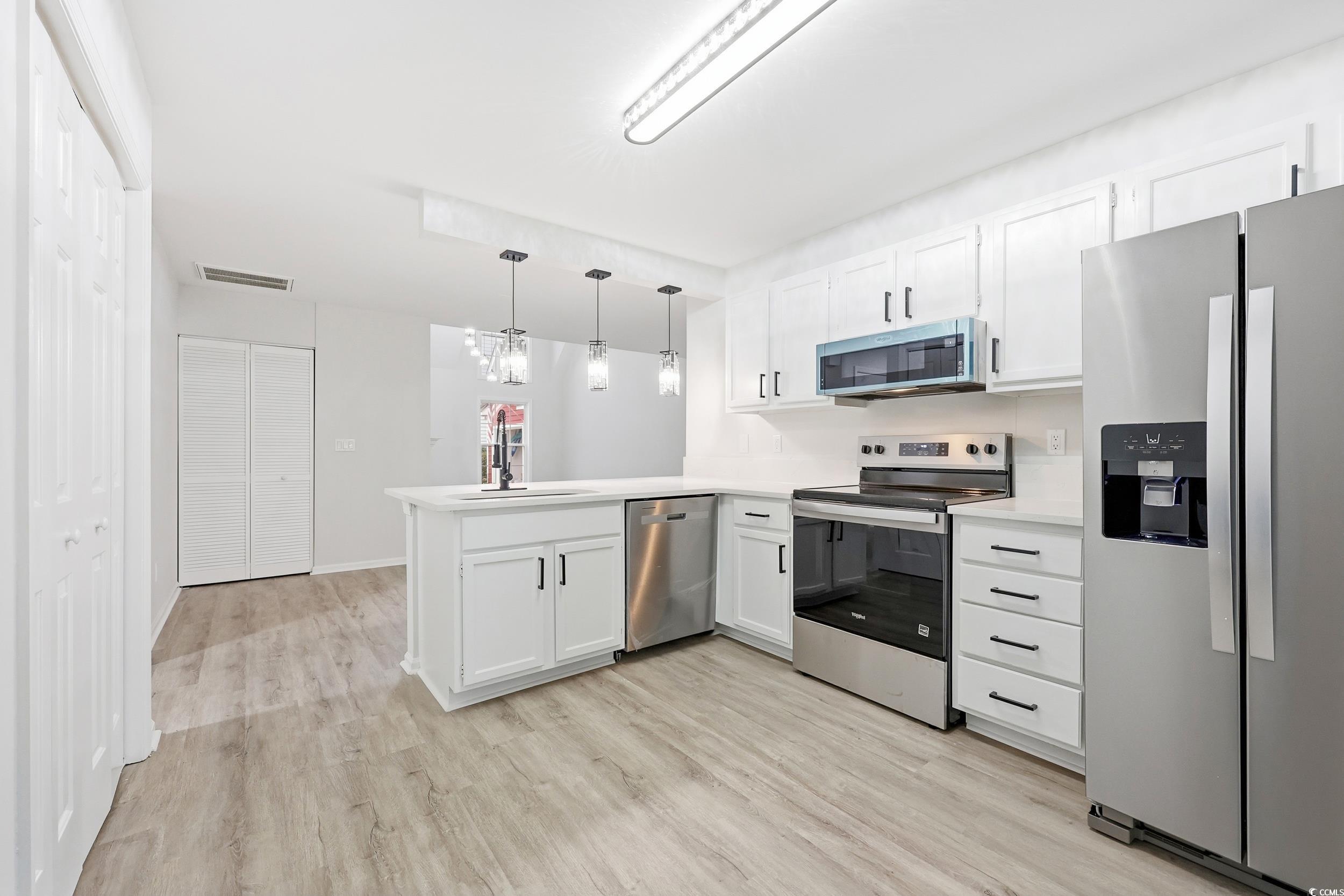 If you are looking for a home that has undergone a total renovation, has a direct golf course view, and is in a highly desired community, look no further. This home is located in Eastport Golf Course and is in the heart of Little River and just minutes to the beach. The home has just been entirely renovated as of December 2025. The outside has just been painted a fresh white with black front door. When you walk in, you'll notice the amount of natural light that comes in and the open kitchen and living area. Brand new LVP flooring has been installed throughout and the stairs have been refinished and stained. The kitchen has been reconfigured to be open and has white cabinets, new quarts countertops, new sink and faucet and new stainless steel appliances. Every light in the home has been replaced as well. The primary bedroom is on the ground level and it is very spacious, and has a slider going out to the patio that overlooks the golf course. The primary bathroom has a dual sink, quarts counters, and a huge custom tile shower that is to die for!!! There was a screened porch added off of the living room as well so you can enjoy your morning coffee while watching the golfers. There is also a half bath downstairs for guests. Upstairs, there are two more large bedrooms, a 4th bedroom that could be a small bonus room, and a shared bathroom with another tile shower, dual sinks and quarts countertops and new sinks and faucets. There is an attached one car garage that just had the floor epoxied and looks very clean! More features include a fireplace, back patio, custom lighting, all new black hinges and knobs throughout the home, fresh paint inside and out, and much more. There is also a community pool and the HOA fees are very reasonable. This isn't some cookie cutter home, this one has been remodeled and customized with endless upgrades. Direct golf course view! Do not miss out on this one, schedule a showing today!!! IT WAS RAINING THE DAY OF PHOTOS SO BETTER EXTERIOR PHOTOS COMING SOON!