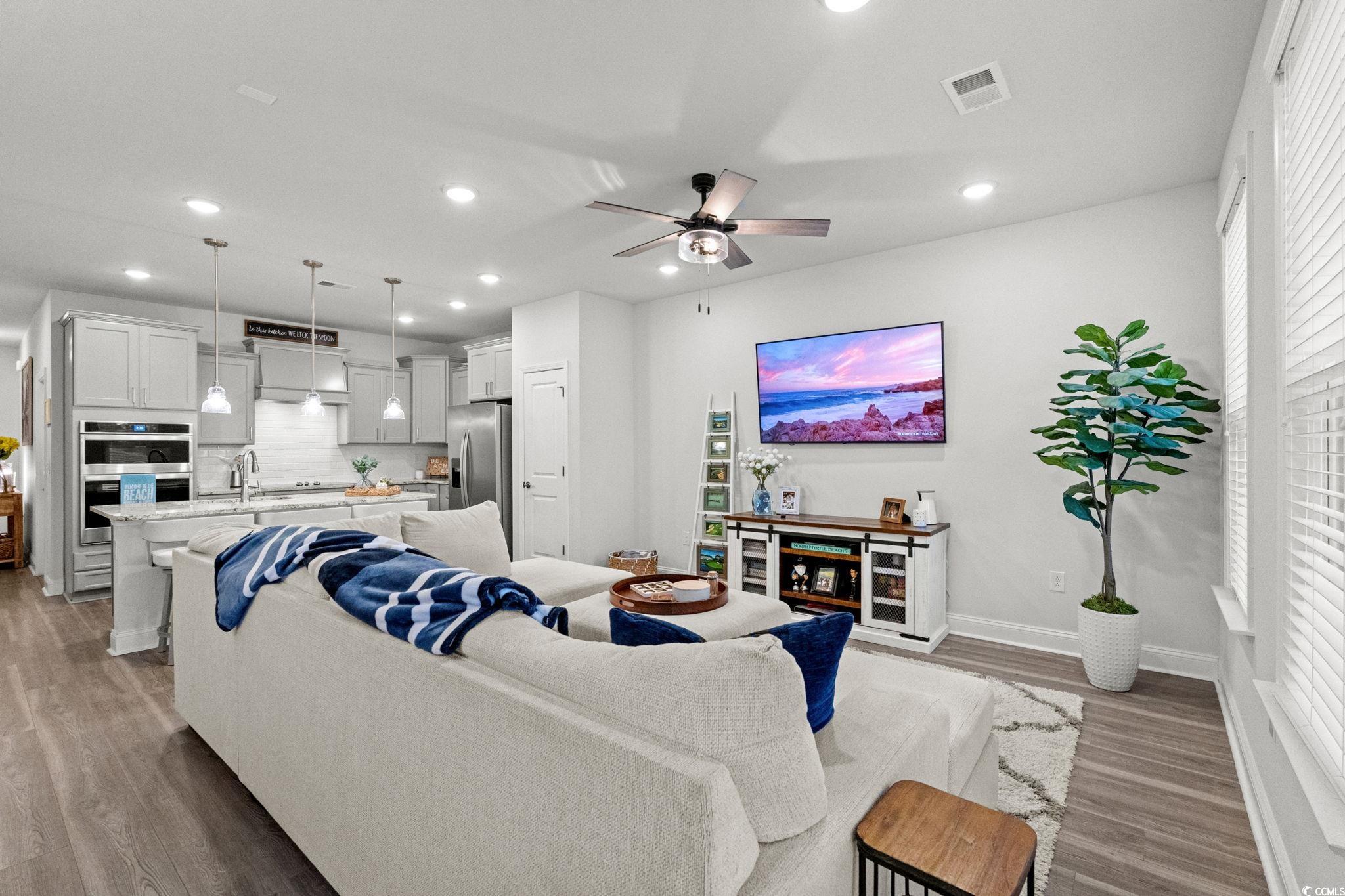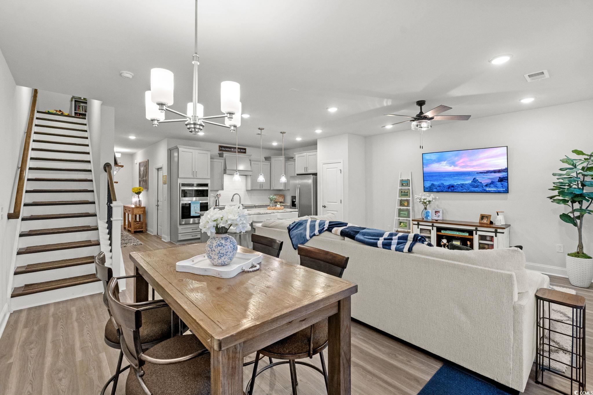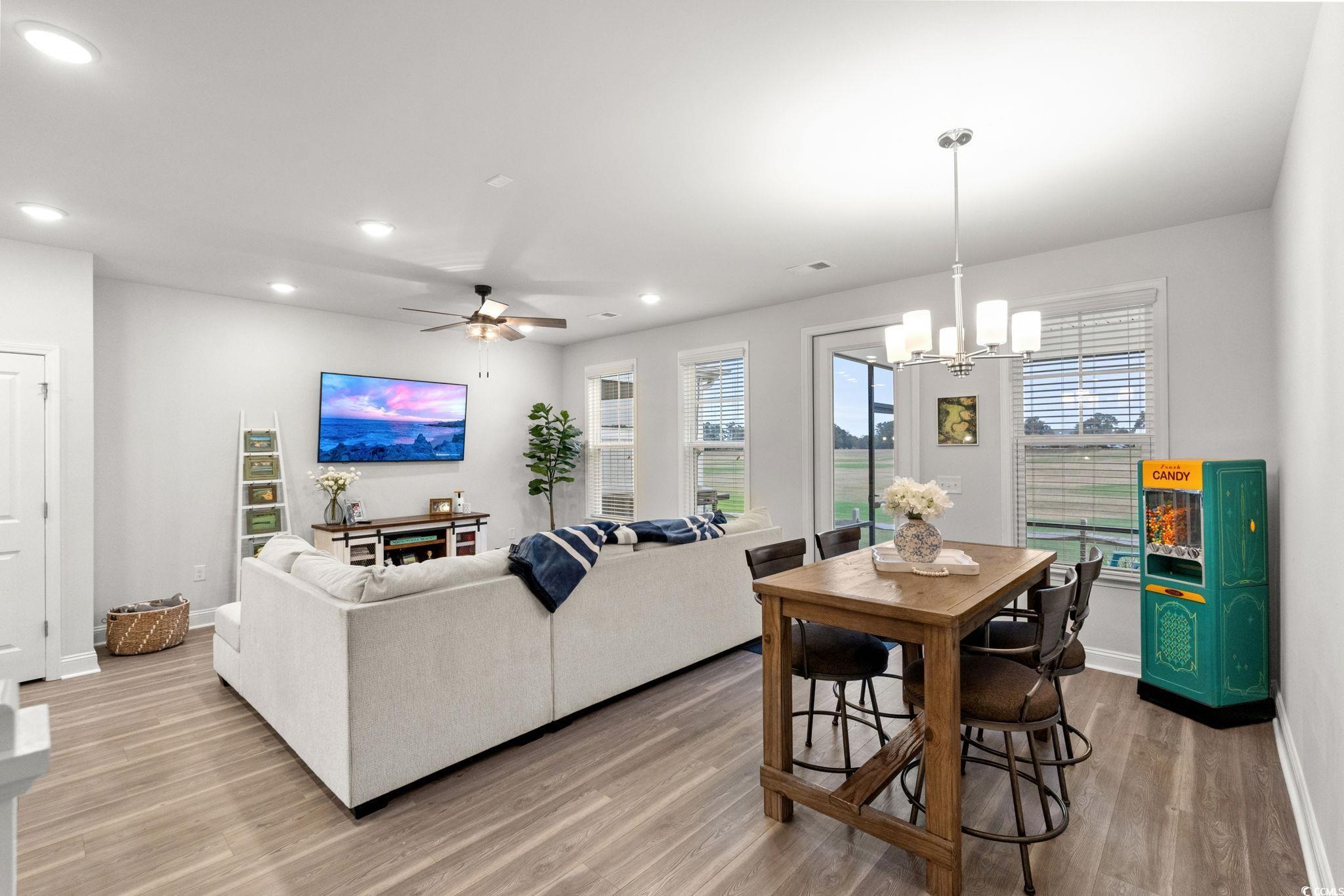 You won't want to miss out on this gorgeous 4BR, 3.5BA townhome located in the The Townes at Barefoot Resort! One of the most desirable views in the entire community, this FULLY FURNISHED unit backs up to the beautiful driving range offering beautiful views and resort style living! There is also an optional transferable GOLF MEMBERSHIP to Barefoot Resort. The gourmet kitchen offers quartz countertops, soft close cabinets, Kitchen Aid appliances and tiled backsplash. Beautiful LVP floors run throughout the first level into the open living & dining room which leads to the screened in porch overlooking the driving range. The second level offers the Primary Suite + Primary Bathroom, Two Guest Bedrooms, an additional full bathroom, and the laundry room. The third floor consists of a large bonus room/4th bedroom, full bathroom, and additional storage space. The one car garage is perfect for your beach toys and additional storage! Short Term Rentals ARE allowed, however, this has only been used as a primary home. Owners have access to the Resort Style Pool, the Beach Cabana, sidewalks, and so much more. The Townes at Barefoot is approximately 2 miles to the ocean and a short golf cart ride to all of the amenities that Barefoot Landing has to offer including local shops and restaurants, the House of Blues, and the Duplin Winery. Schedule your showing on the gorgeous home before it is too late!