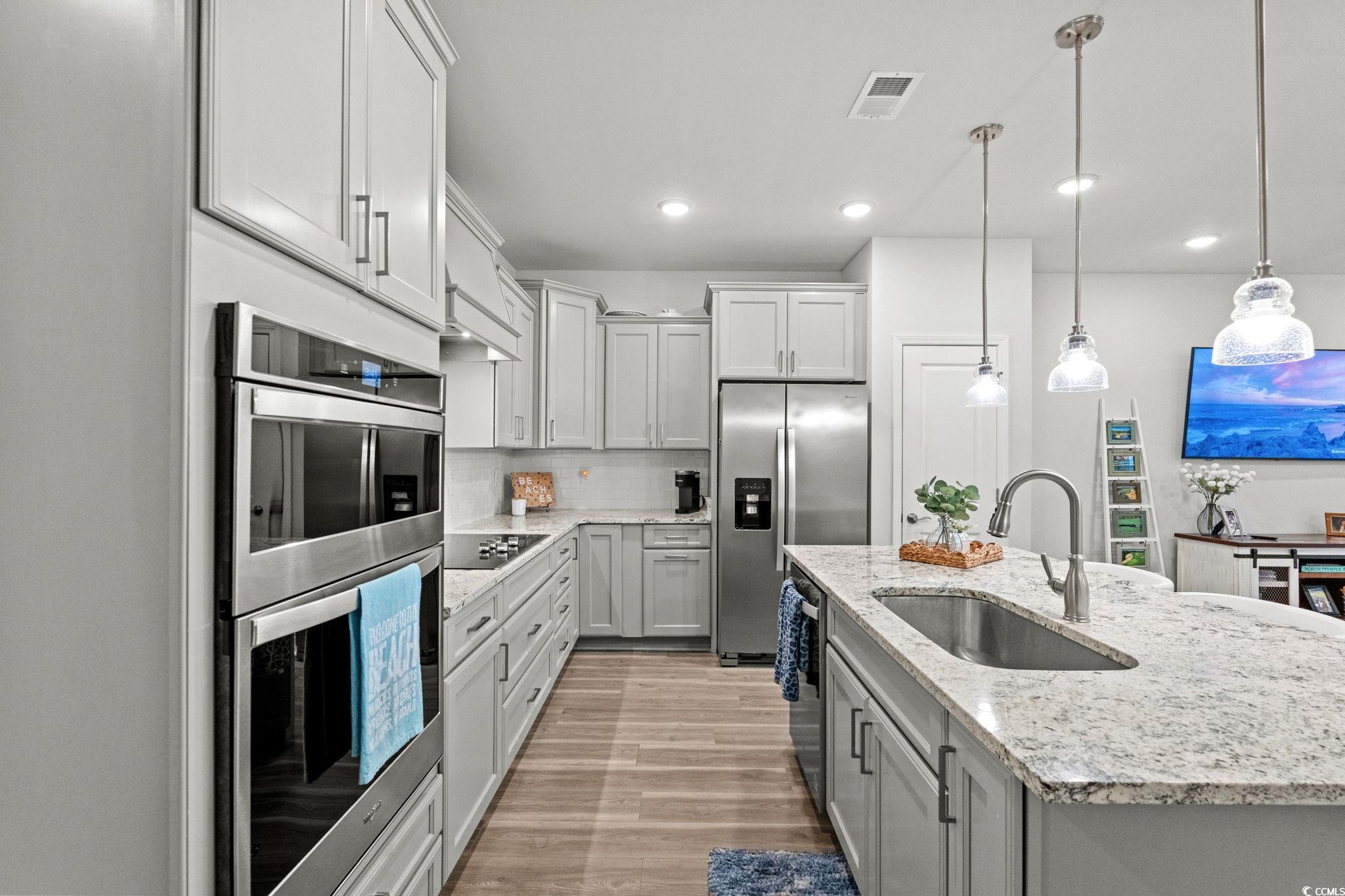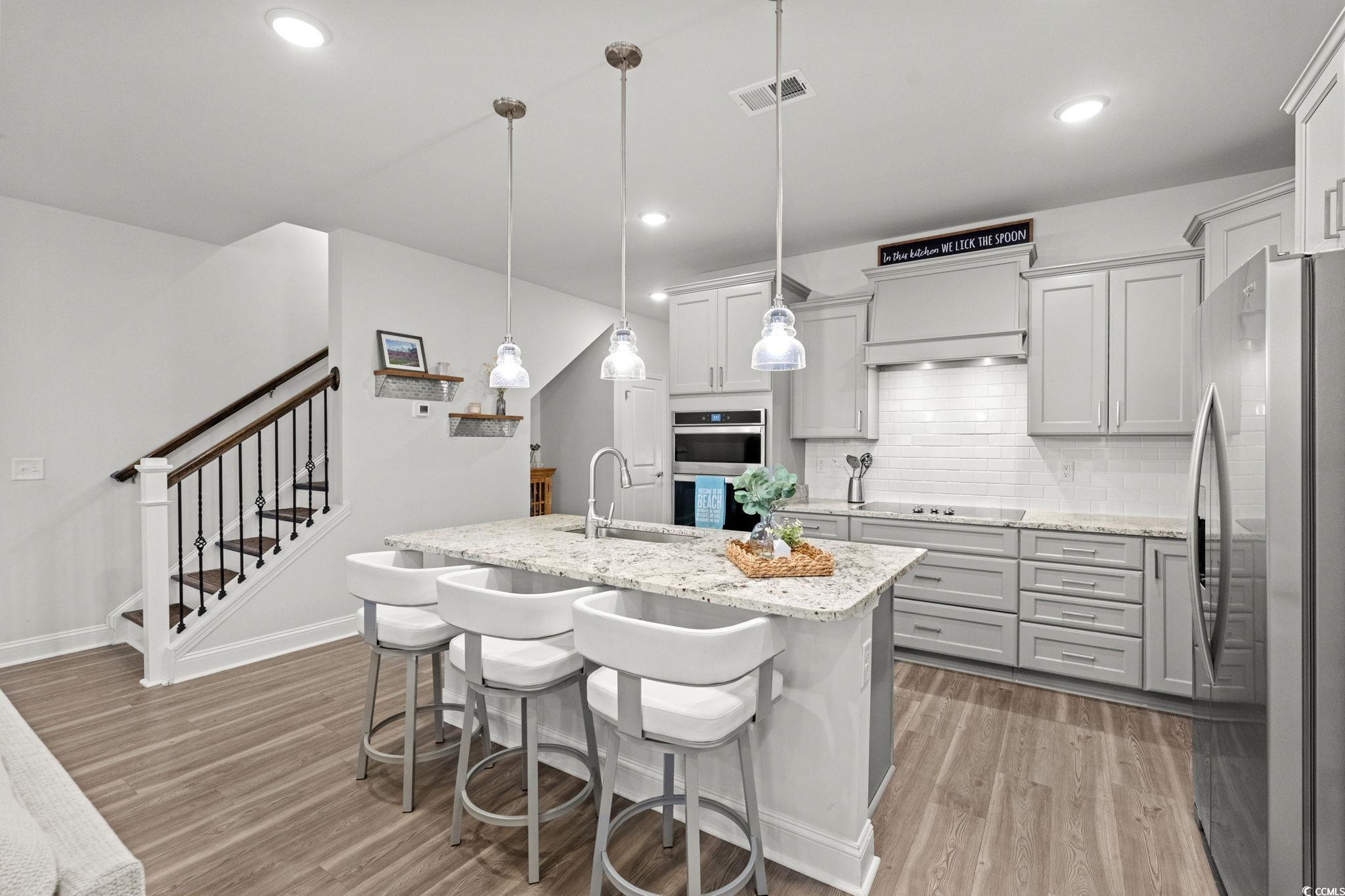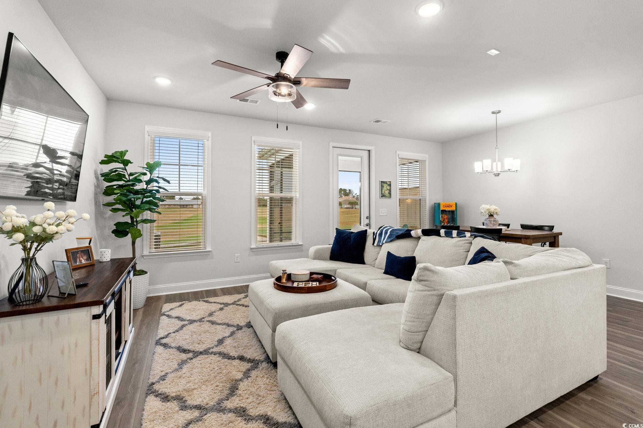 You won't want to miss out on this gorgeous 4BR, 3.5BA townhome located in the The Townes at Barefoot Resort! One of the most desirable views in the entire community, this FULLY FURNISHED unit backs up to the beautiful driving range offering beautiful views and resort style living! There is also an optional transferable GOLF MEMBERSHIP to Barefoot Resort. The gourmet kitchen offers quartz countertops, soft close cabinets, Kitchen Aid appliances and tiled backsplash. Beautiful LVP floors run throughout the first level into the open living & dining room which leads to the screened in porch overlooking the driving range. The second level offers the Primary Suite + Primary Bathroom, Two Guest Bedrooms, an additional full bathroom, and the laundry room. The third floor consists of a large bonus room/4th bedroom, full bathroom, and additional storage space. The one car garage is perfect for your beach toys and additional storage! Short Term Rentals ARE allowed, however, this has only been used as a primary home. Owners have access to the Resort Style Pool, the Beach Cabana, sidewalks, and so much more. The Townes at Barefoot is approximately 2 miles to the ocean and a short golf cart ride to all of the amenities that Barefoot Landing has to offer including local shops and restaurants, the House of Blues, and the Duplin Winery. Schedule your showing on the gorgeous home before it is too late!