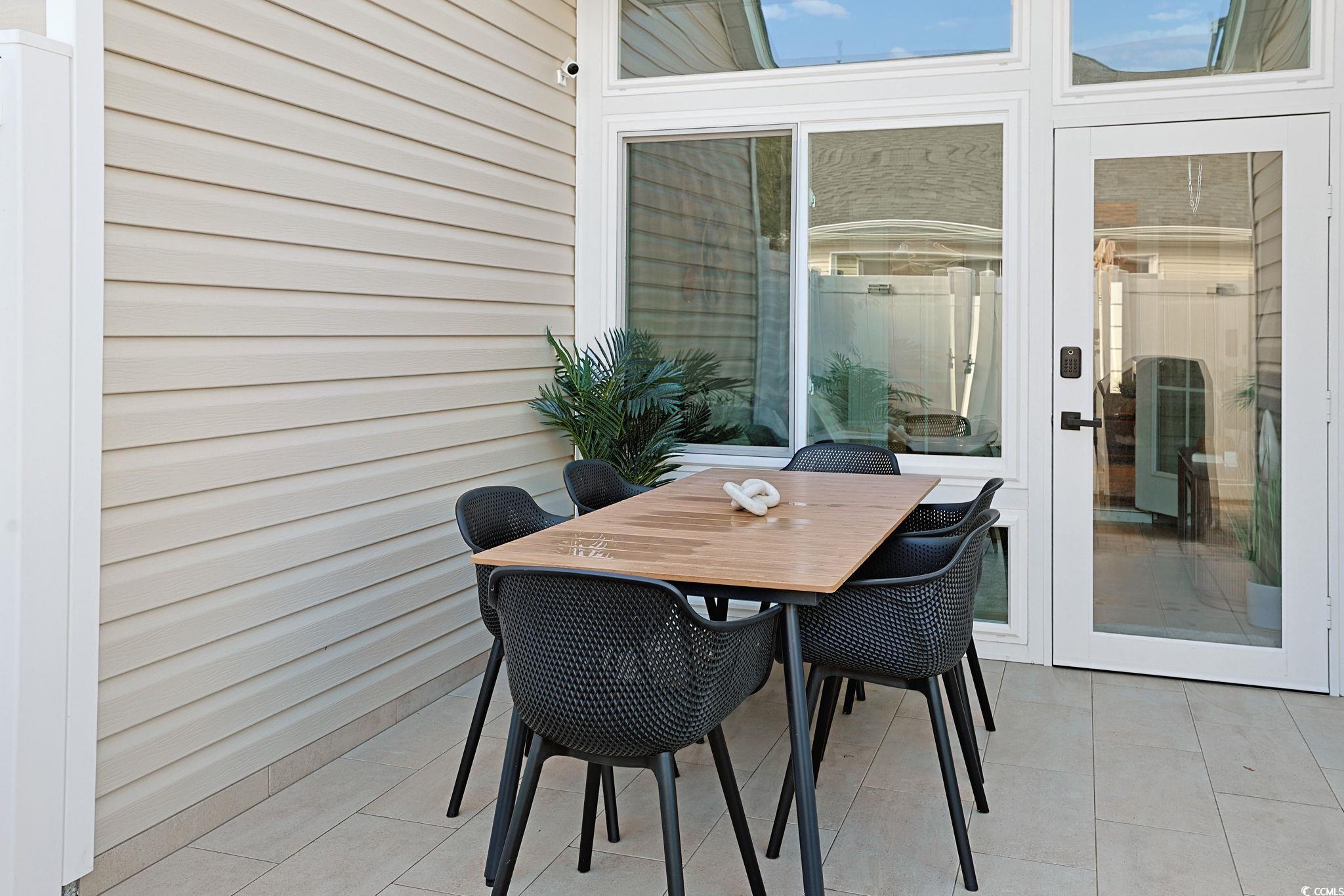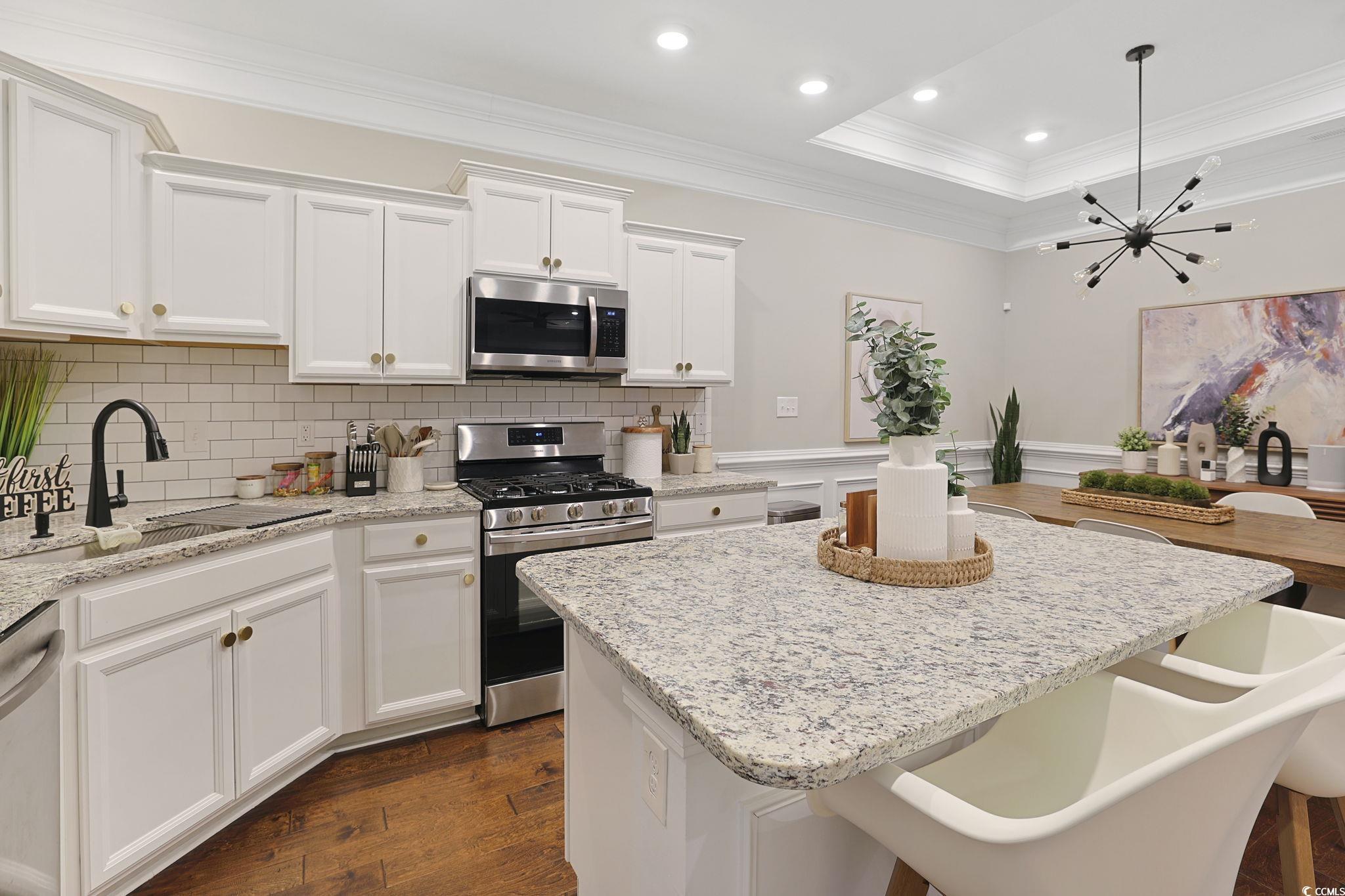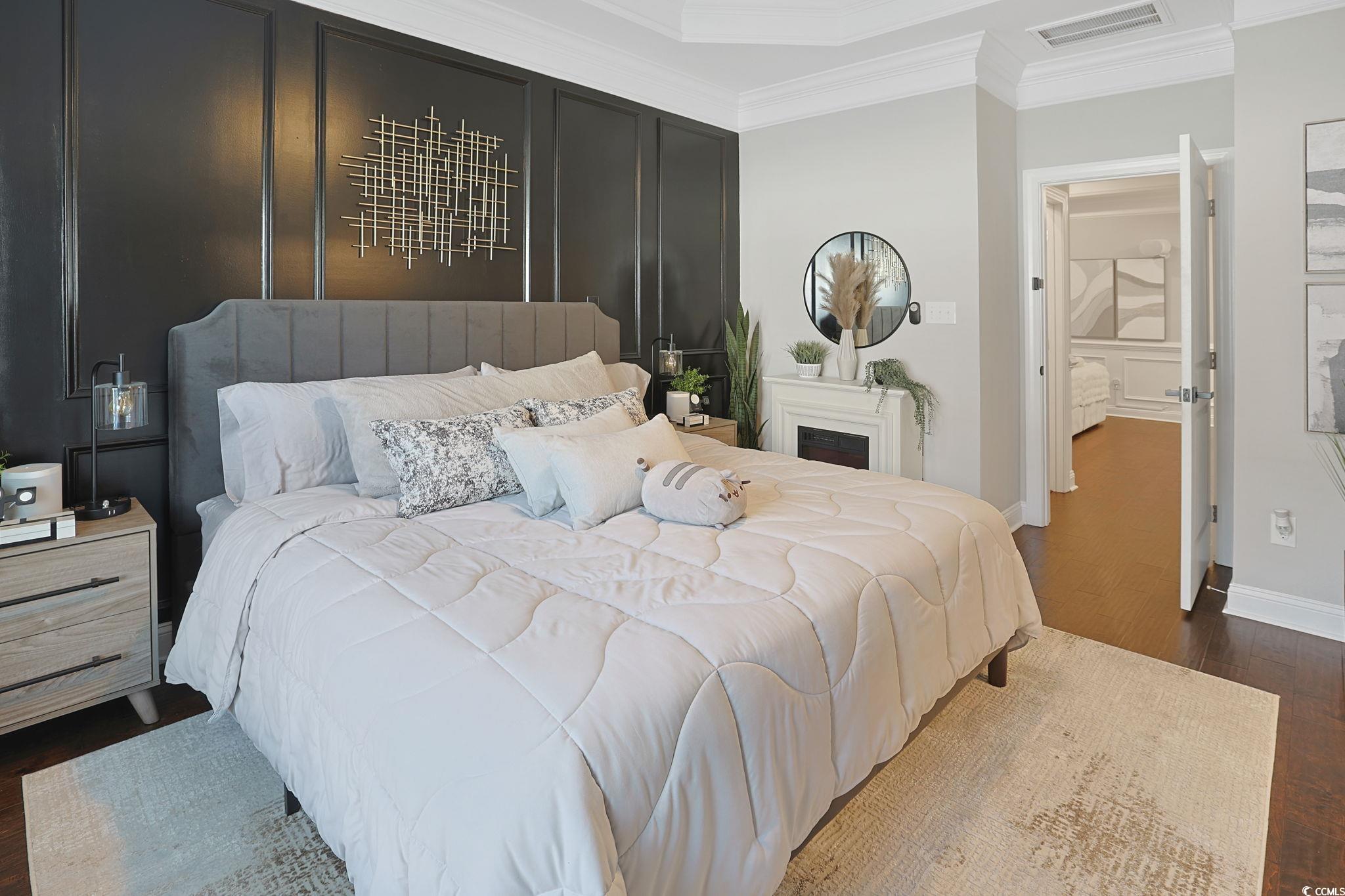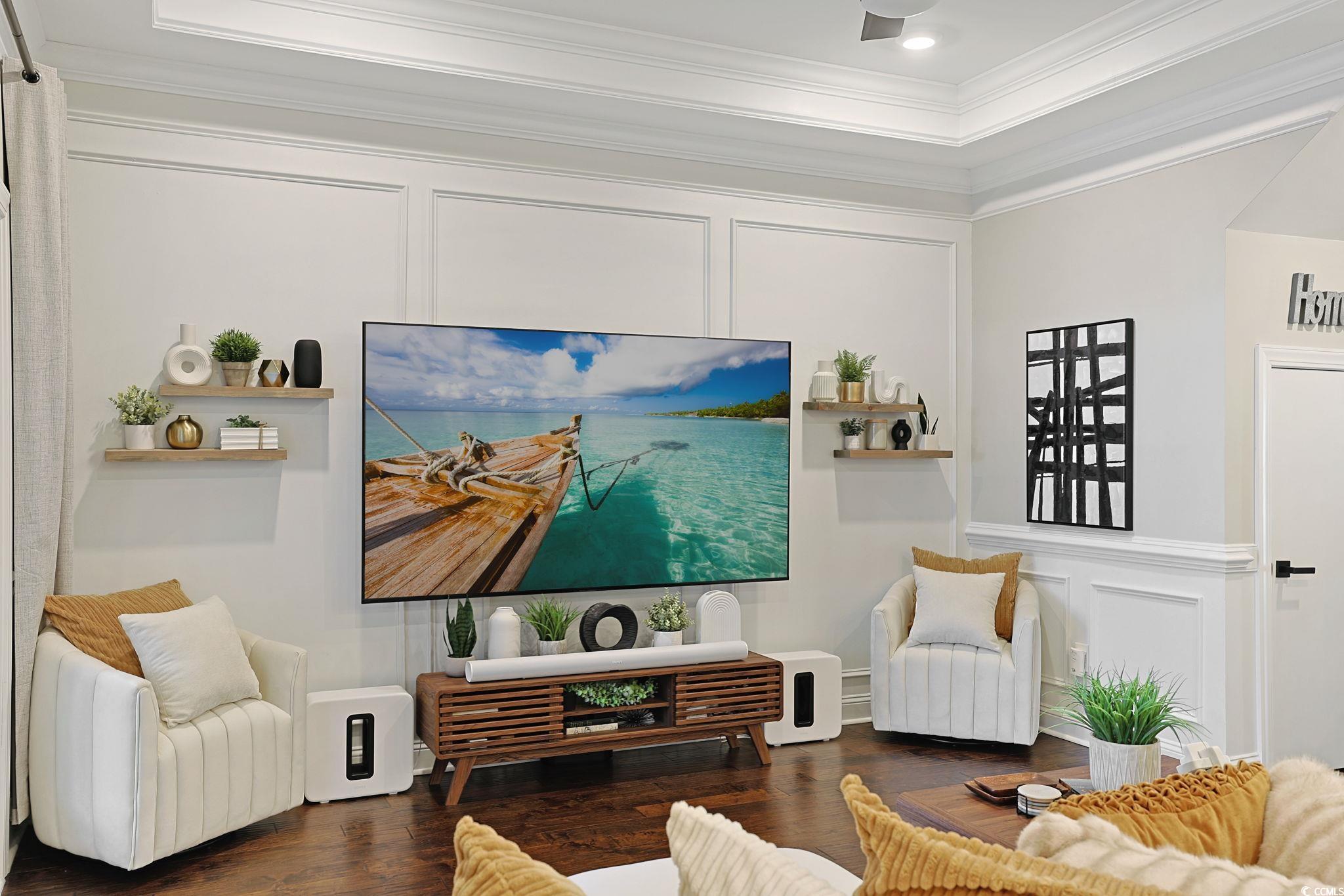 Presenting this luxurious 3 bedroom 2.5 bath townhome located in the very popular Queens Court community. This piece of paradise features an open floor plan with engineered wood & tile flooring, smooth flat 9 foot ceilings, elegant chair railing with shadow box paneling, crown moulding, recessed lighting, a guest powder room, a formal dining area, and a comfortable living room that showcases a sliding glass door that opens up to the delightful sunroom. The family friendly kitchen is equipped with a stainless steel appliance package that includes a gas range, built-in microwave, dishwasher, refrigerator, granite counter tops, a kitchen island, a breakfast bar, cabinets topped with crown moulding, and a practical pantry. The main level primary suite offers a rectangular raised-panel wainscoting that covers the full height of the wall (floor-to-ceiling), creating a dramatic backdrop. The panels are framed with crisp molding and painted in a high-gloss finish, which gives the wall depth and a luxurious feel, single step tray ceiling with a fan, private access to the double door primary bath hosting a vanity with dual sinks, a water closet, a deluxe step-in shower, and a large walk-in closet. As you venture upstairs you will find a memorable second master suite offering a ceiling fan, nice sized closet, and private access to a full bath. The second level is completed with an additional bedroom, a full guest bath, and a versatile bonus room. The main level of this exquisite home also includes a delightful back patio with a gas grill, lots of extra closet spaces, a laundry room, and a two car attached garage. This townhome affords you easy access to the beach and golfing along with all of the other activities and happenings in Myrtle Beach including fun eateries, award winning off-Broadway shows, public fishing piers, and intriguing shopping adventures along the Grand Strand. Conveniently located to your everyday needs, including grocery stores, banks, post offices, medical centers, doctors offices, and pharmacies. Check out our state of the art 3-D Virtual Tour.