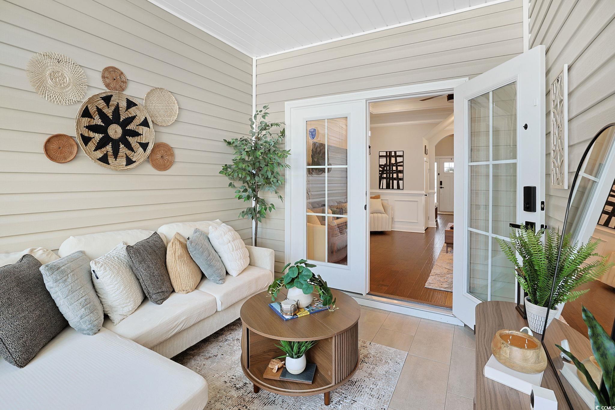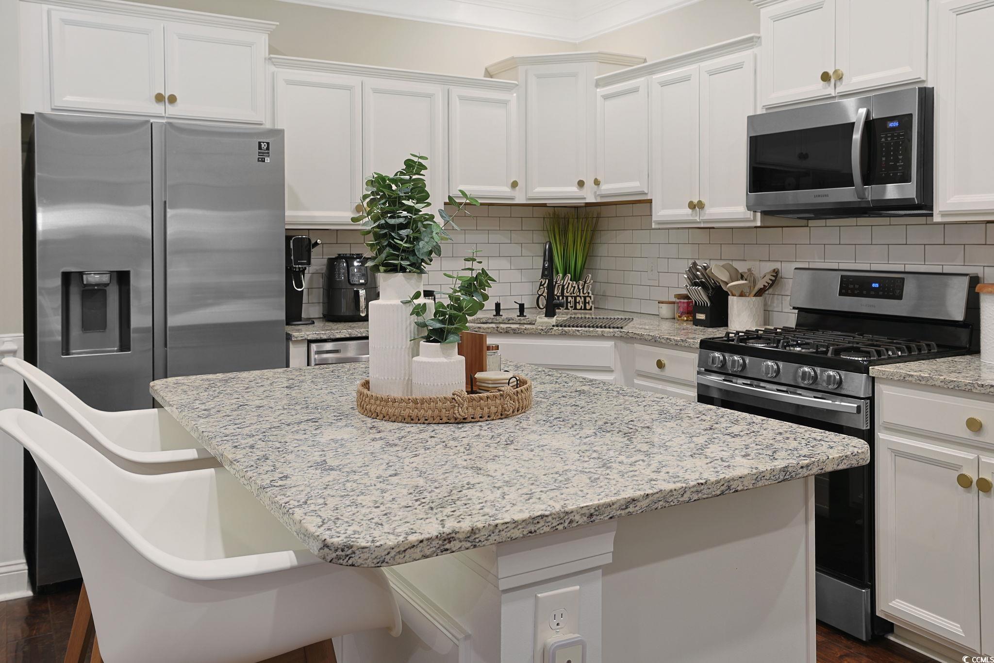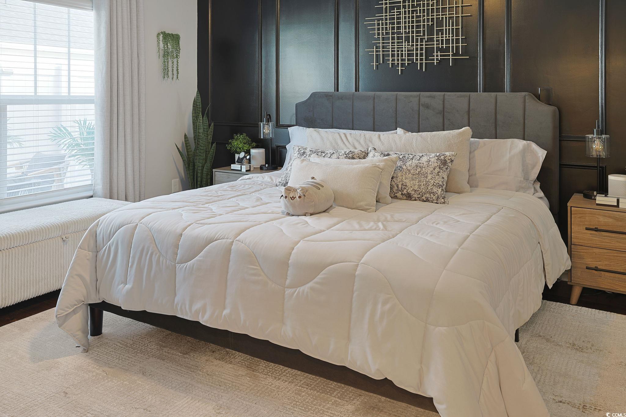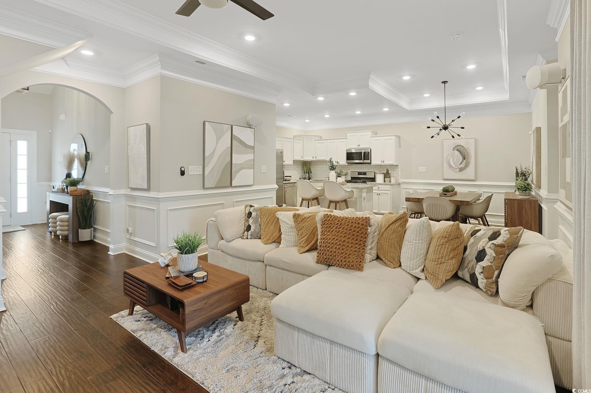 Presenting this luxurious 3 bedroom 2.5 bath townhome located in the very popular Queens Court community. This piece of paradise features an open floor plan with engineered wood & tile flooring, smooth flat 9 foot ceilings, elegant chair railing with shadow box paneling, crown moulding, recessed lighting, a guest powder room, a formal dining area, and a comfortable living room that showcases a sliding glass door that opens up to the delightful sunroom. The family friendly kitchen is equipped with a stainless steel appliance package that includes a gas range, built-in microwave, dishwasher, refrigerator, granite counter tops, a kitchen island, a breakfast bar, cabinets topped with crown moulding, and a practical pantry. The main level primary suite offers a rectangular raised-panel wainscoting that covers the full height of the wall (floor-to-ceiling), creating a dramatic backdrop. The panels are framed with crisp molding and painted in a high-gloss finish, which gives the wall depth and a luxurious feel, single step tray ceiling with a fan, private access to the double door primary bath hosting a vanity with dual sinks, a water closet, a deluxe step-in shower, and a large walk-in closet. As you venture upstairs you will find a memorable second master suite offering a ceiling fan, nice sized closet, and private access to a full bath. The second level is completed with an additional bedroom, a full guest bath, and a versatile bonus room. The main level of this exquisite home also includes a delightful back patio with a gas grill, lots of extra closet spaces, a laundry room, and a two car attached garage. This townhome affords you easy access to the beach and golfing along with all of the other activities and happenings in Myrtle Beach including fun eateries, award winning off-Broadway shows, public fishing piers, and intriguing shopping adventures along the Grand Strand. Conveniently located to your everyday needs, including grocery stores, banks, post offices, medical centers, doctors offices, and pharmacies. Check out our state of the art 3-D Virtual Tour.