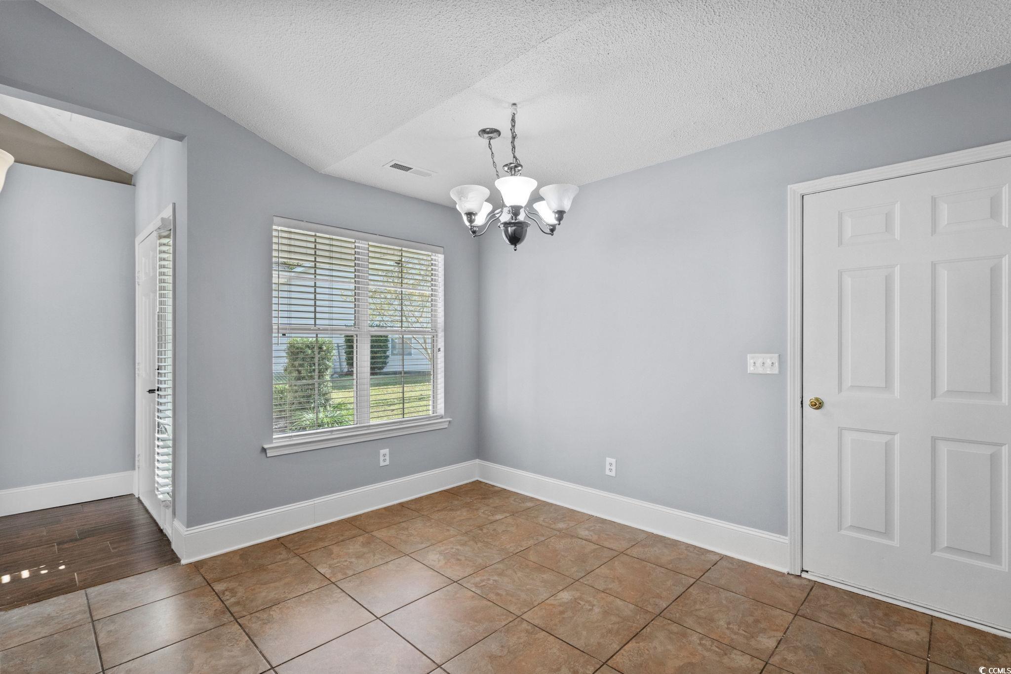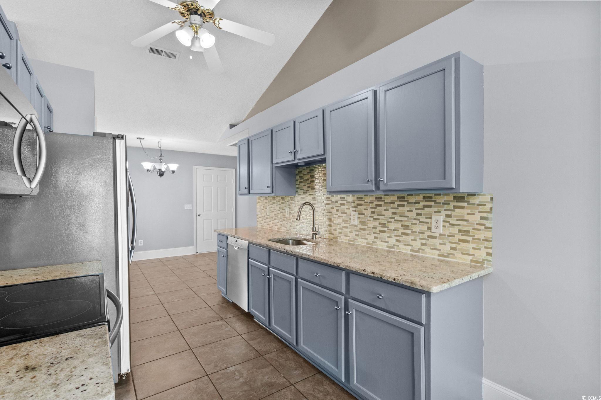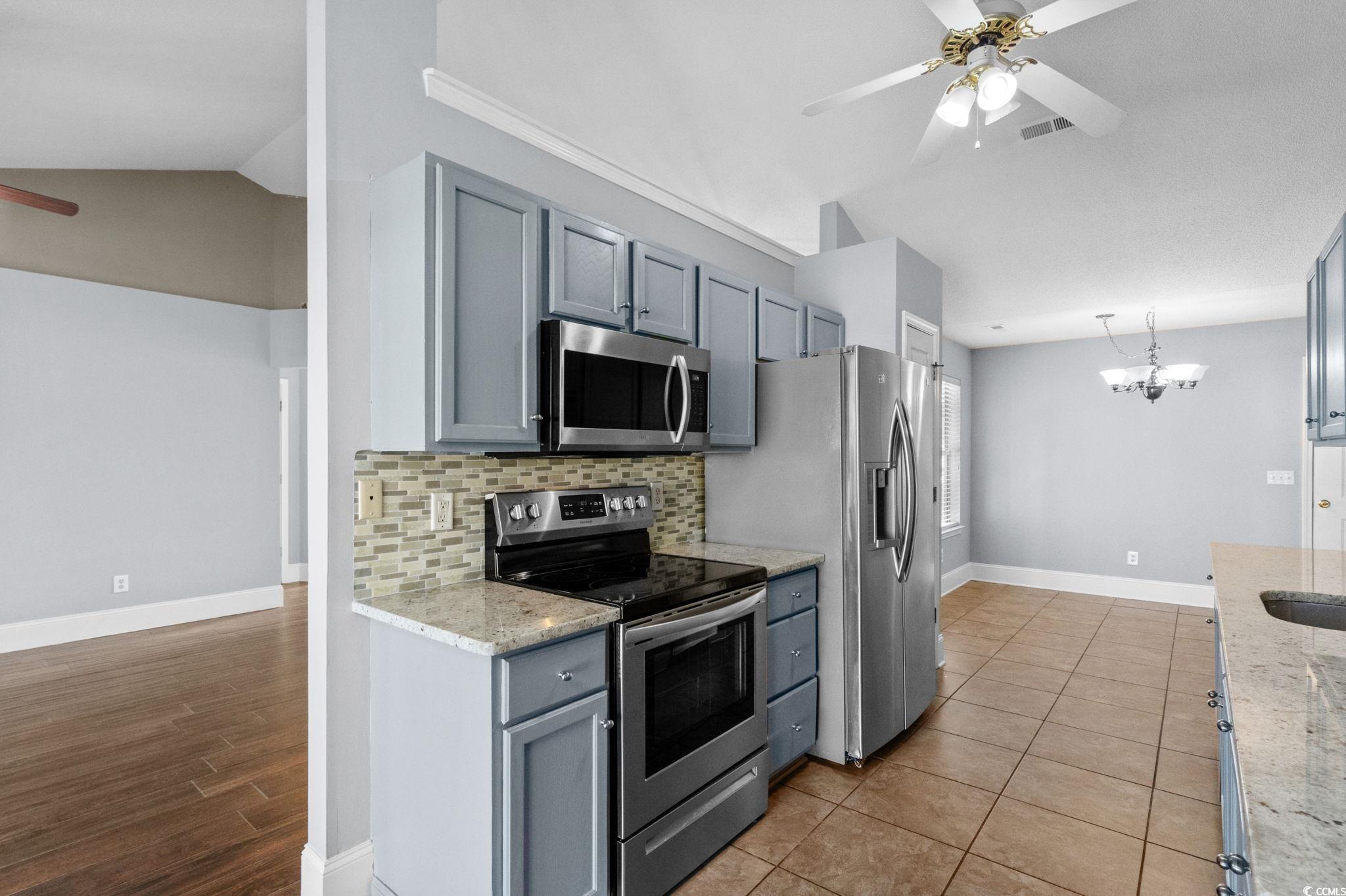 Welcome to this charming 3-bedroom, 2-bath home located on a quiet cul-de-sac in the desirable community of Osprey Cove. This beautifully maintained property offers great space, a split floor plan for privacy, and peaceful pond views, and a longer driveway for added convenience. Inside, youll find fresh paint, vaulted ceilings, and higher baseboards that elevate the look and feel of the home. The living areas feature wood-look ceramic tile, while the kitchen and baths include ceramic tile flooring. The updated kitchen is outfitted with sleek gray cabinets, granite countertops, backsplash, stainless steel appliances, and both a breakfast area and a separate dining space. The spacious primary suite easily accommodates a king-size bed with room for a sitting area and includes a generous walk-in closet. The split floor plan offers excellent privacy for guests or family. Enjoy peaceful mornings in the Carolina Room or on the patio as you take in the views of the pond, fountain, and visiting birds. Sitting on approximately a quarter-acre, the yard offers the perfect balanceroom to entertain, garden, or play, without spending every weekend mowing in the Myrtle Beach heat. Additional plus: a finished garage for extra convenience and storage. Located close to everything the Grand Strand has to offer yet comfortably removed from heavy tourist traffic, this home delivers comfort, style, and affordability in a prime location.
