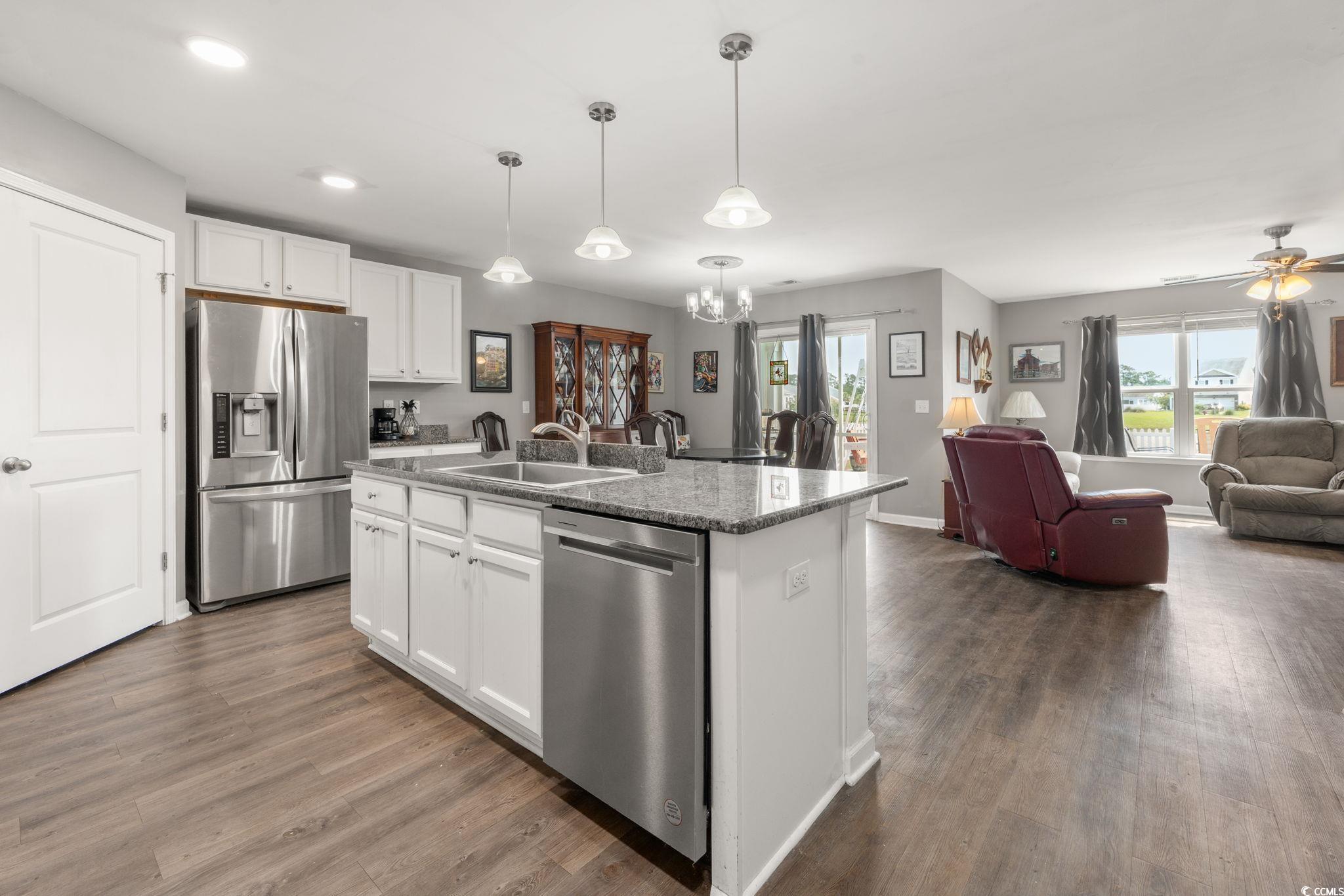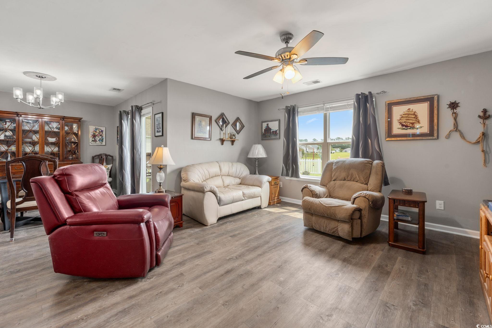 Welcome to 568 Mossbank Loop, an inviting and beautifully maintained home in the desirable Anchors Bend community of Longs, South Carolina. This spacious four-bedroom, two-bath residence is thoughtfully crafted for both everyday comfort and effortless living. Inside, luxury vinyl plank flooring flows through the main living areas, adding both style and durability while enhancing the homes warm, welcoming feel. Solid surface countertops and stainless appliances are showcased in the beautiful kitchen. The home has an open concept kitchen, dining and living area, perfect for entertaining guest. Step outside to a fenced backyard and a cozy screened porch and outdoor patio area overlooking a tranquil pondyour own peaceful retreat for morning coffee or evening relaxation. Set on a generous quarter-acre lot, the property offers ample space for outdoor enjoyment and entertaining. And with North Myrtle Beach just 15 minutes away, youll have quick access to coastal dining, shopping, and pristine beachesall while enjoying the quiet charm of Anchors Bend. This home truly offers the perfect blend of comfort, convenience, and coastal living.