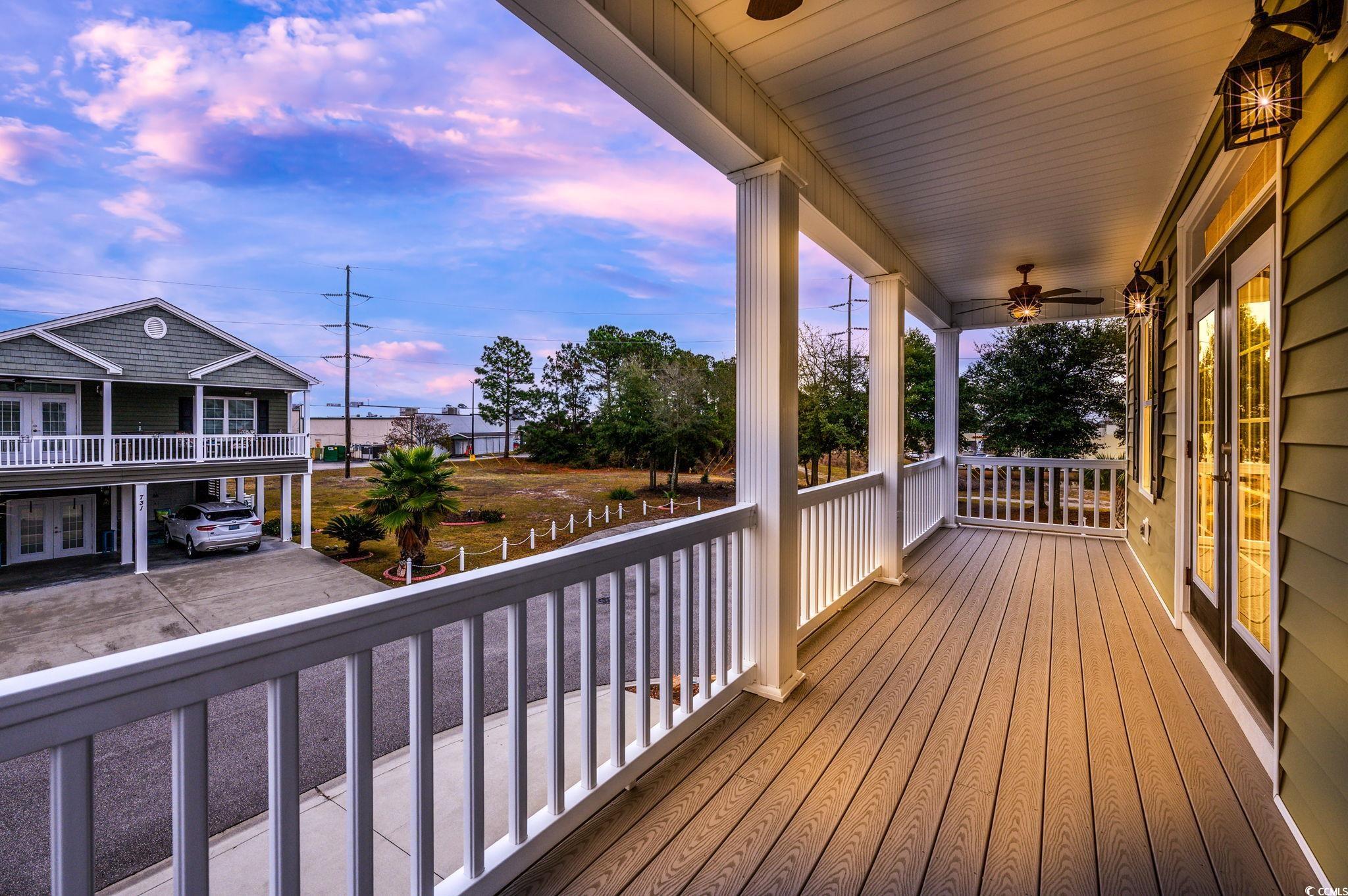 Welcome to this raised beach house with ELEVATOR in the Ocean Sands neighborhood where the street is lined with palm trees. The 3 minute golf cart ride enhances its appeal for coastal charm. This home has a unique floor plan perfect for guests and in-laws. All bedrooms have walk-in closets. As you enter the lower level of the home, there is an area for a small den with 2 bedrooms and a full bath (double vanities, granite countertops, tub and stand-alone shower. One bedroom leads to the back patio. This house is adorned with lots of storage as there is a hall closet and another large closet with shelving on this level. As you ascend the stairs (or take the elevator) to the main level, you are welcomed with all the windows and lightness as you expect in coastal. You will be amazed at the expansive open floor plan of kitchen, dining, family area that yells, ""Entertaining"". The kitchen has custom cabinetry with lazy susan, trash and recycle bins, backsplash, granite countertops, pantry wall unit with pull-out shelving, and an island with bar stool seating. There is plenty of space to adorn complete dining room furniture fit for 8 or 10 people. Hardwoods are throughout this main living area except the ceramic tiled kitchen. The living area leads to double French doors onto the front porch that extends the full width of the house. There is a half bath in this area as well. The laundry room with custom cabinetry houses a sink, washer and dryer and freezer which all conveys. The Primary Bedroom has another walk-in closet with an ensuite of double vanities, ceramic tiled stand-alone shower plus a tub and water closet for privacy. Because the house if at the end of the street toward the ocean, there is usually a sea breeze for comfort on the large front porch. Parking is underneath the house as well as sitting area. Grilling is perfect on the back patio. The garage with upper shelving for extra storage also houses the golf cart. All this with no HOA.