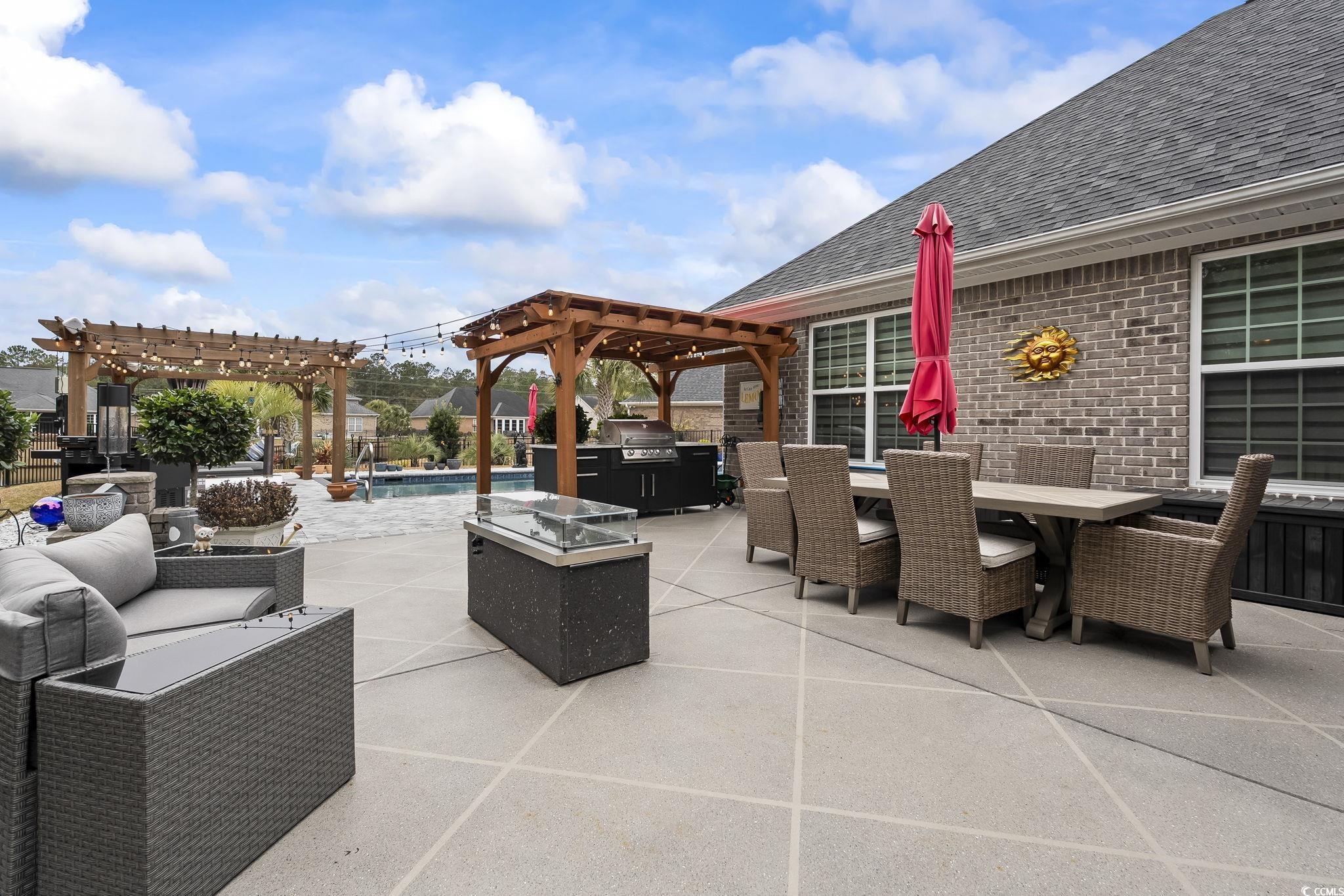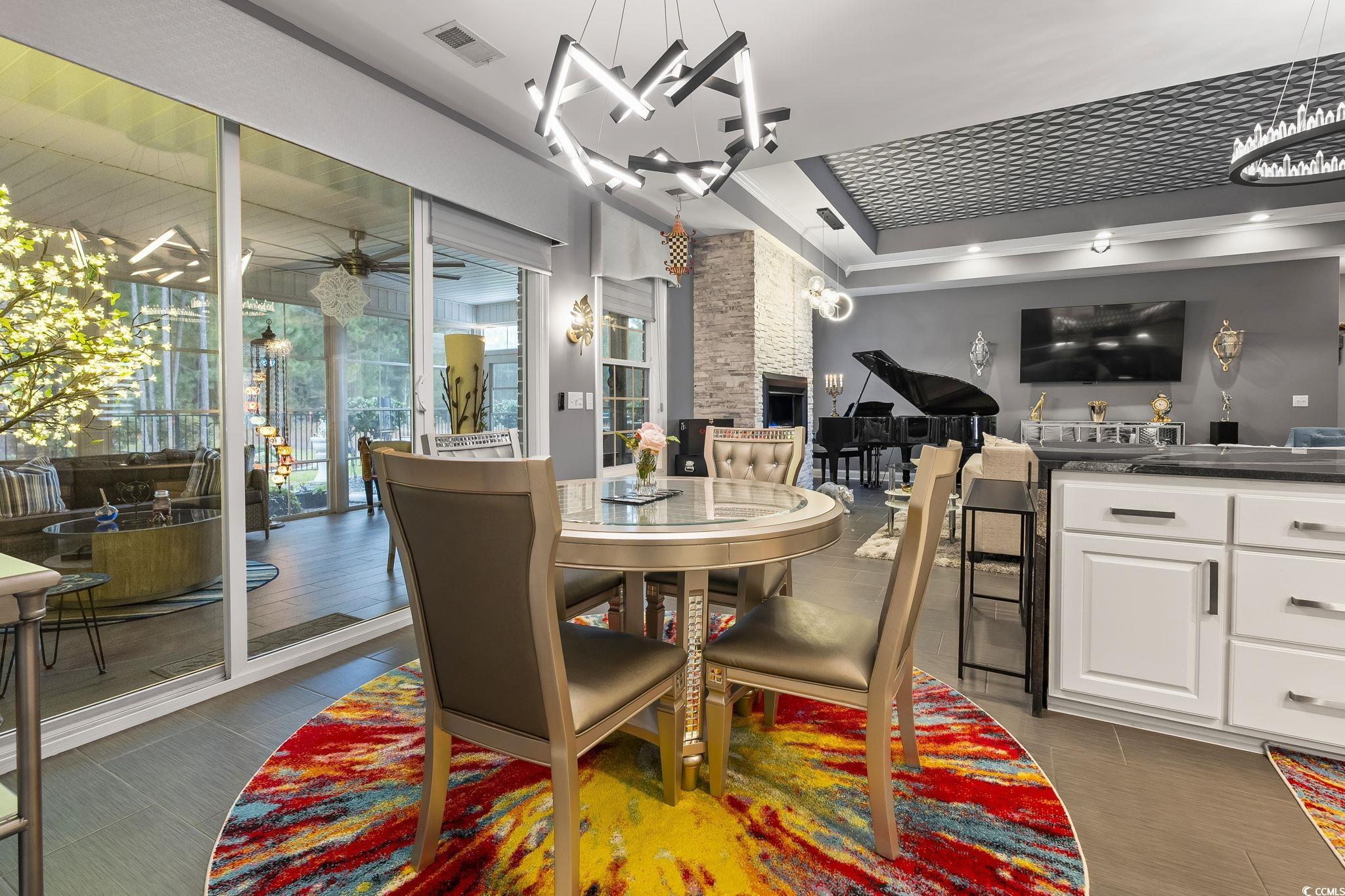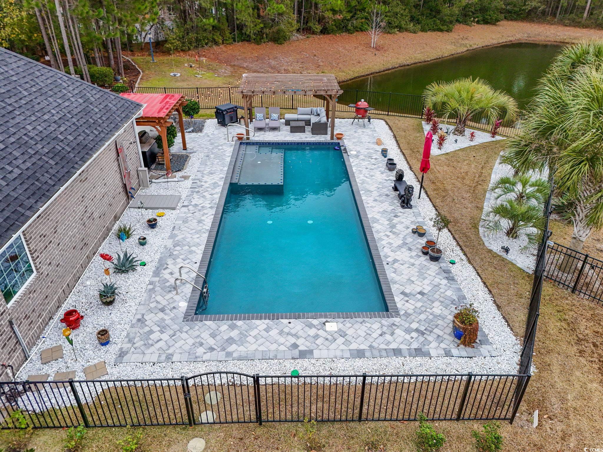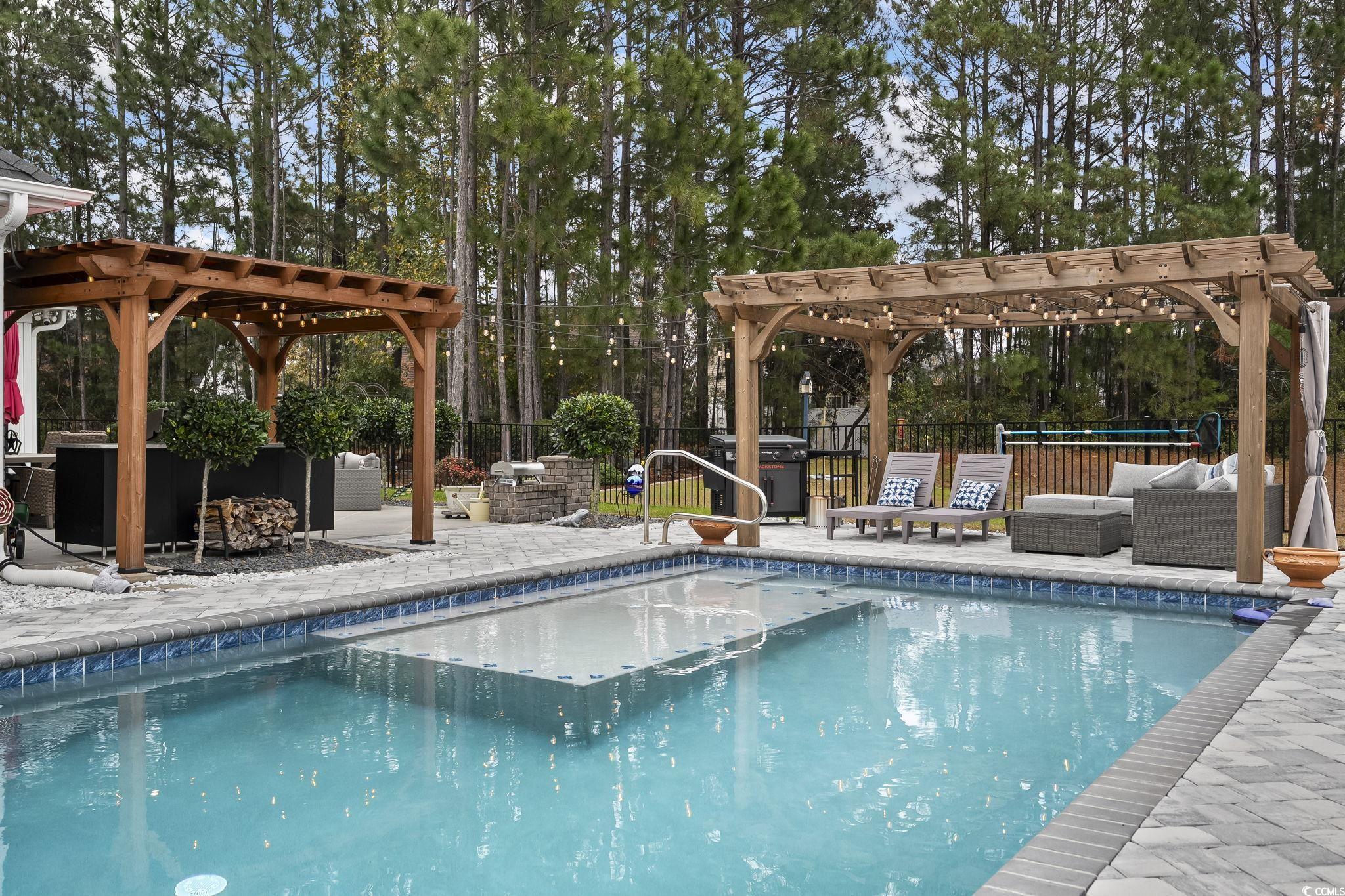 Welcome to a home where luxury, design, and Lowcountry living blend effortlessly. Situated on a beautifully manicured, hardscape-trimmed lot overlooking a tranquil pond, this residence offers elegance both inside and out. Step through the front door into an open layout, anchored by a stunning marble-tile fireplace that creates a warm, contemporary focal point. The chef's kitchen is a true showcase, featuring a dramatic waterfall island, a stainless-steel hammered farm sink, premium LG stainless appliances, and an imported Italian tile backsplash that elevates the entire space. The primary suite is a peaceful retreat with a spa-inspired bathroom complete with custom tilework, a soaking tub, double vanities, and a glass-enclosed shower. The walk-in closet impresses with a unique rotating clothing rack that offers both convenience and exceptional storage. Flexible additional rooms provide space for a guest suite, office, den, and a dedicated theater room. The Carolina Room, enclosed with EZ Breeze panels, is designed for year-round comfort and features an automatic shade closure system on the sliders, perfect for enjoying the outdoors no matter the season. Step outside to your private, fenced backyard resort, complete with a new, 16x40 saltwater glowing in-ground pool, a custom outdoor shower, a pair of wood-beam pergolas wrapped in outdoor string lighting, a fully equipped outdoor kitchen, and a cozy fire pit for evening relaxation. Carefully landscaped garden beds, trimmed with stone hardscaping and outdoor lighting, all backing to a private area and a large pond, which creates a polished, inviting ambiance. Additional upgrades include a Rinnai tankless water heater, an ADT security system, Google Home cameras, custom window treatments throughout, and hurricane-rated windows. Every detail has been thoughtfully curated to provide indoor elegance, outdoor luxury, and amenities that enhance everyday living. Come take a look at your new home.